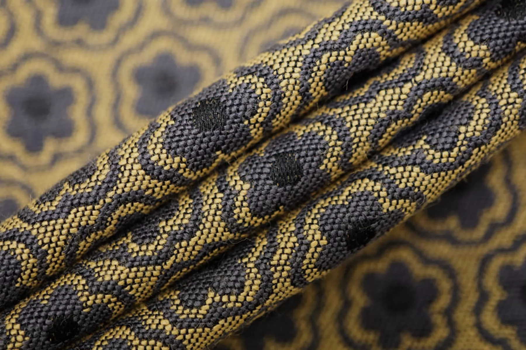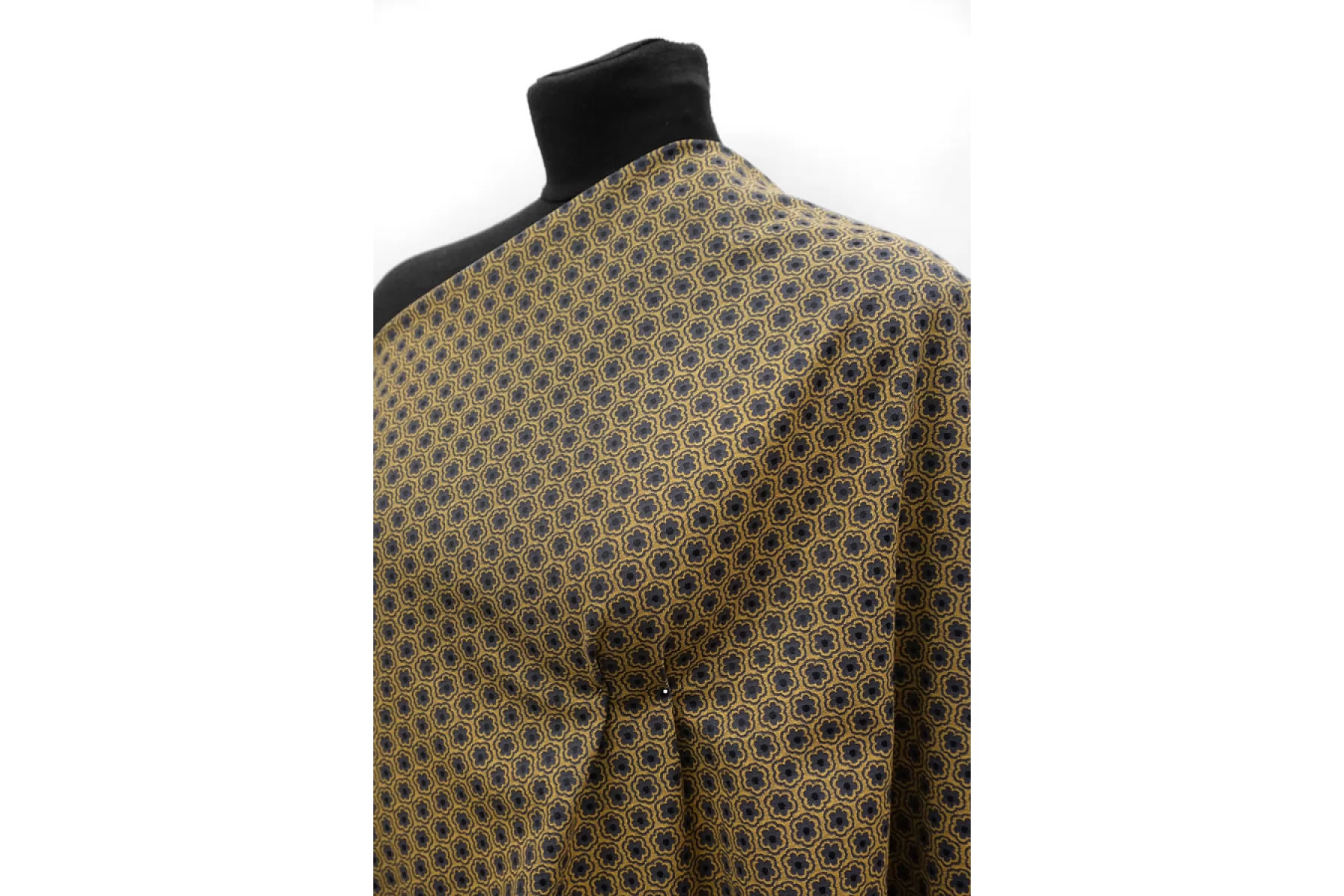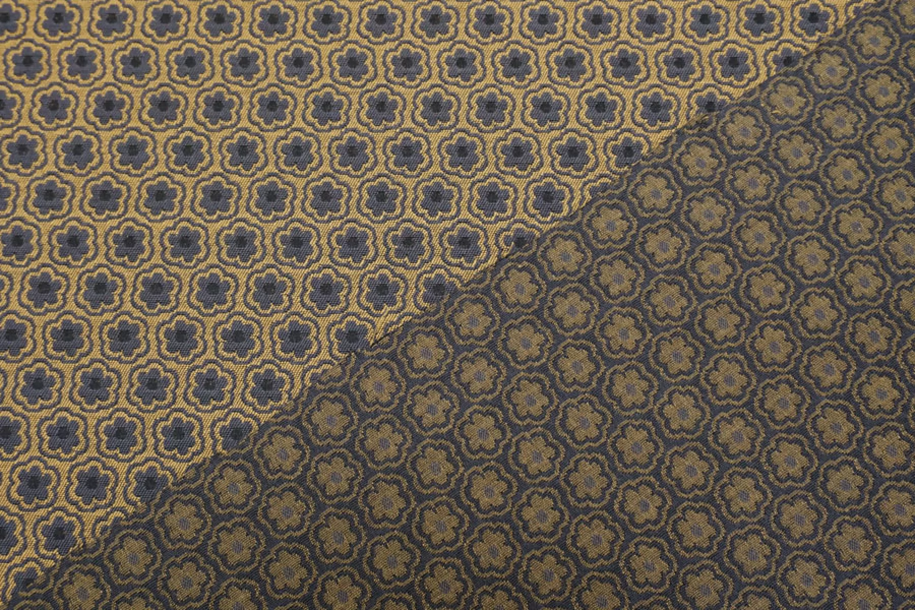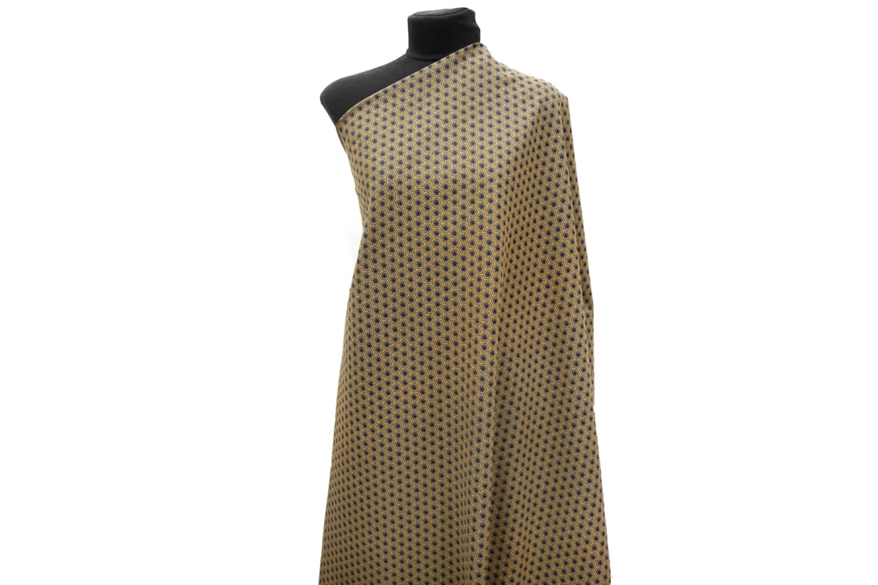 Костюмно-плательный хлопковый жаккард со стилизованным цветочным узором, из нитей бежевого, тёмного серо-синего и чёрного цвета. Пластичный но при этом держит форму, хорошо тянется. Не просвечивает, сминается, но восстанавливается. Подойдет на платья, жакеты мягкой формы, юбки, брюки.