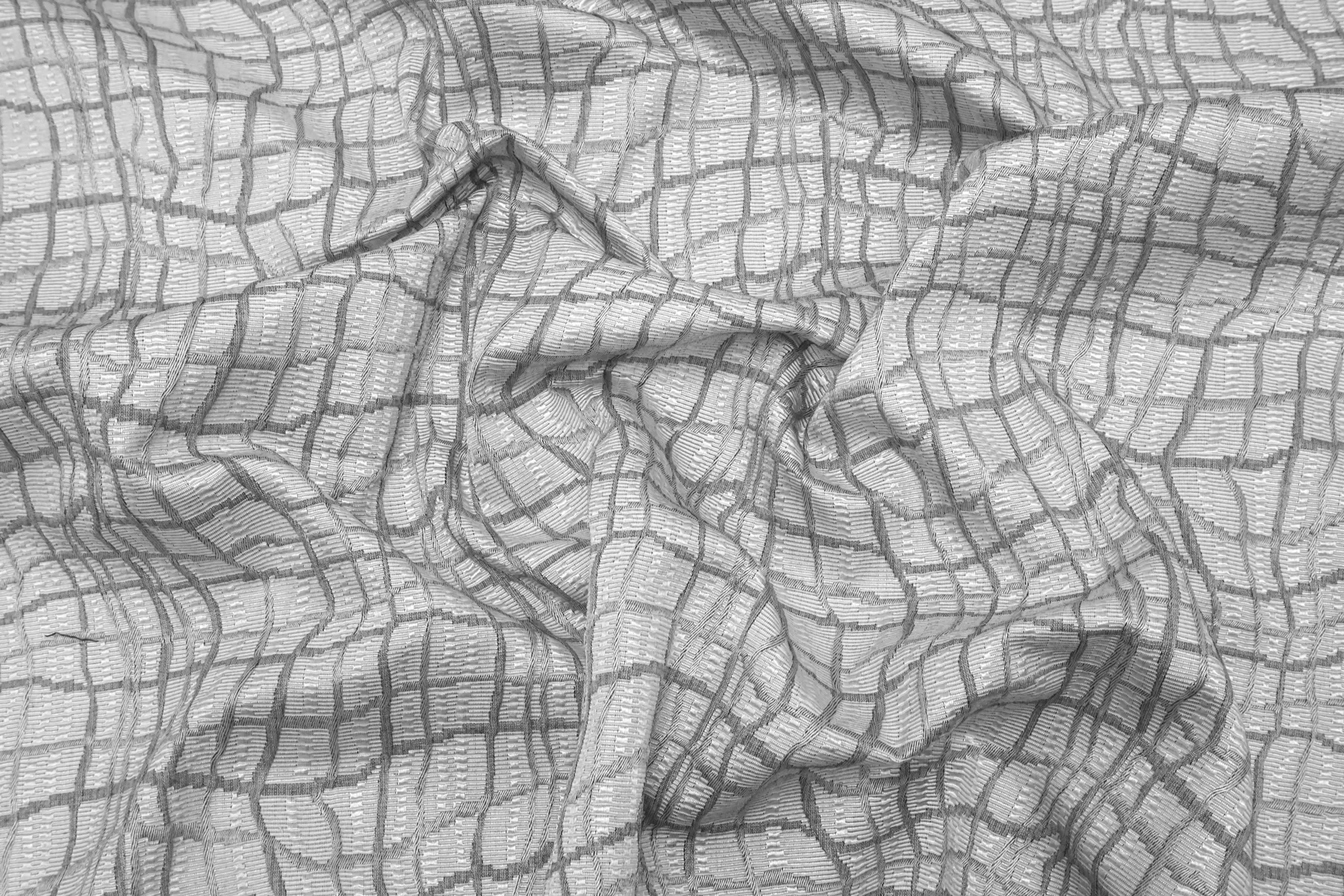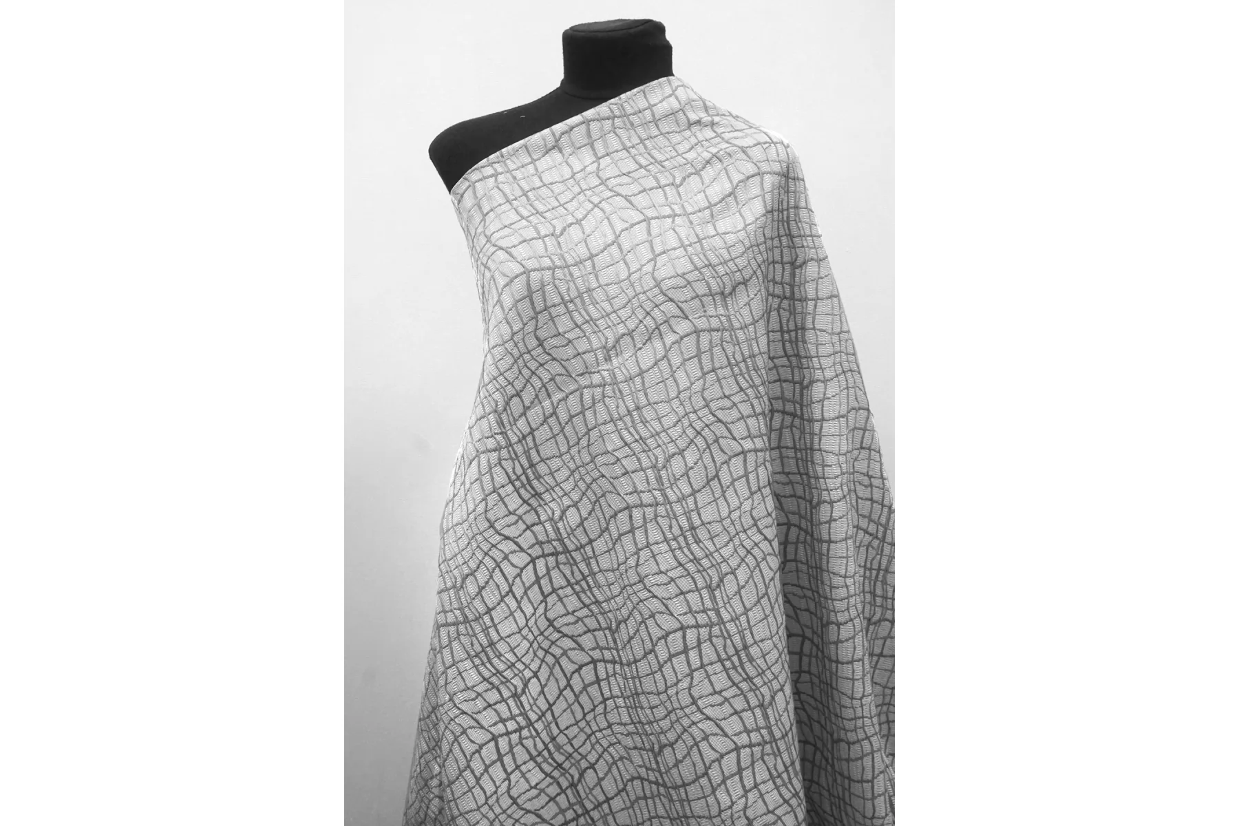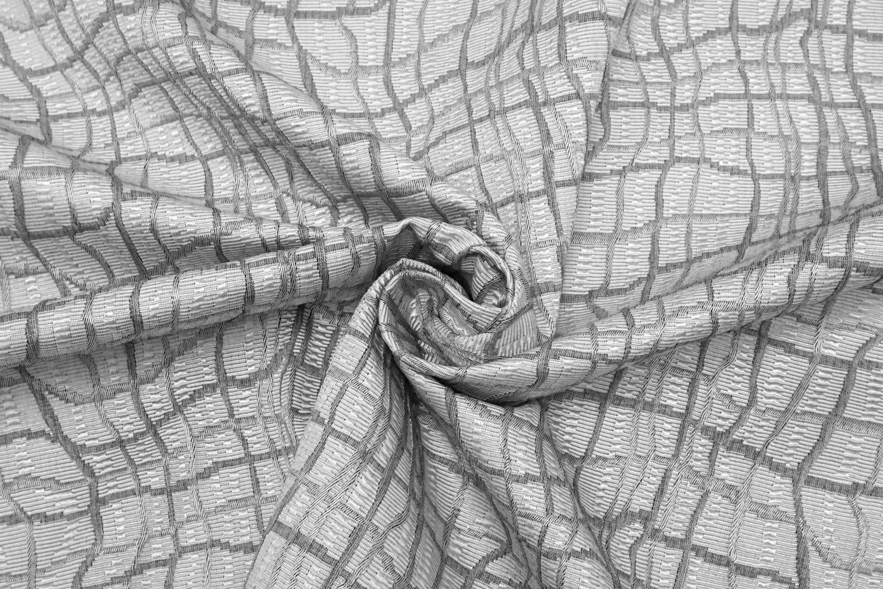 Жаккард из нитей белого и чёрного цвета, с фактурным выпуклым узором. Тактильно фактурность ощущается. Не просвечивает. Плетение слегка растягивается. Пластичный но при этом держит форму. Шьем жакеты, платья, юбки и другие варианты.