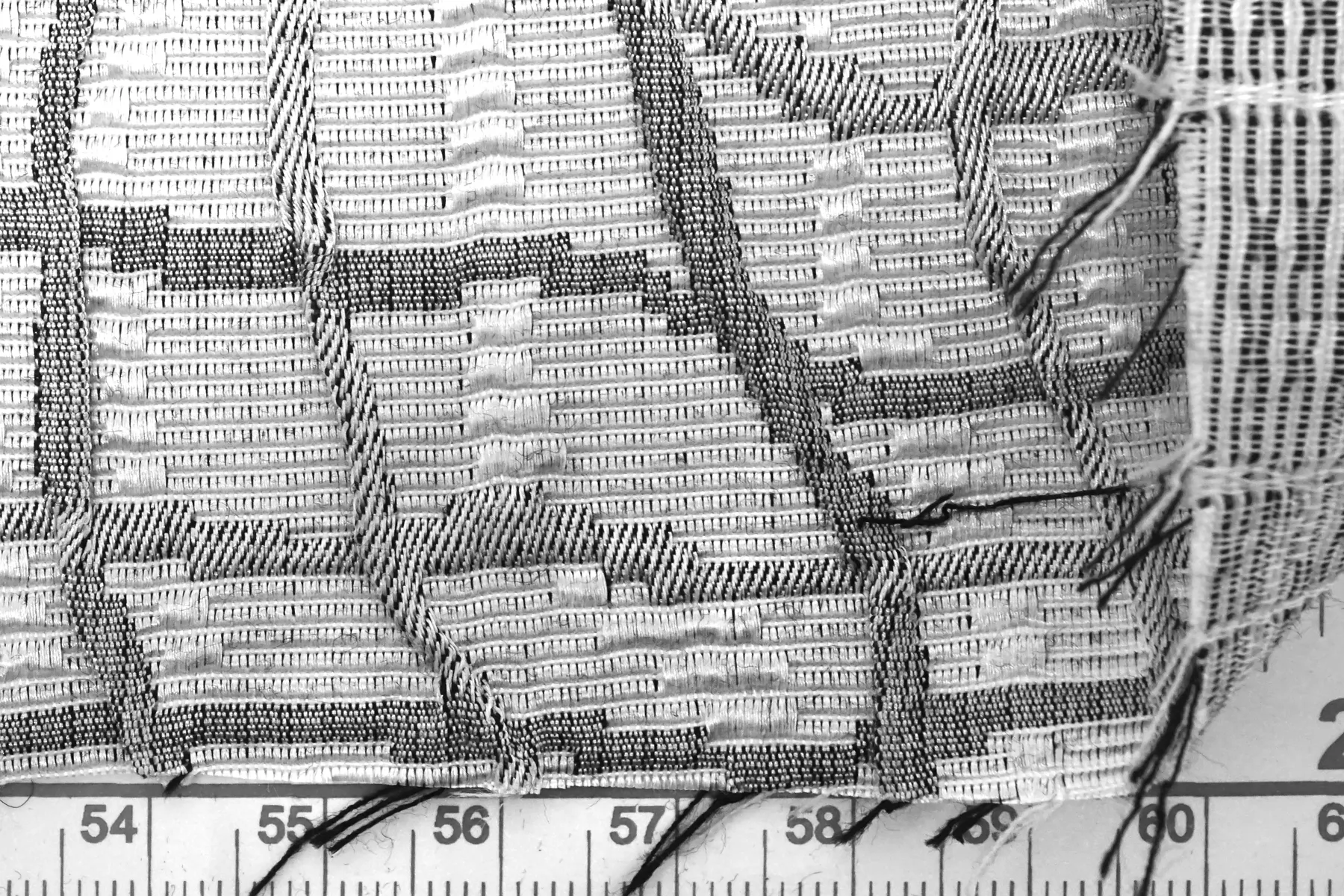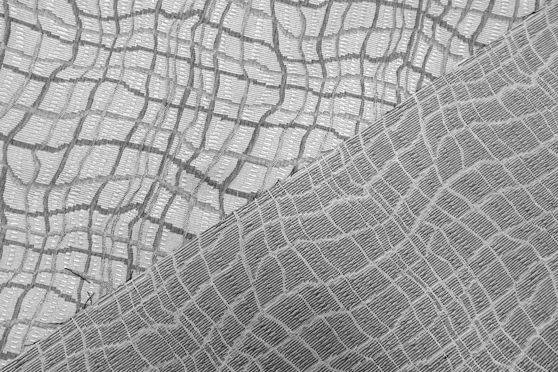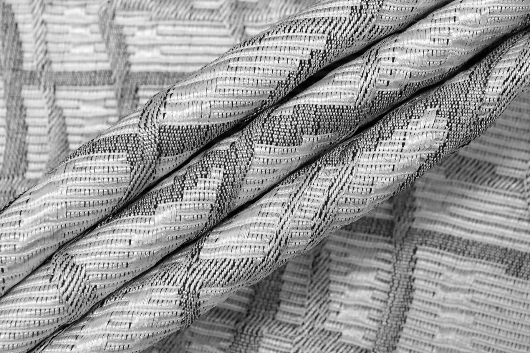 Жаккард из нитей белого и чёрного цвета, с фактурным выпуклым узором. Тактильно фактурность ощущается. Не просвечивает. Плетение слегка растягивается. Пластичный но при этом держит форму. Шьем жакеты, платья, юбки и другие варианты.
