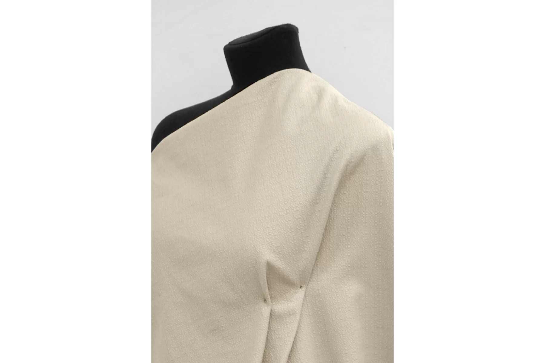 Жаккардовый хлопок в ненасыщенном серо-бежевом цвете. Материал костюмной плотности, держит форму, тактильно рельефный. Немного мнется, не тянется, не просвечивает. Отлично подойдет для пошива летних костюмов, жакетов в стиле шанель, платьев и юбок.