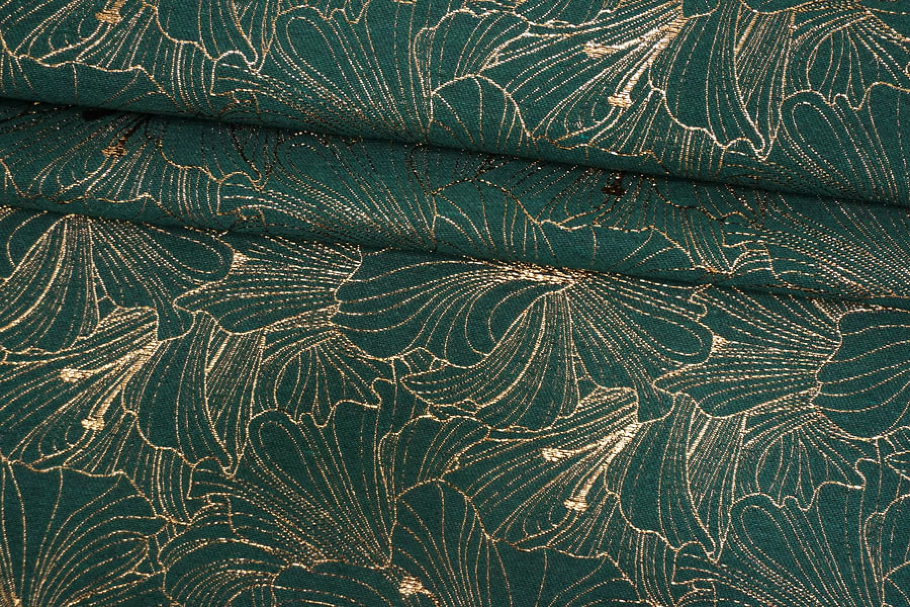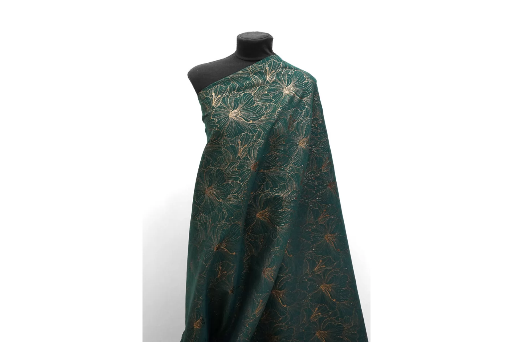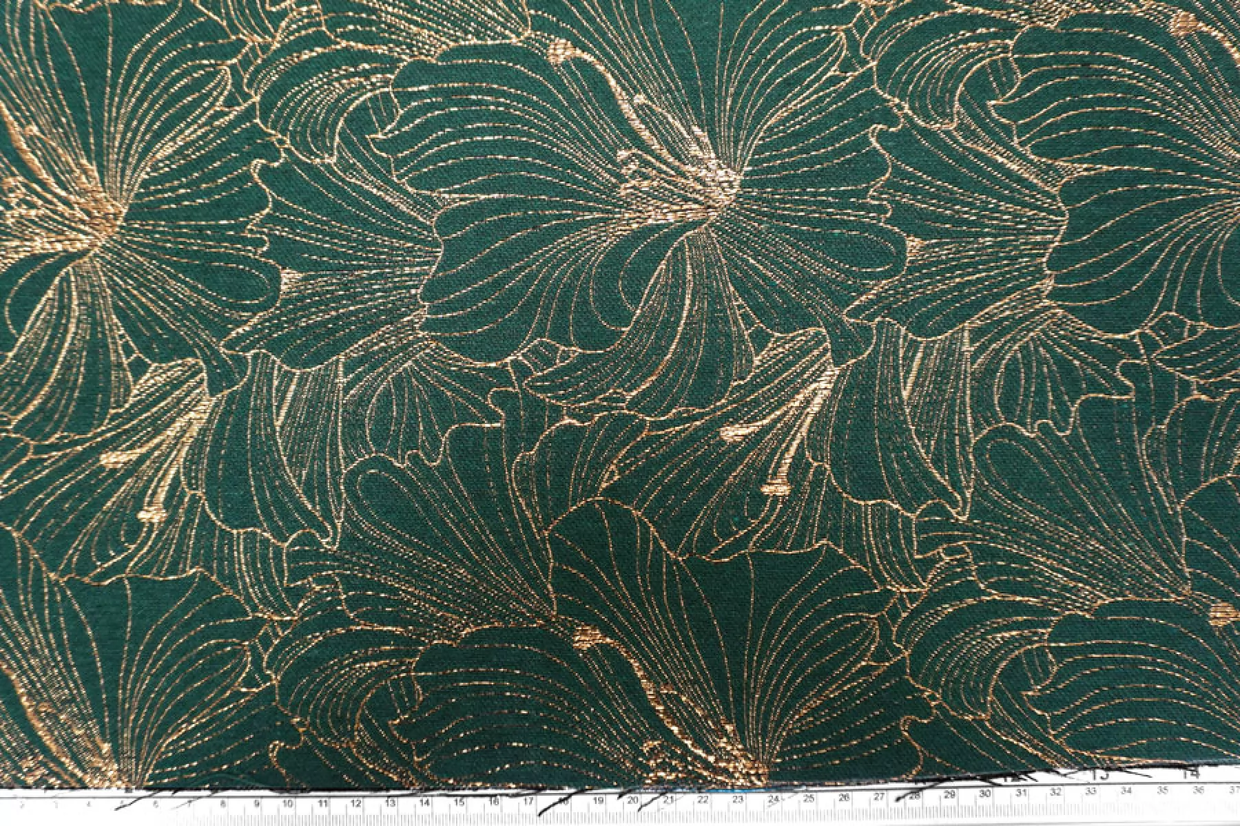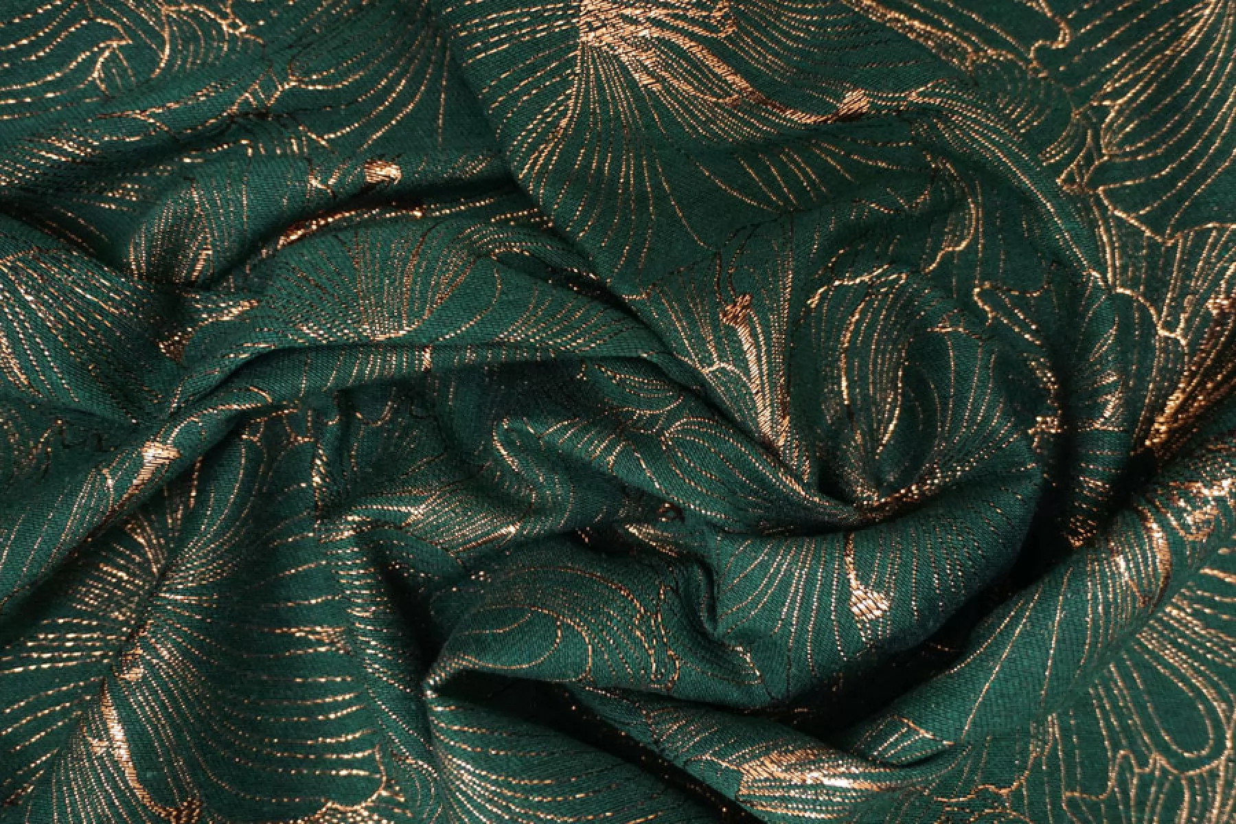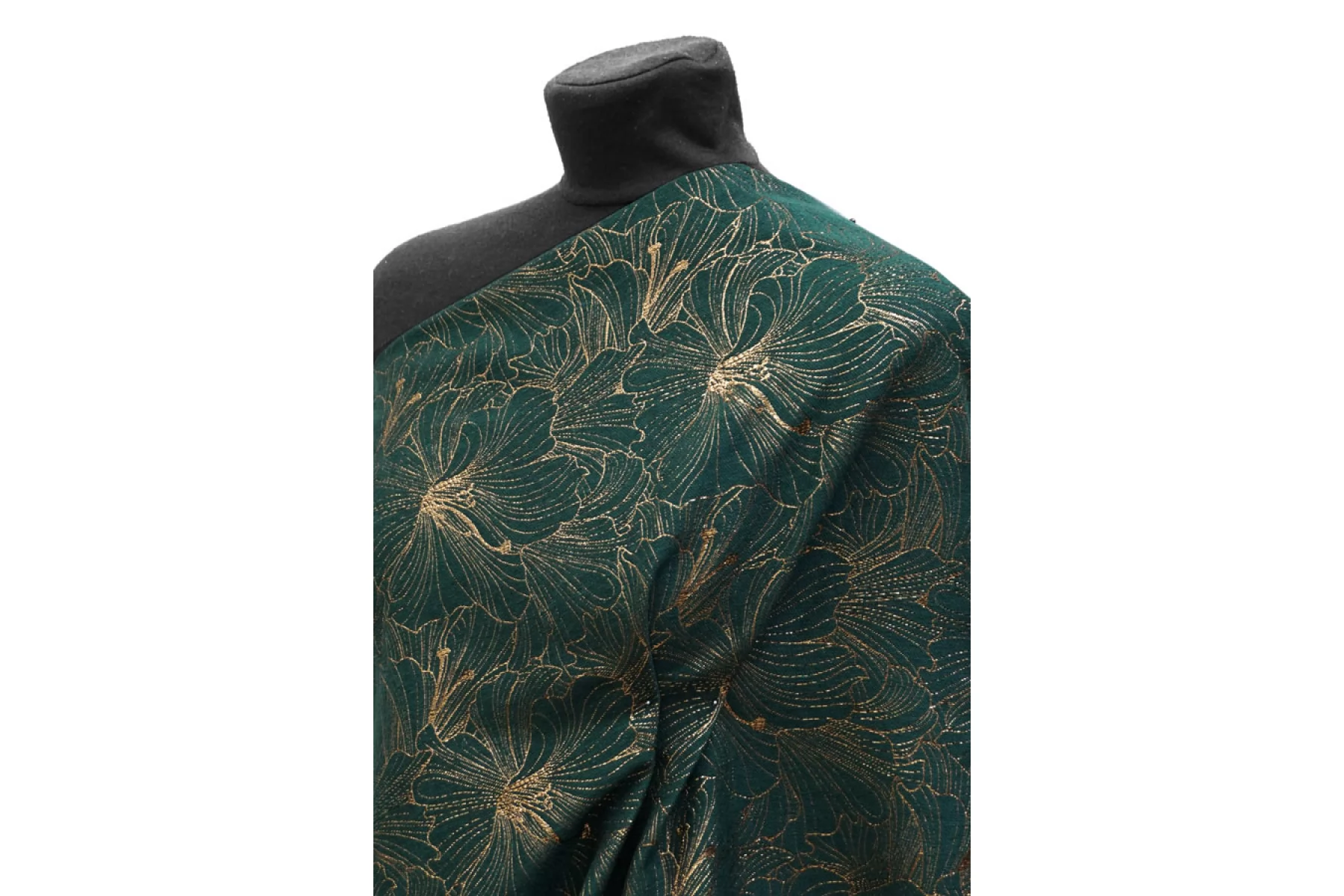 Шикарный хлопковый жаккард костюмной плотности темно зеленого цвета с золотистым люрксом образующим цветочный узор крупного размера. Можно использовать две стороны. Материал тактильно шероховатый, плотненький, но тонкий, пластичный. Не тянется, не просвечивает. Красиво смотрится в драпировках. Держит форму. Шьем нарядные жакеты, платья, юбки и другие варианты.