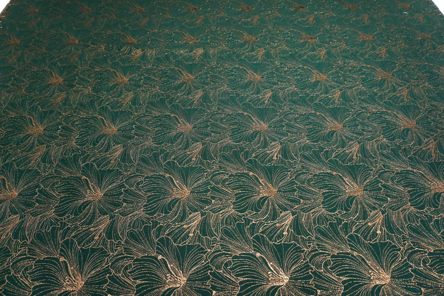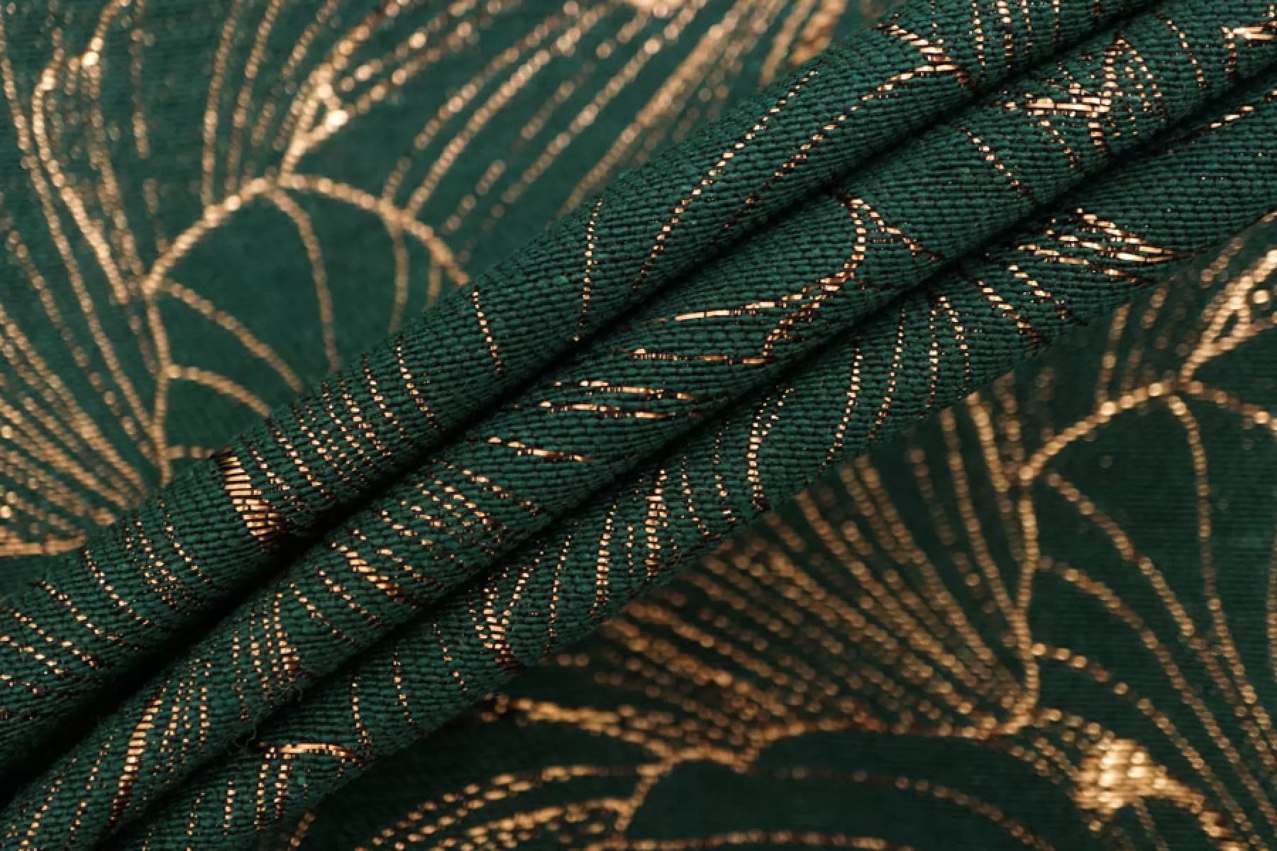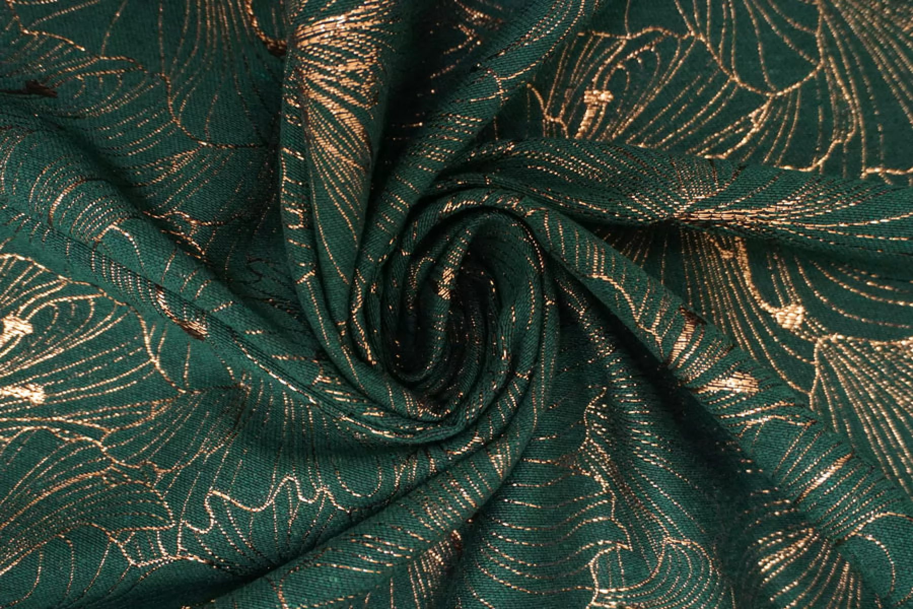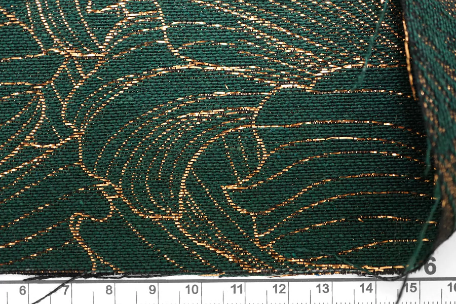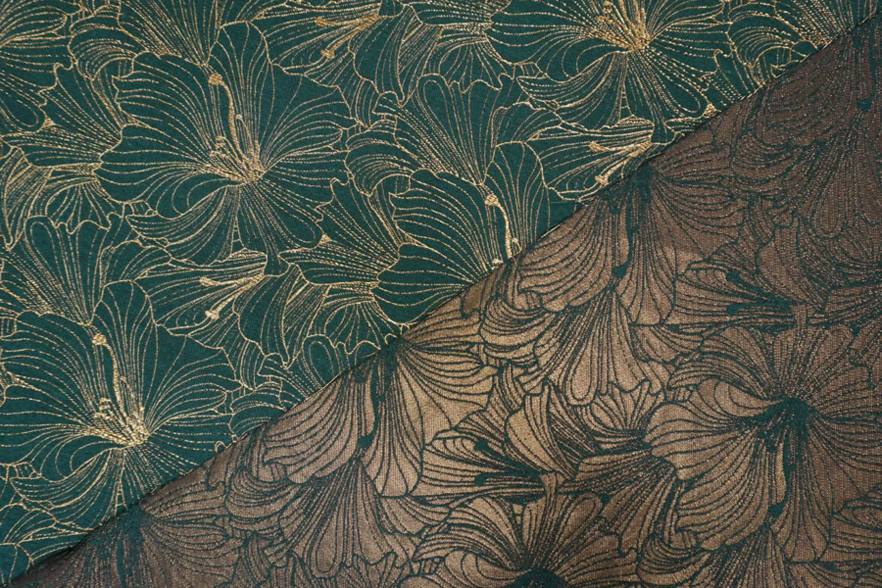 Шикарный хлопковый жаккард костюмной плотности темно зеленого цвета с золотистым люрксом образующим цветочный узор крупного размера. Можно использовать две стороны. Материал тактильно шероховатый, плотненький, но тонкий, пластичный. Не тянется, не просвечивает. Красиво смотрится в драпировках. Держит форму. Шьем нарядные жакеты, платья, юбки и другие варианты.