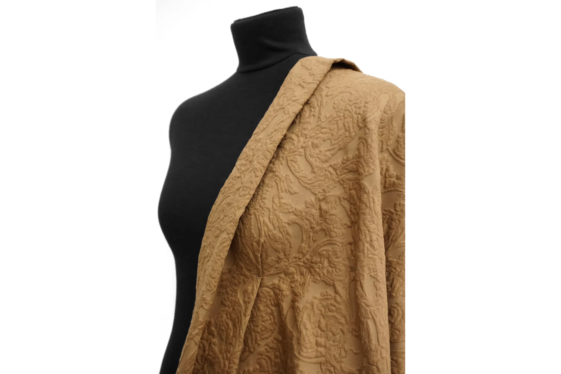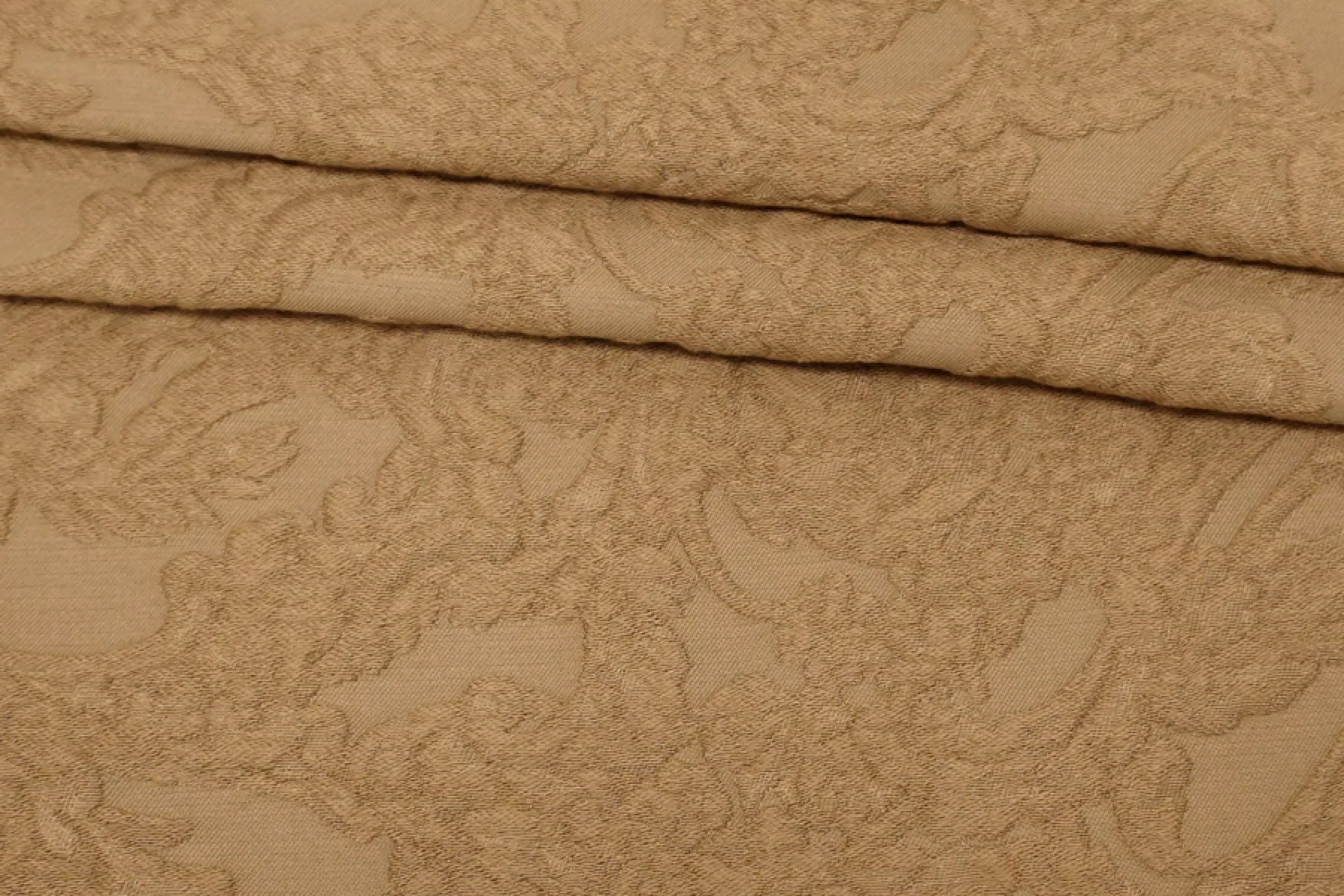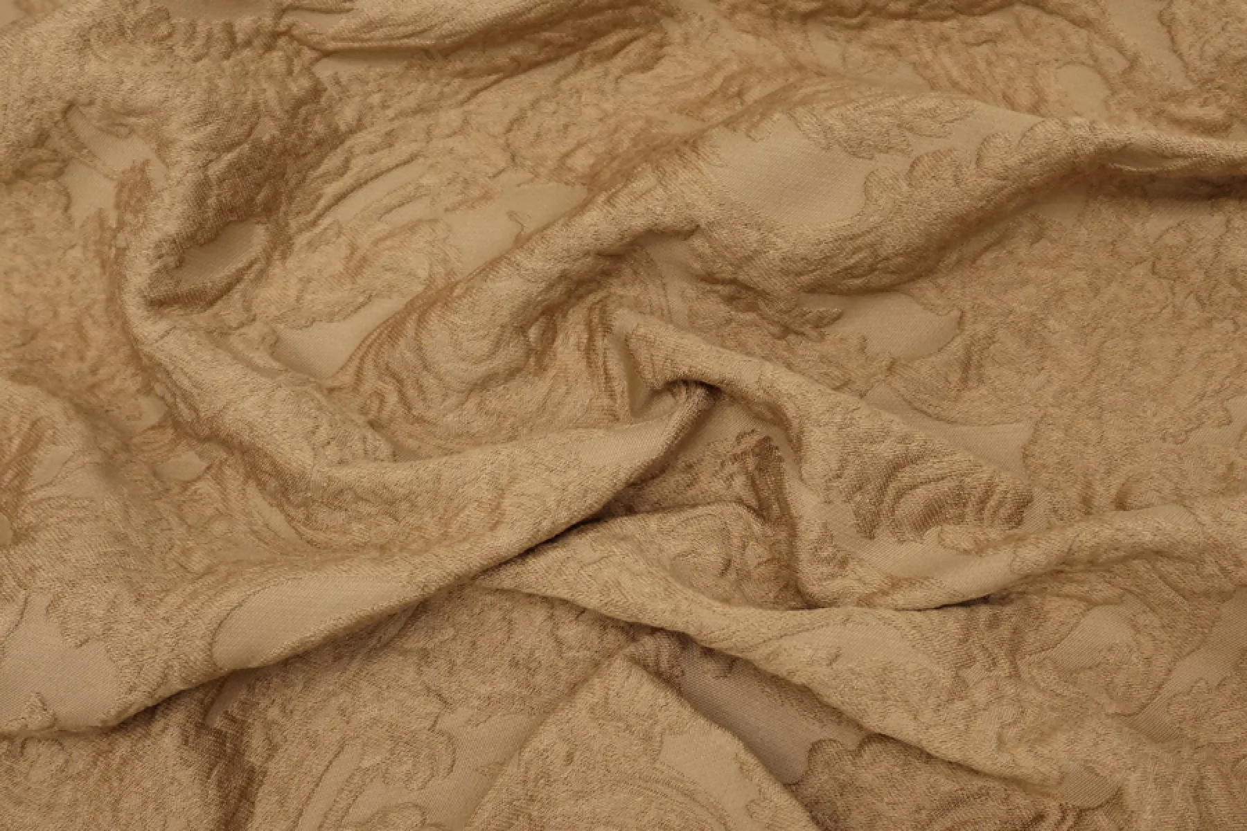 Хлопковый жаккард костюмно-плательной плотности отличного качества темно-бежевого цвета с выработкой ввиде довольно крупного орнамента. Тактильно приятный, мягкий, ощущается фактура, которую образует переплетение нитей как тонких, так и объемных. Материал плотный. Отлично держит форму. Не тянется и не просвечивает. Не мнется. Прекрасный вариант на бомберы, жакеты, юбки и костюмные варианты.