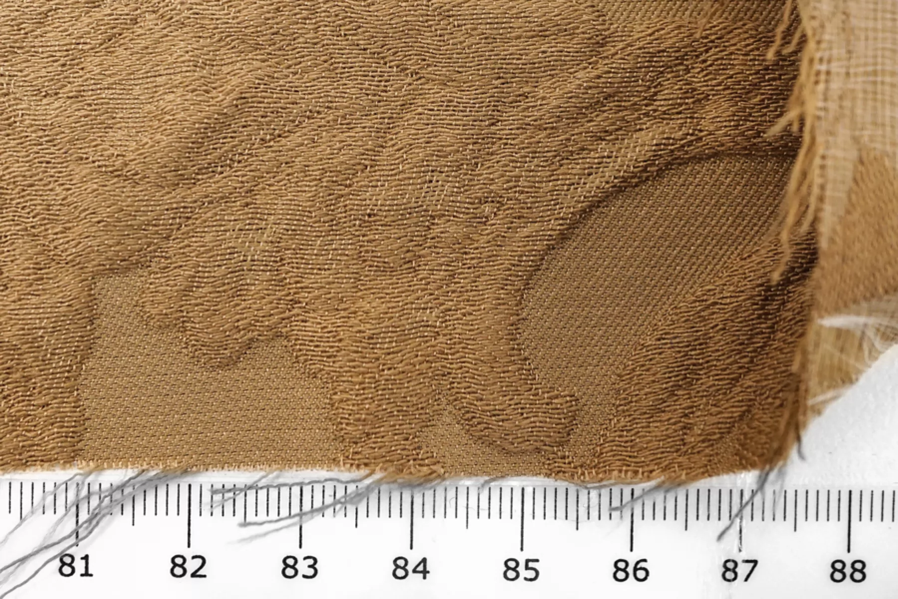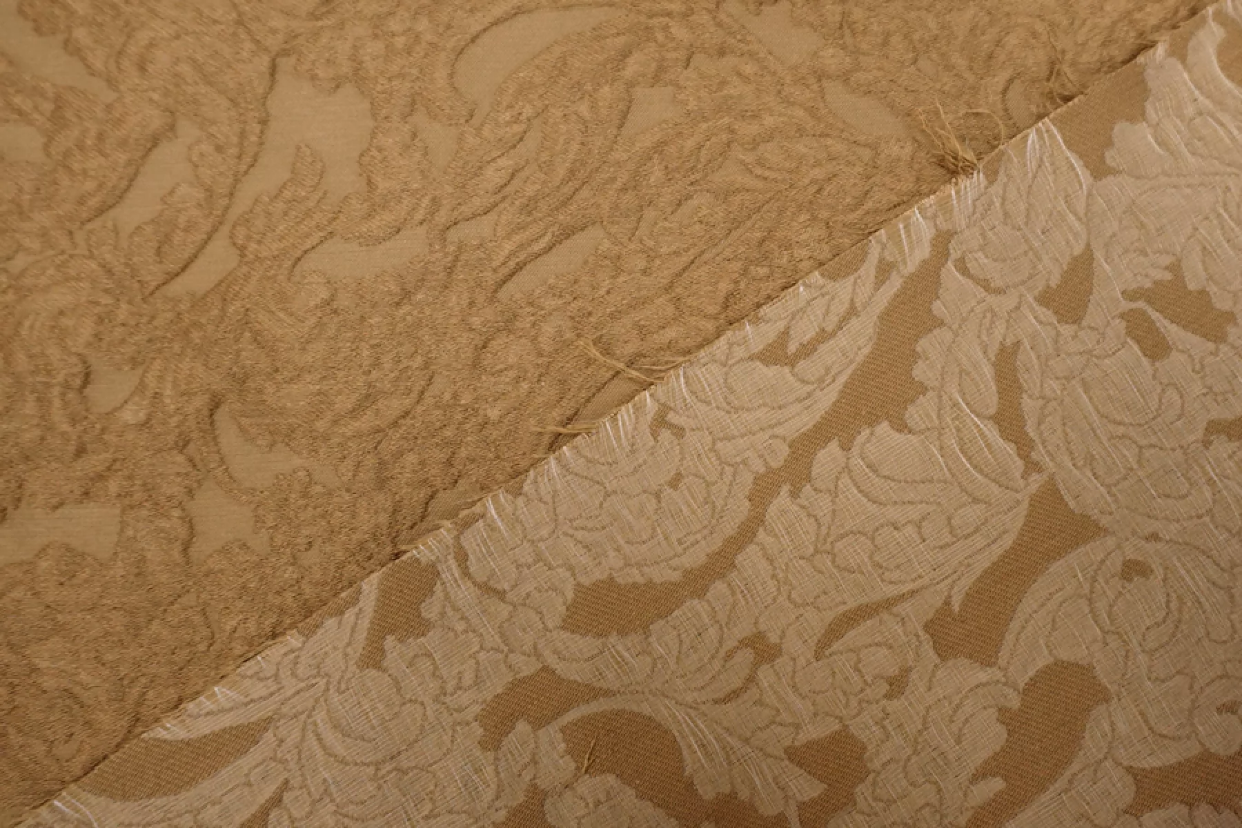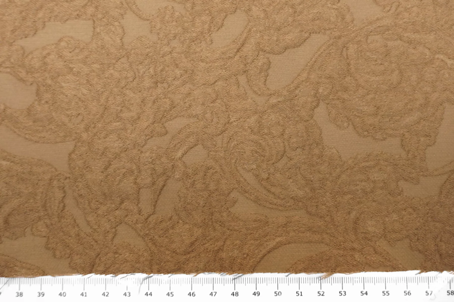 Хлопковый жаккард костюмно-плательной плотности отличного качества темно-бежевого цвета с выработкой ввиде довольно крупного орнамента. Тактильно приятный, мягкий, ощущается фактура, которую образует переплетение нитей как тонких, так и объемных. Материал плотный. Отлично держит форму. Не тянется и не просвечивает. Не мнется. Прекрасный вариант на бомберы, жакеты, юбки и костюмные варианты.