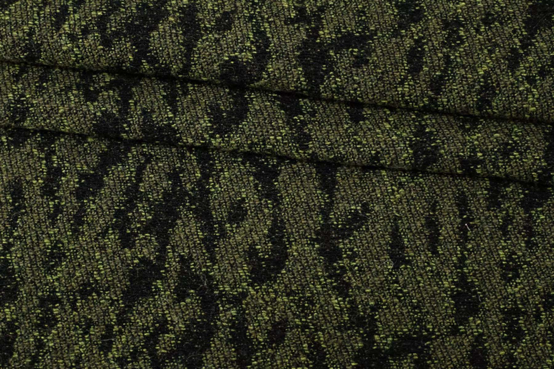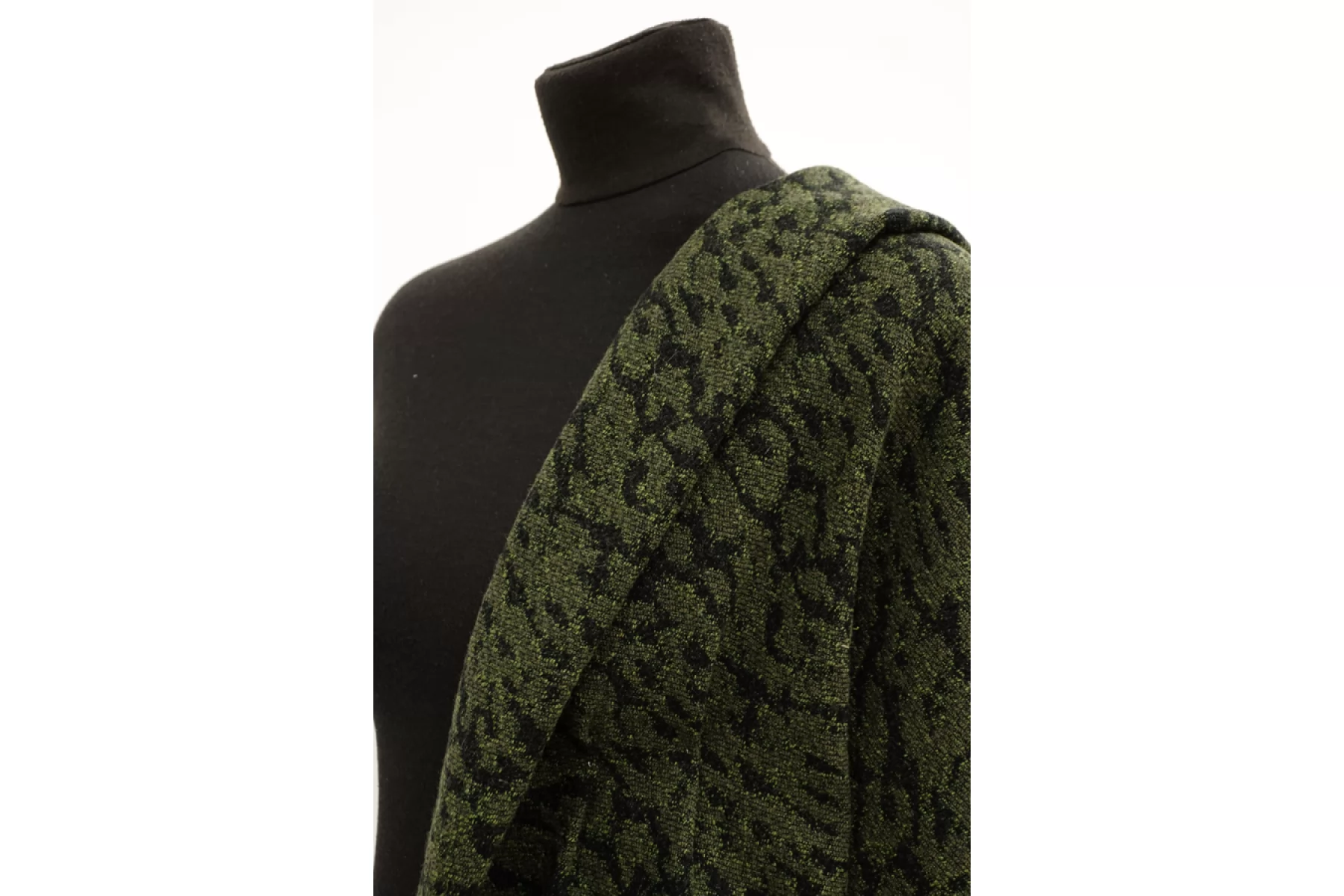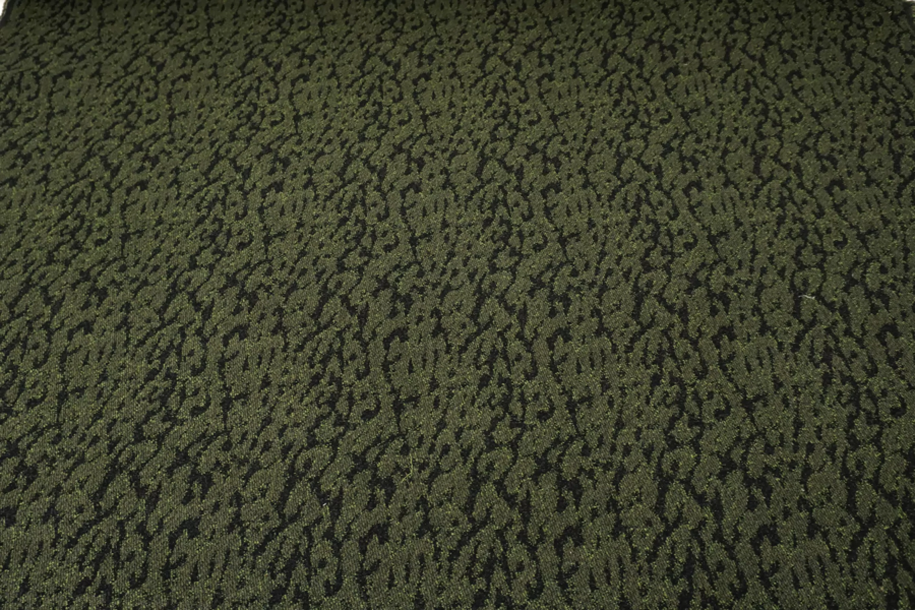 Интересный хлопковый жаккард с небольшой добавкой шерсти, леопардовый узор. Черные нити - хлопок, зеленые - шерсть с акрилом. Держит форму, не просвечивает, не тянется. Тактильно немного суховатый. Подойдет на костюмные варианты, теплые юбки, при желании можно сшить нестандартный бомбер.