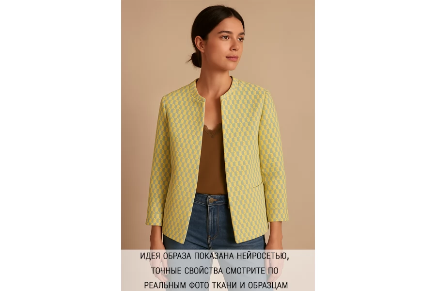 Прекрасный жаккард из хлопка и вискозы, геометрический узор из нитей жёлтого и блёкло-мятного цвета. Мягкий, очень приятно тактильно. Пластичный, не тянется. Просвечивает минимально, в изделии заметно не будет. Подойдет для пошива платья, рубашки, костюма мягкой формы в пижамном стиле.
