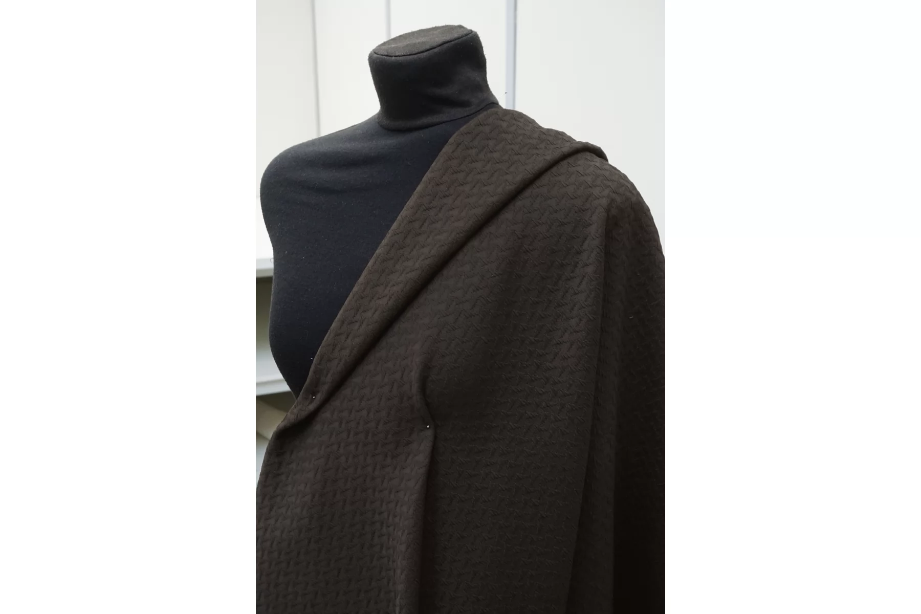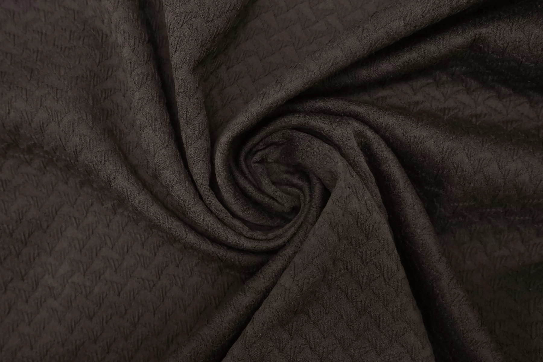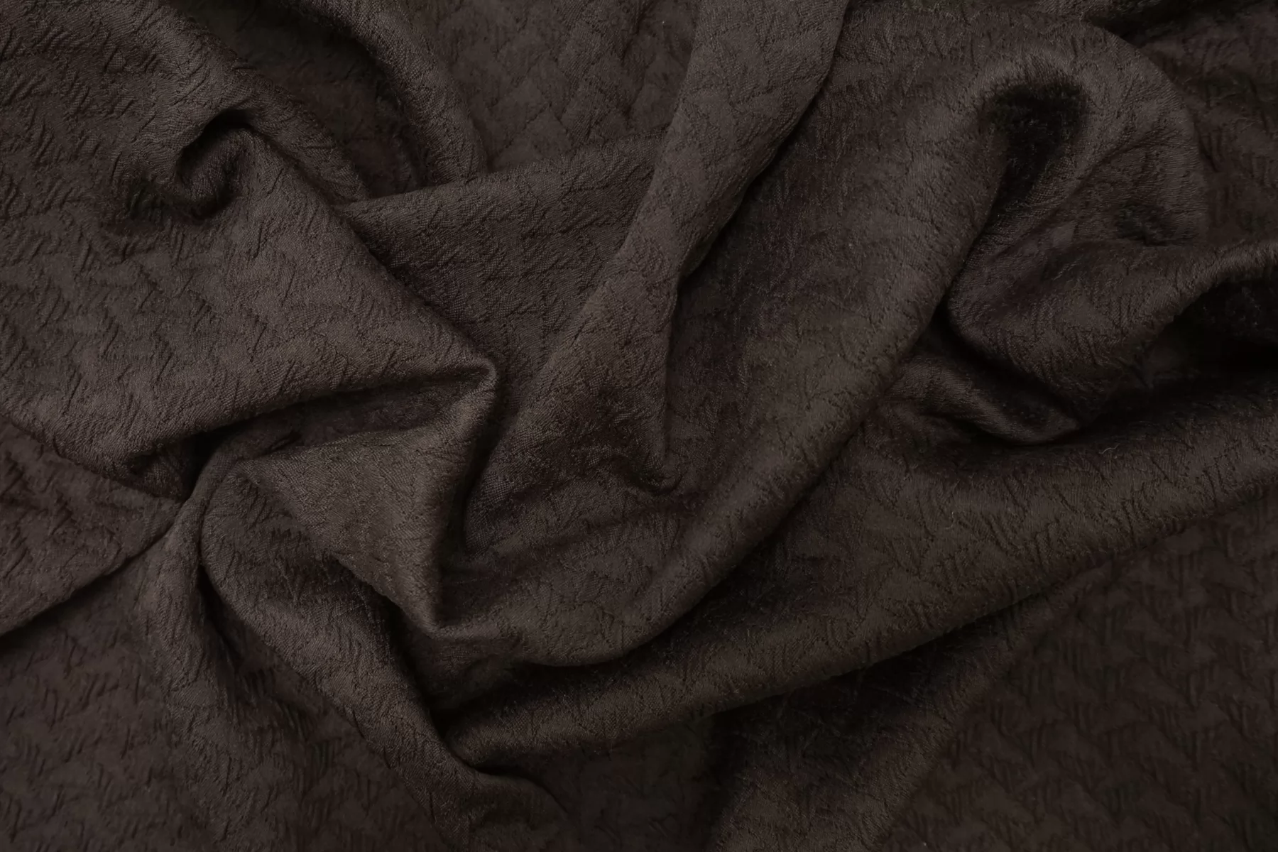 Жаккардовый хлопок костюмной плотности, цвет тёмный коричневый. Не просвечивает, тянется, пластичный. Форму держит. Подойдет для пошива пиджака, юбки, платья или костюма.