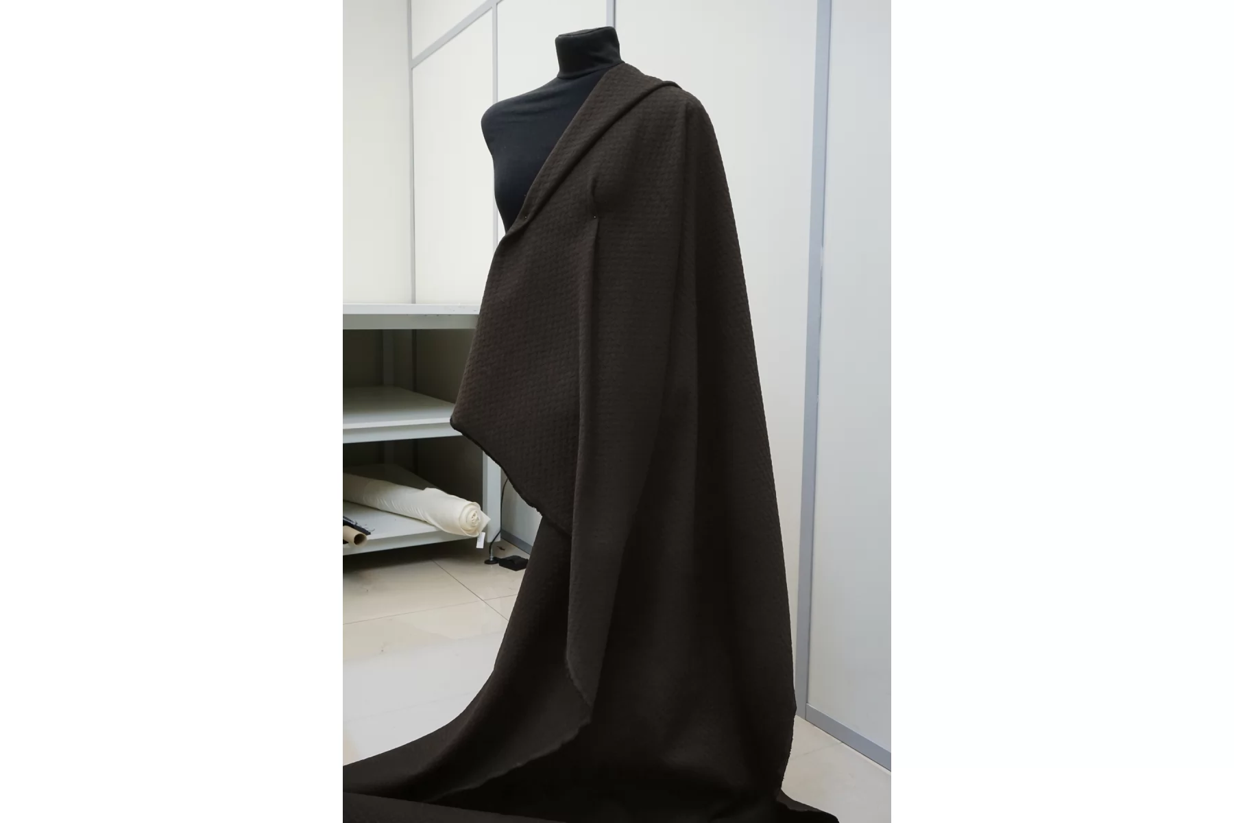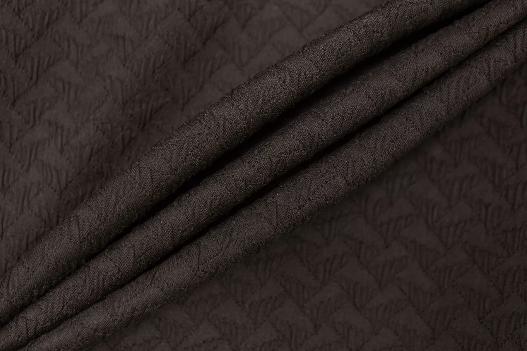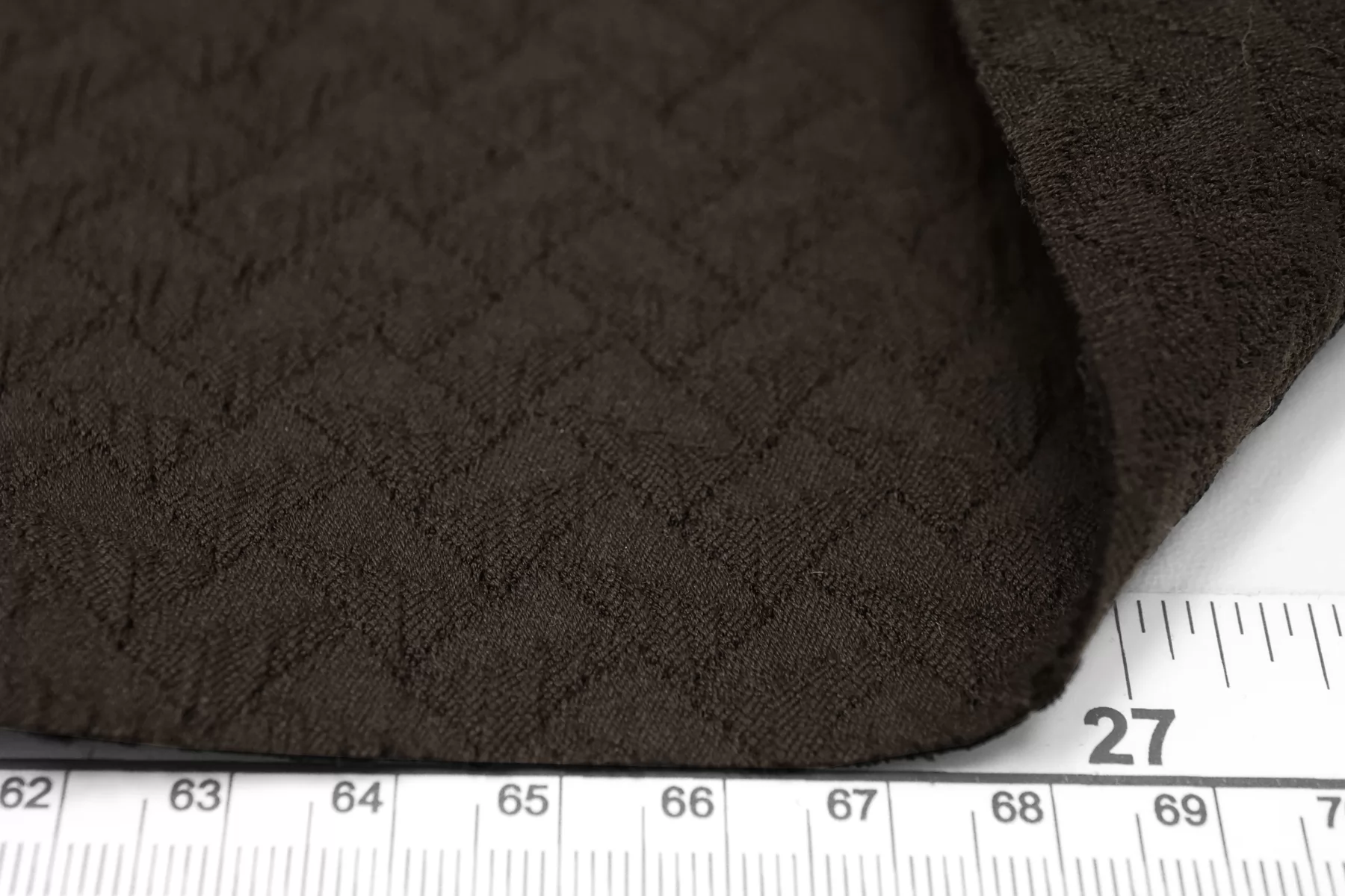 Жаккардовый хлопок костюмной плотности, цвет тёмный коричневый. Не просвечивает, тянется, пластичный. Форму держит. Подойдет для пошива пиджака, юбки, платья или костюма.