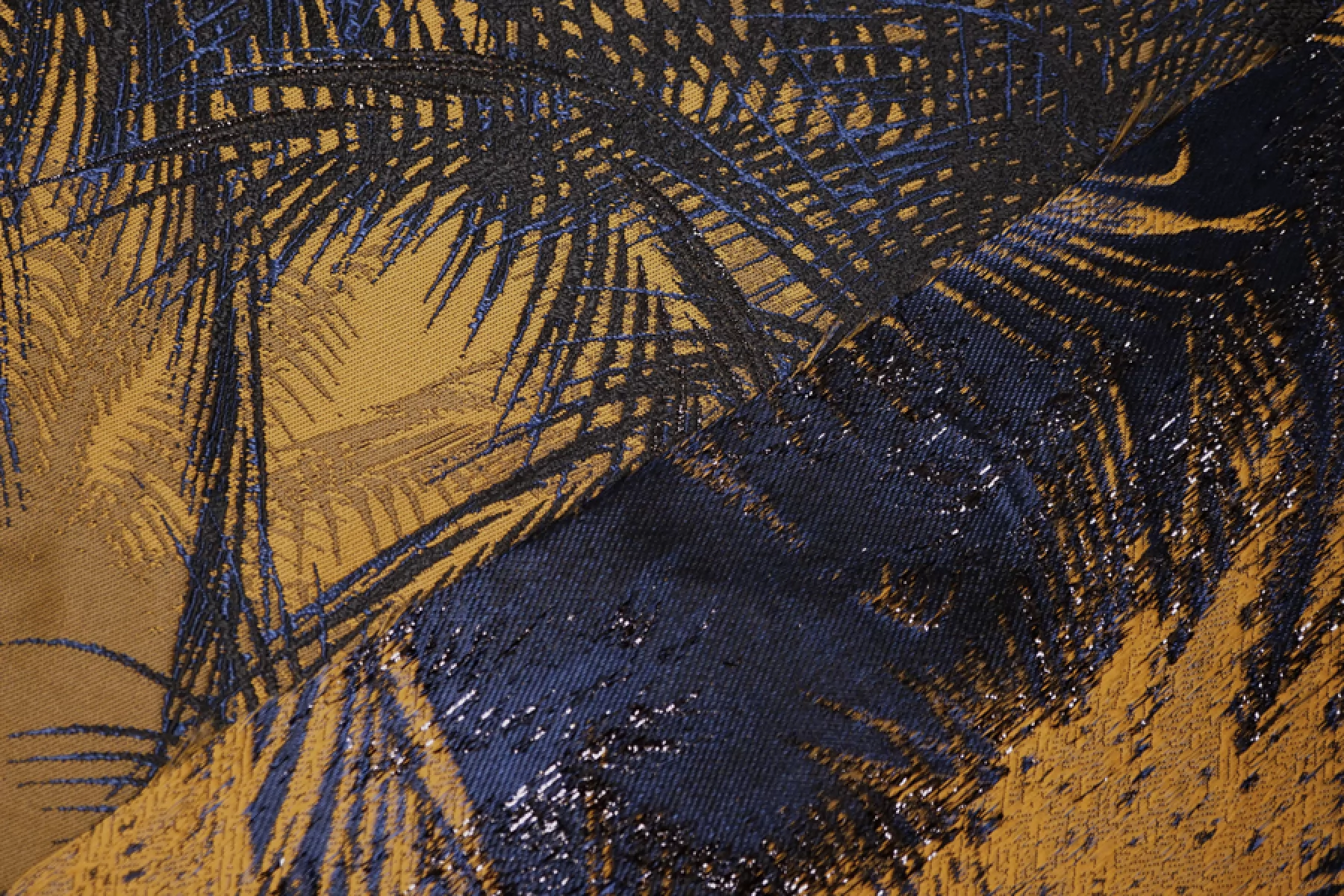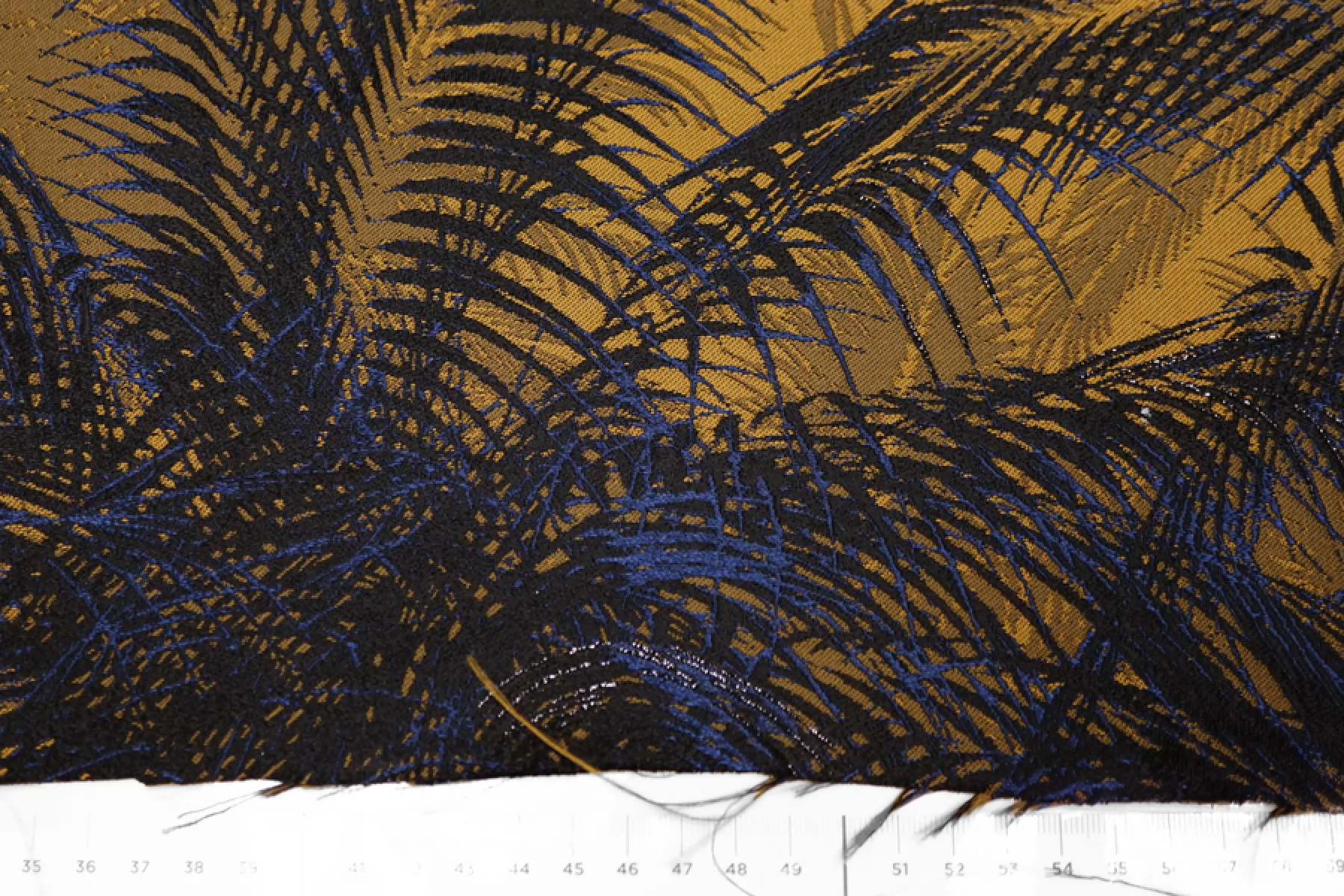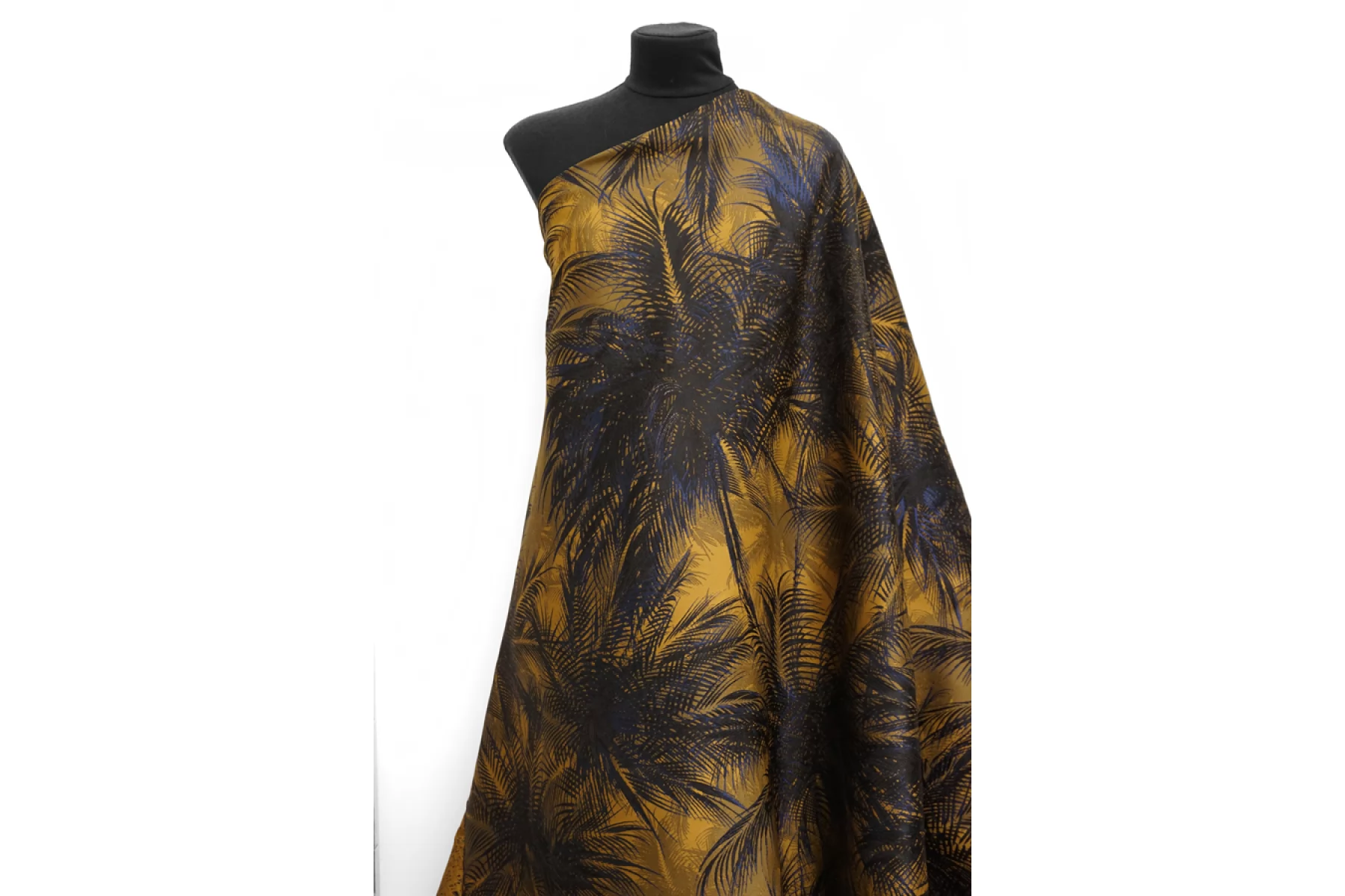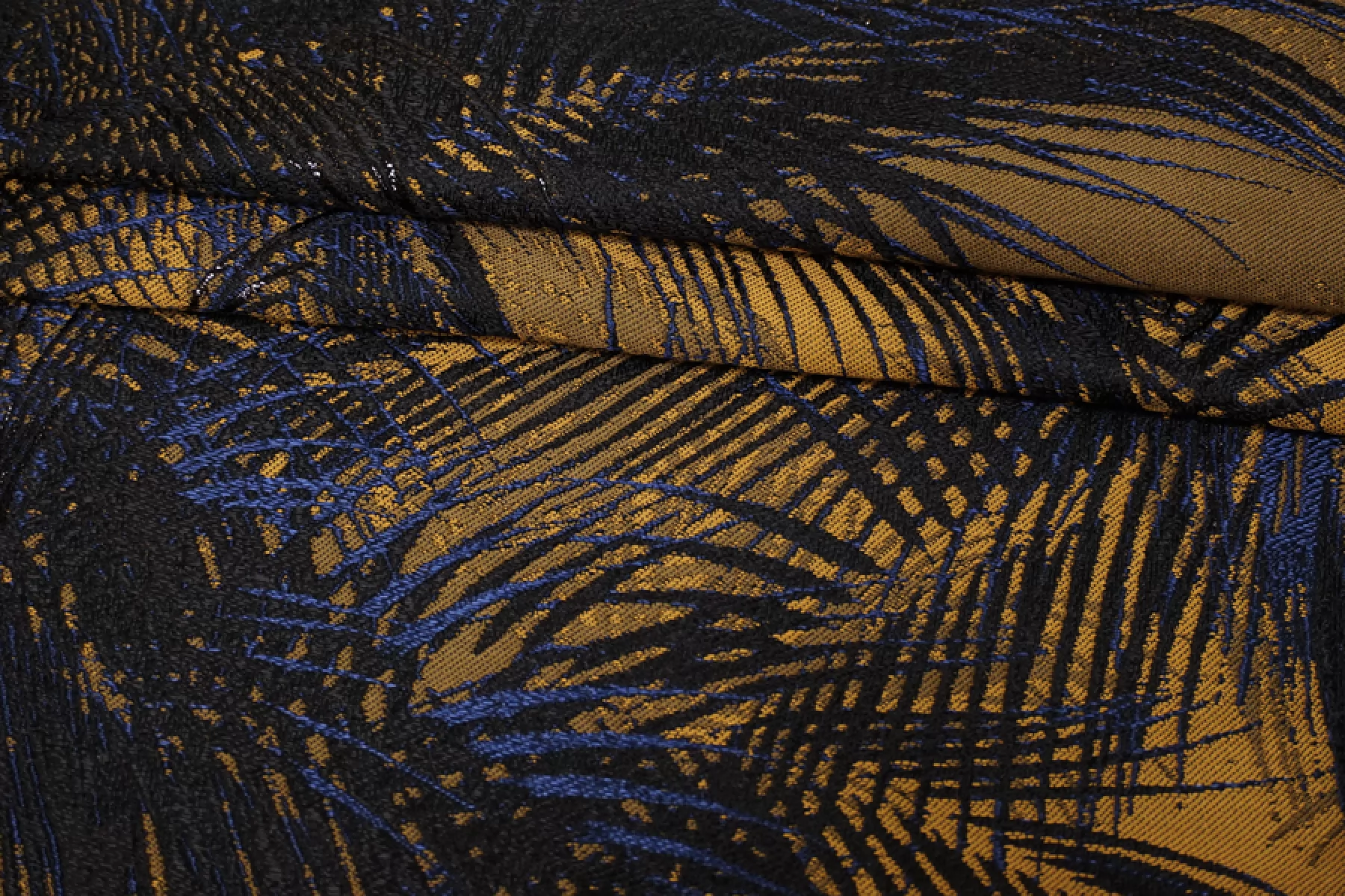 Шикарный костюмно-плательный жаккард с крупным принтом ввиде пальм в синем цвее и приглушенно-горчичном. Блестящий, гладкий, чувствуется нить люрекса. Держит хорошо форму,с "эффектом памяти",не тянется, не светит,хорошая пластика,сминаемость есть, но быстро разглаживается. Отлично подойдет на всю костюмно-плательную группу: платье,юбка,брюки,жакет,шорты.