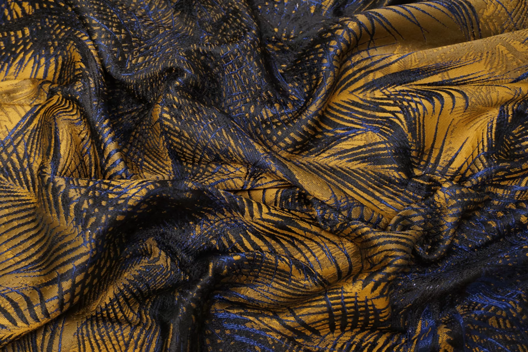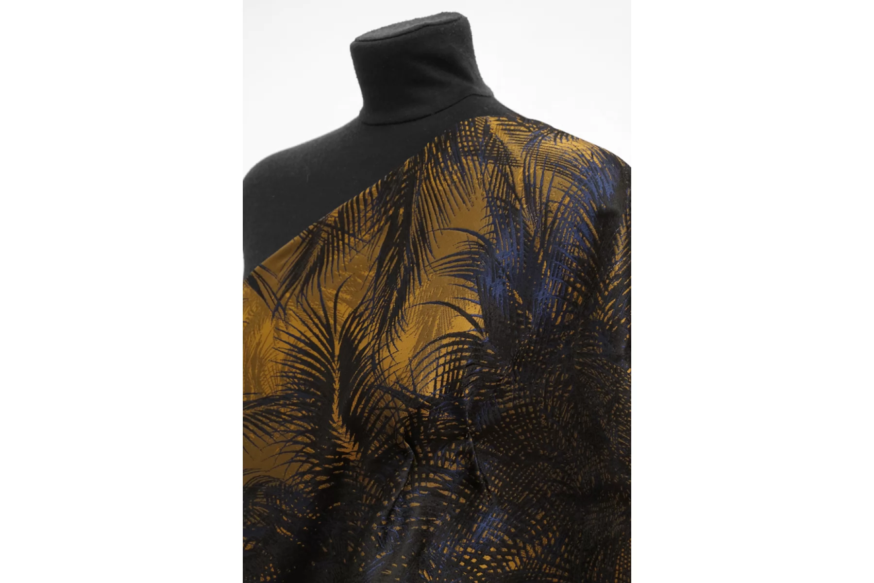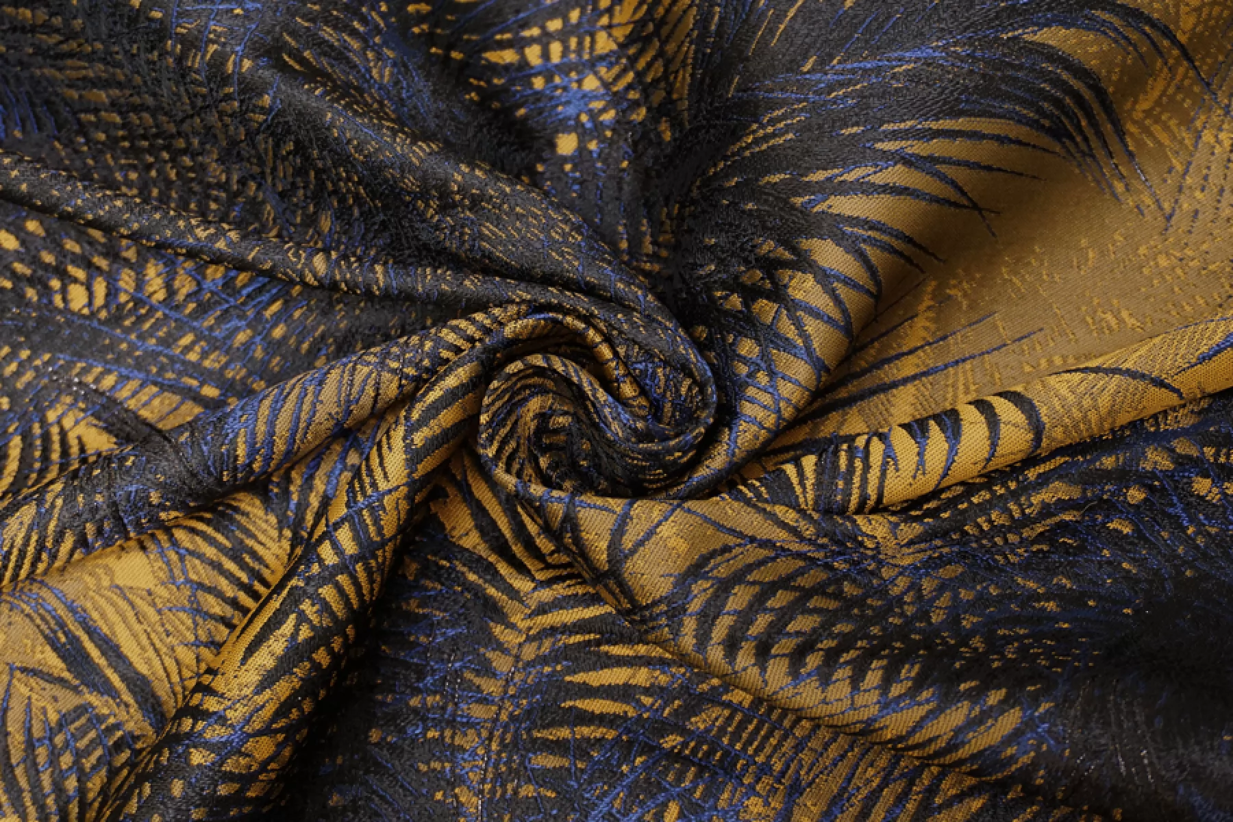 Шикарный костюмно-плательный жаккард с крупным принтом ввиде пальм в синем цвее и приглушенно-горчичном. Блестящий, гладкий, чувствуется нить люрекса. Держит хорошо форму,с "эффектом памяти",не тянется, не светит,хорошая пластика,сминаемость есть, но быстро разглаживается. Отлично подойдет на всю костюмно-плательную группу: платье,юбка,брюки,жакет,шорты.