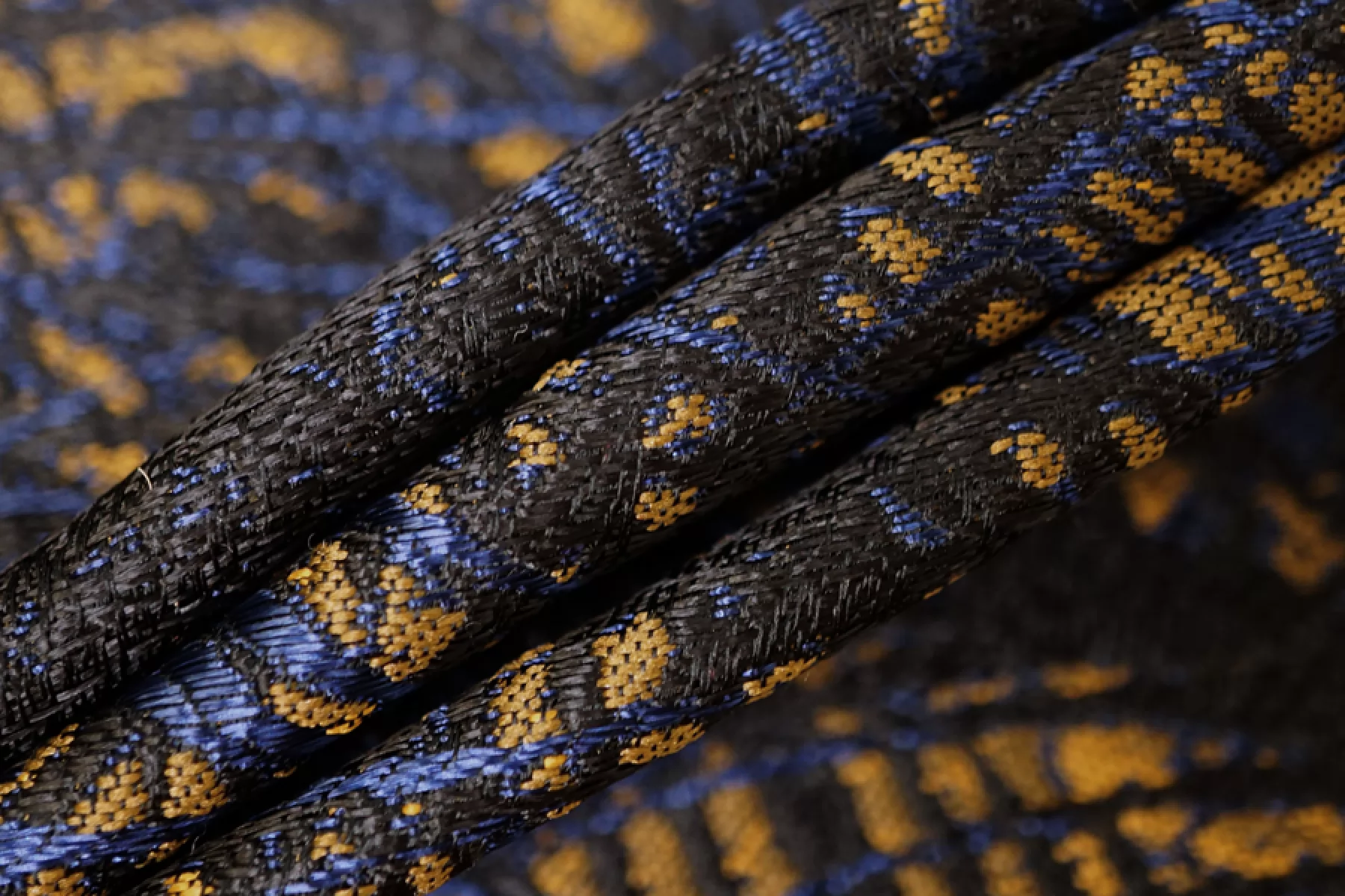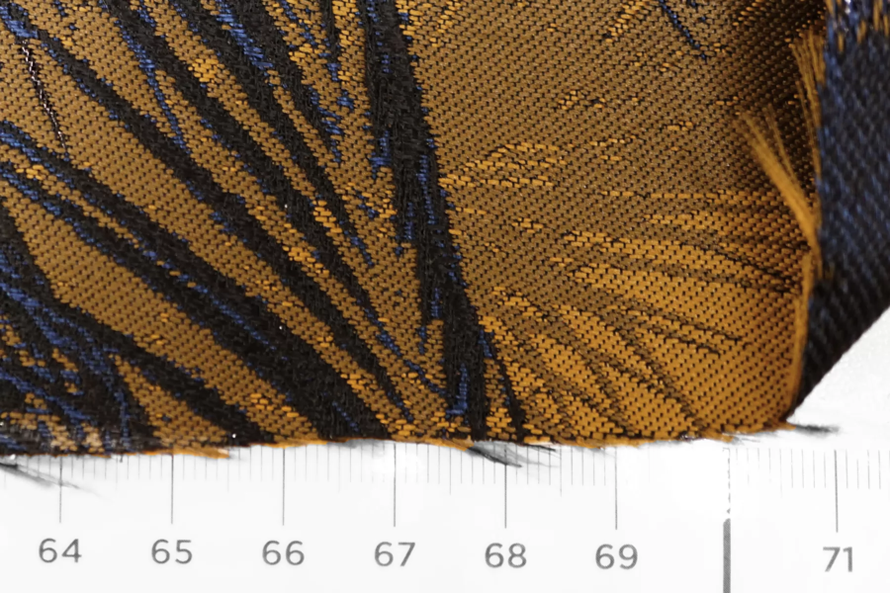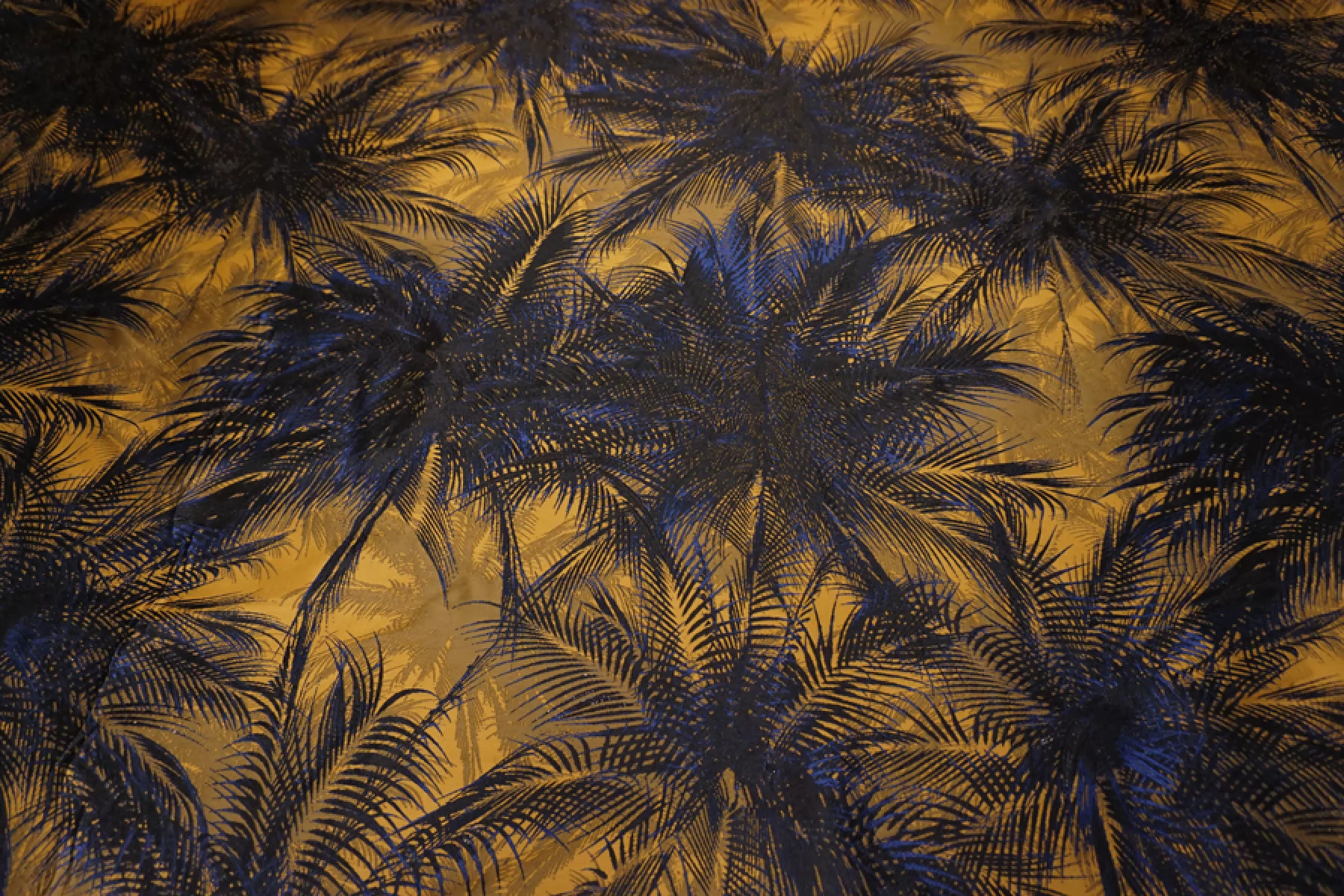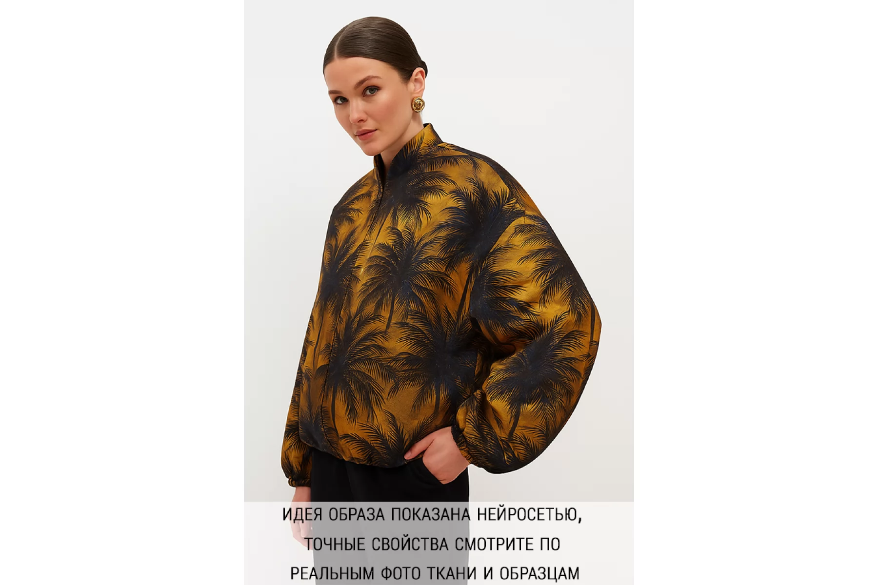 Шикарный костюмно-плательный жаккард с крупным принтом ввиде пальм в синем цвее и приглушенно-горчичном. Блестящий, гладкий, чувствуется нить люрекса. Держит хорошо форму,с "эффектом памяти",не тянется, не светит,хорошая пластика,сминаемость есть, но быстро разглаживается. Отлично подойдет на всю костюмно-плательную группу: платье,юбка,брюки,жакет,шорты.