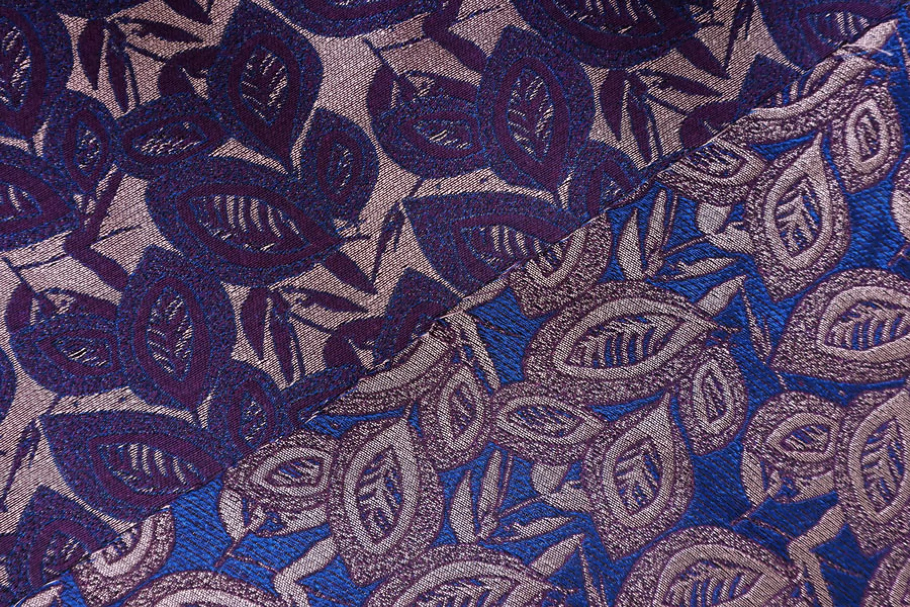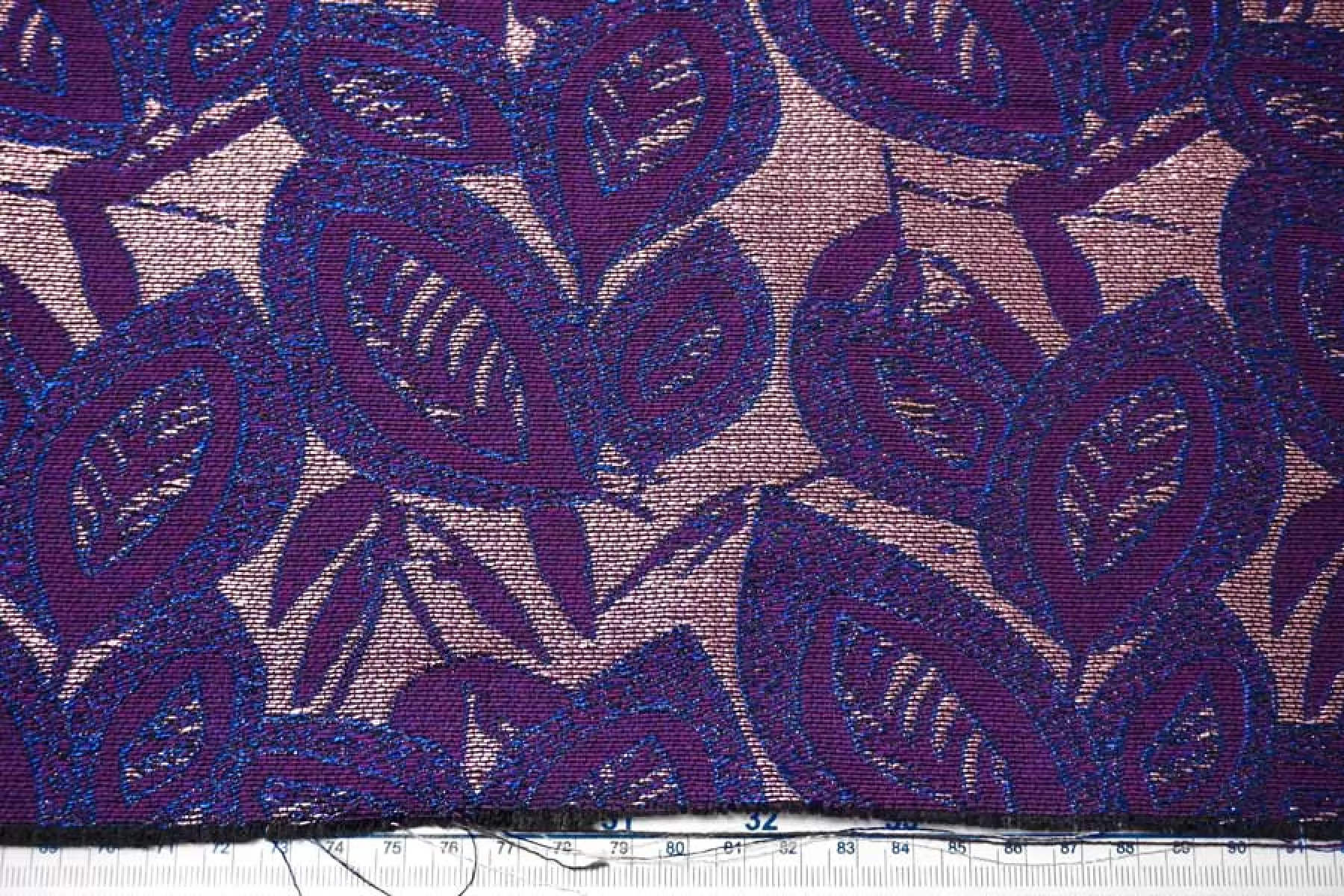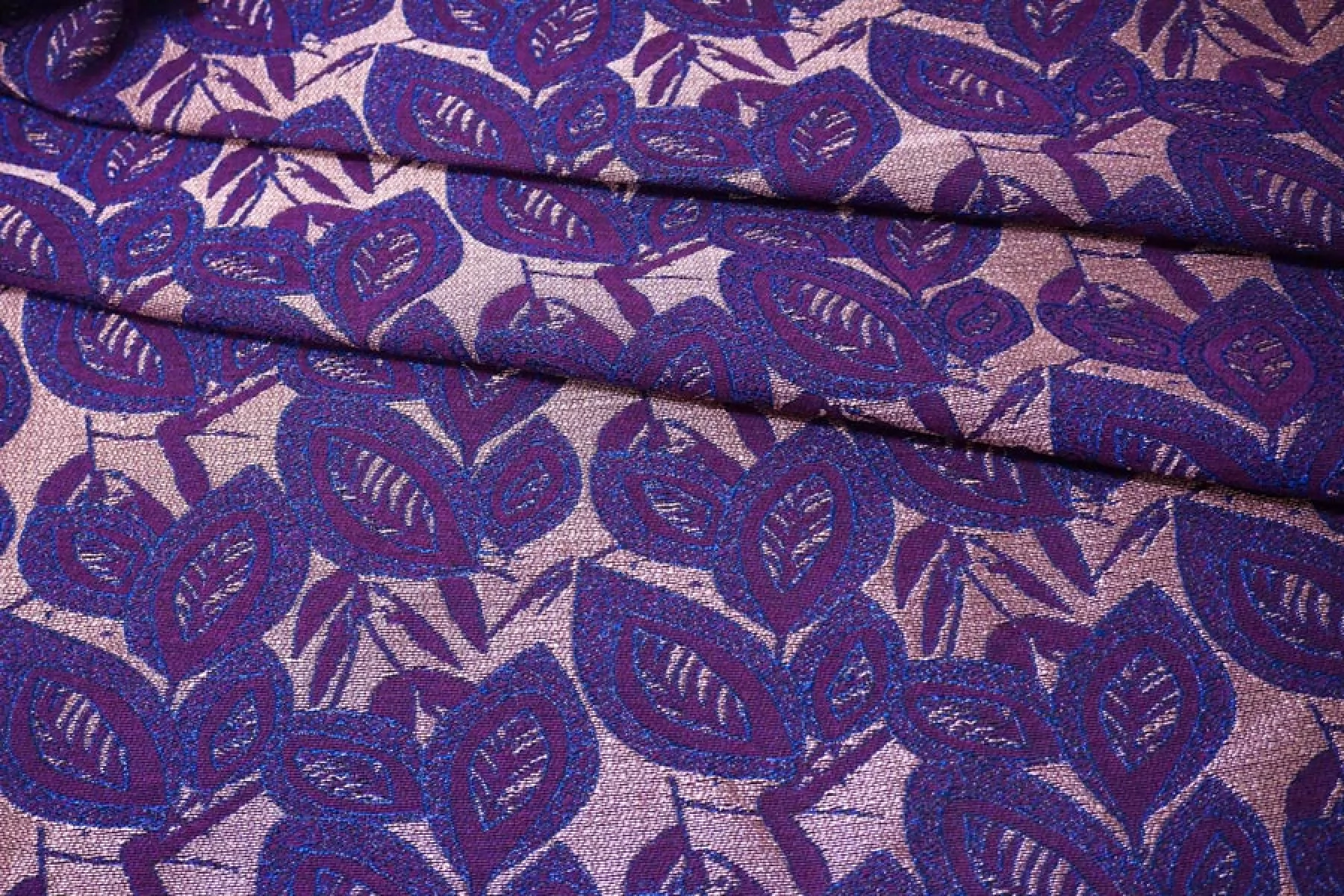 Классный жаккард с хлопком костюмной плотности в фиолетово-синем цвете с узором в виде листьев. Нити блестящие. Суховатый и шероховатый наощупь. Не тянется. Тонкий, достаточно пластичный. Прекрасно держит форму. Подойдет на костюмные варианты, платья и юбки. Смотрится очень стильно.