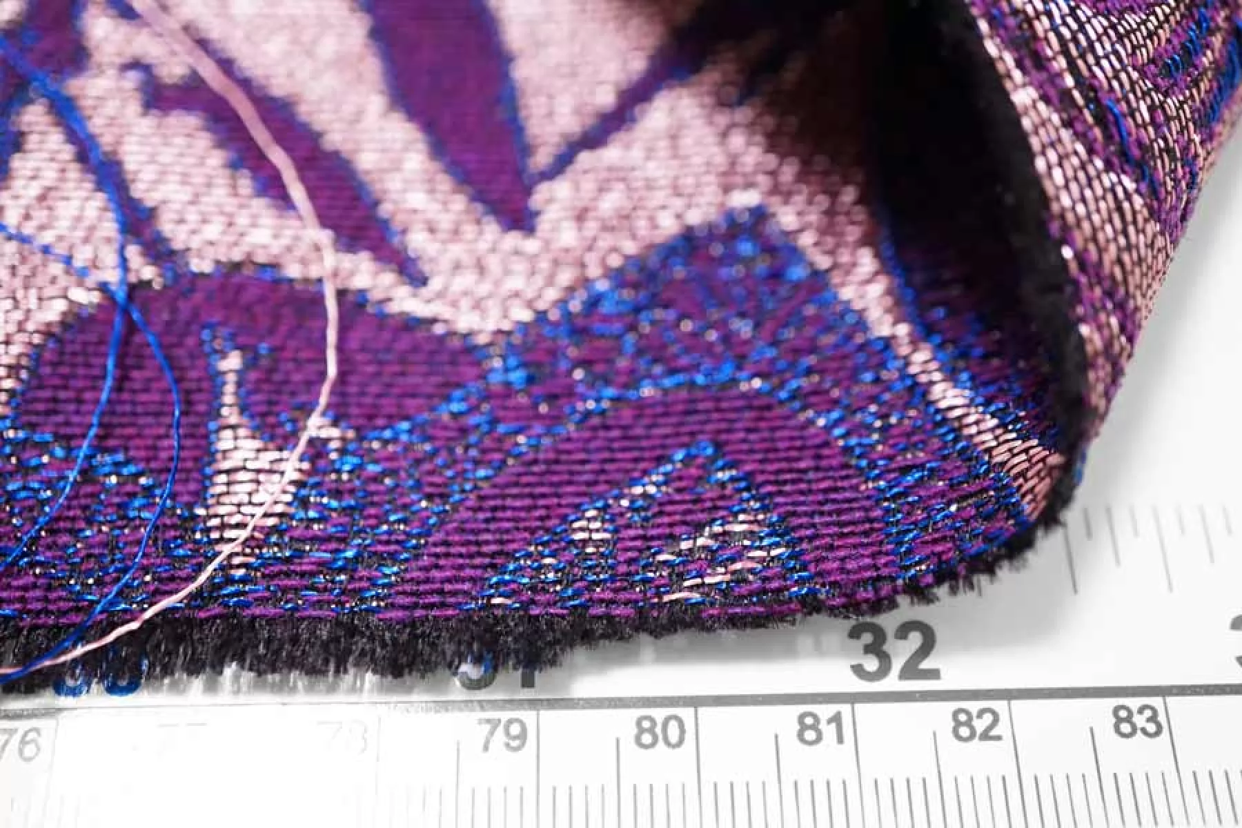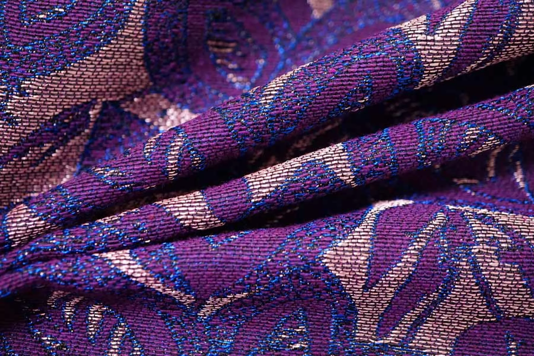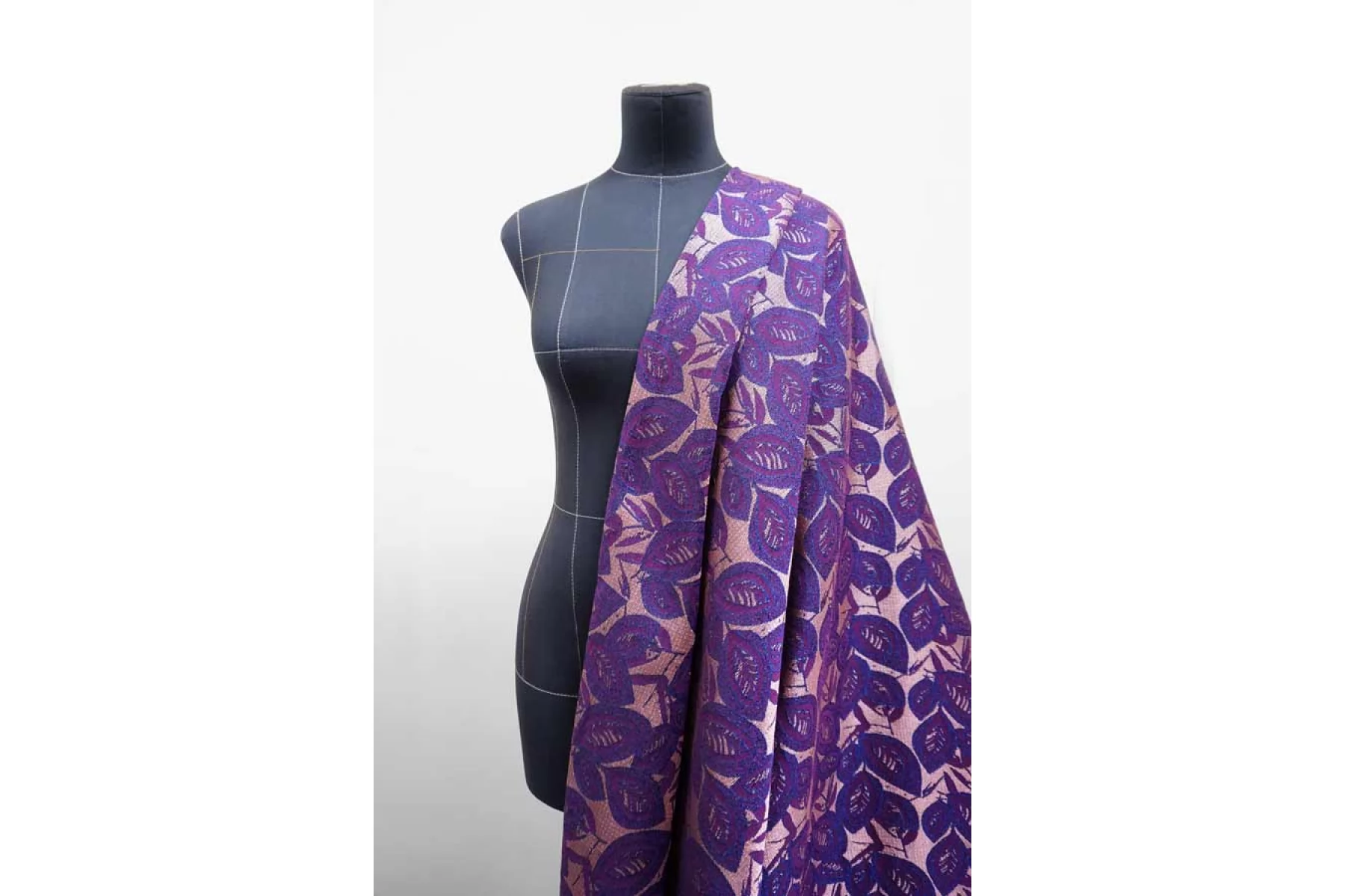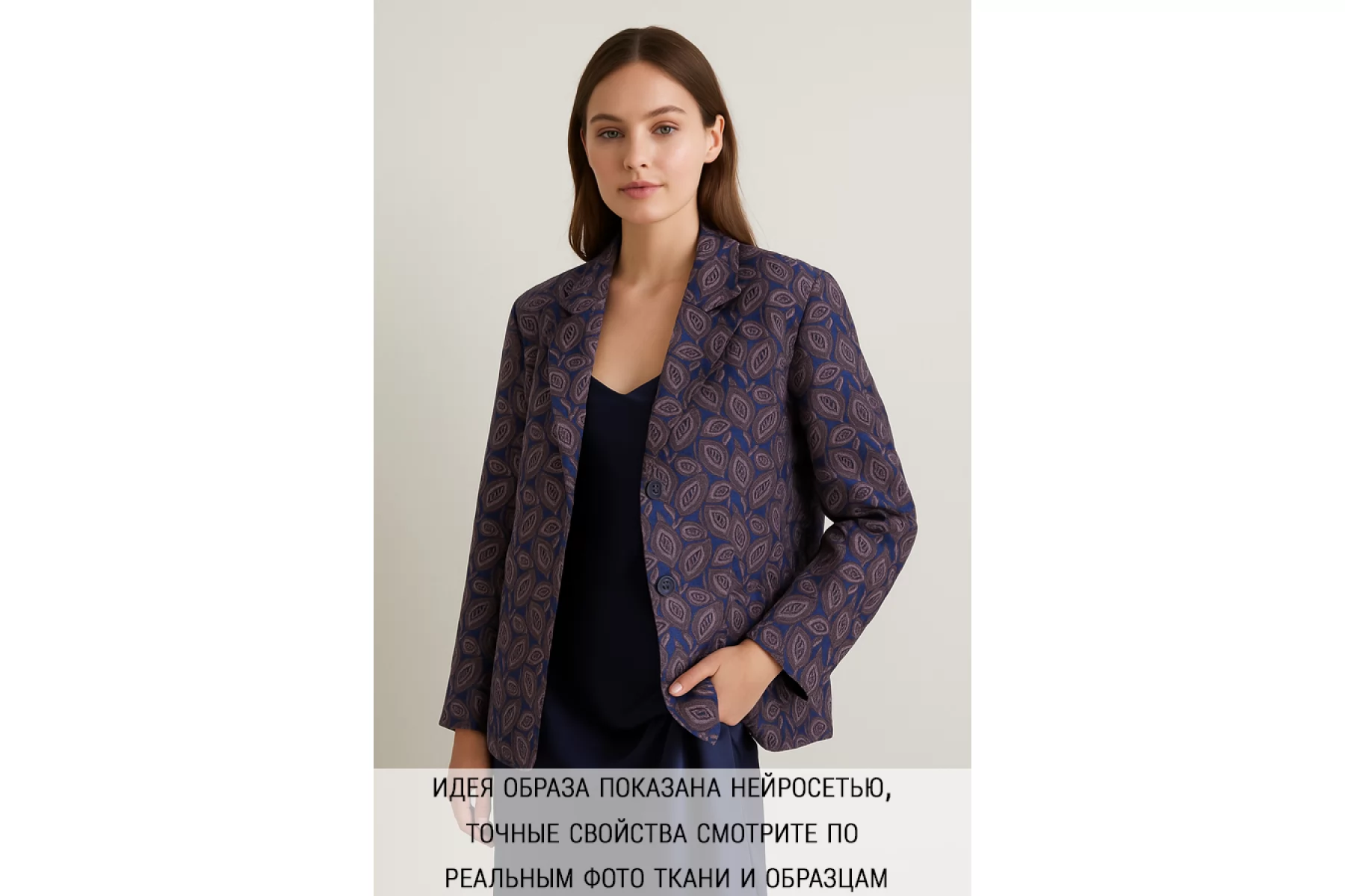 Классный жаккард с хлопком костюмной плотности в фиолетово-синем цвете с узором в виде листьев. Нити блестящие. Суховатый и шероховатый наощупь. Не тянется. Тонкий, достаточно пластичный. Прекрасно держит форму. Подойдет на костюмные варианты, платья и юбки. Смотрится очень стильно.