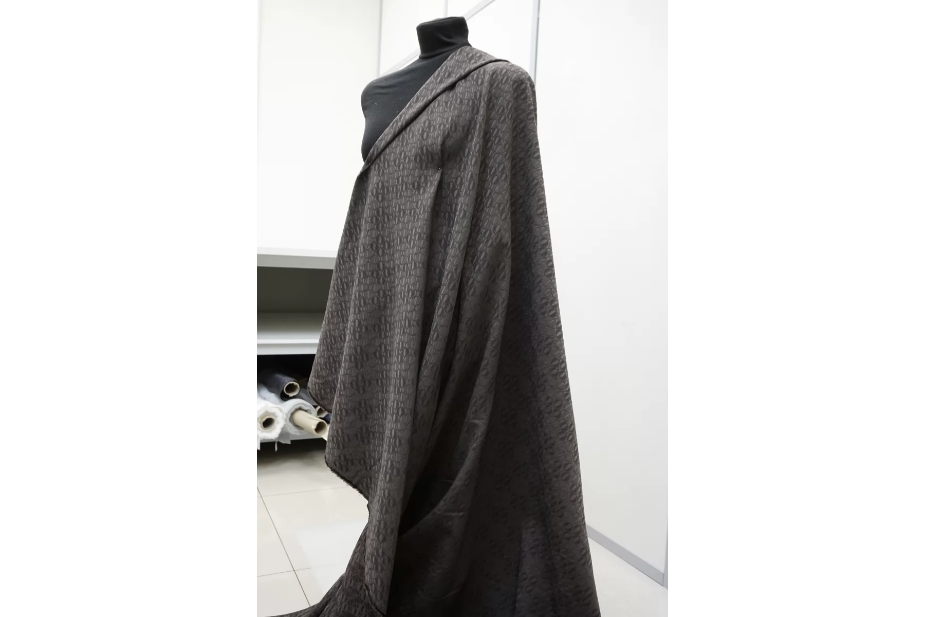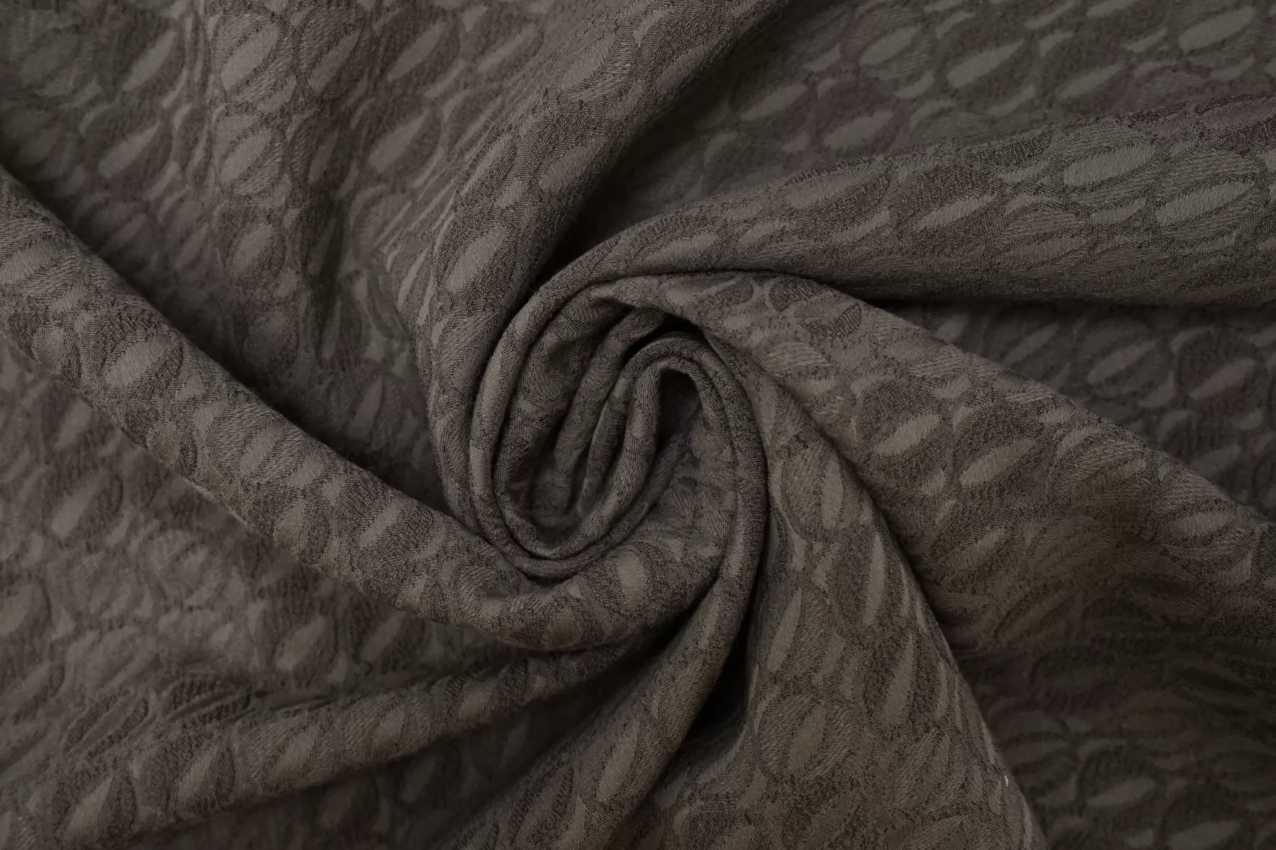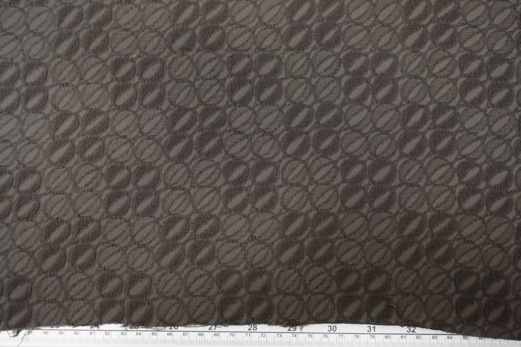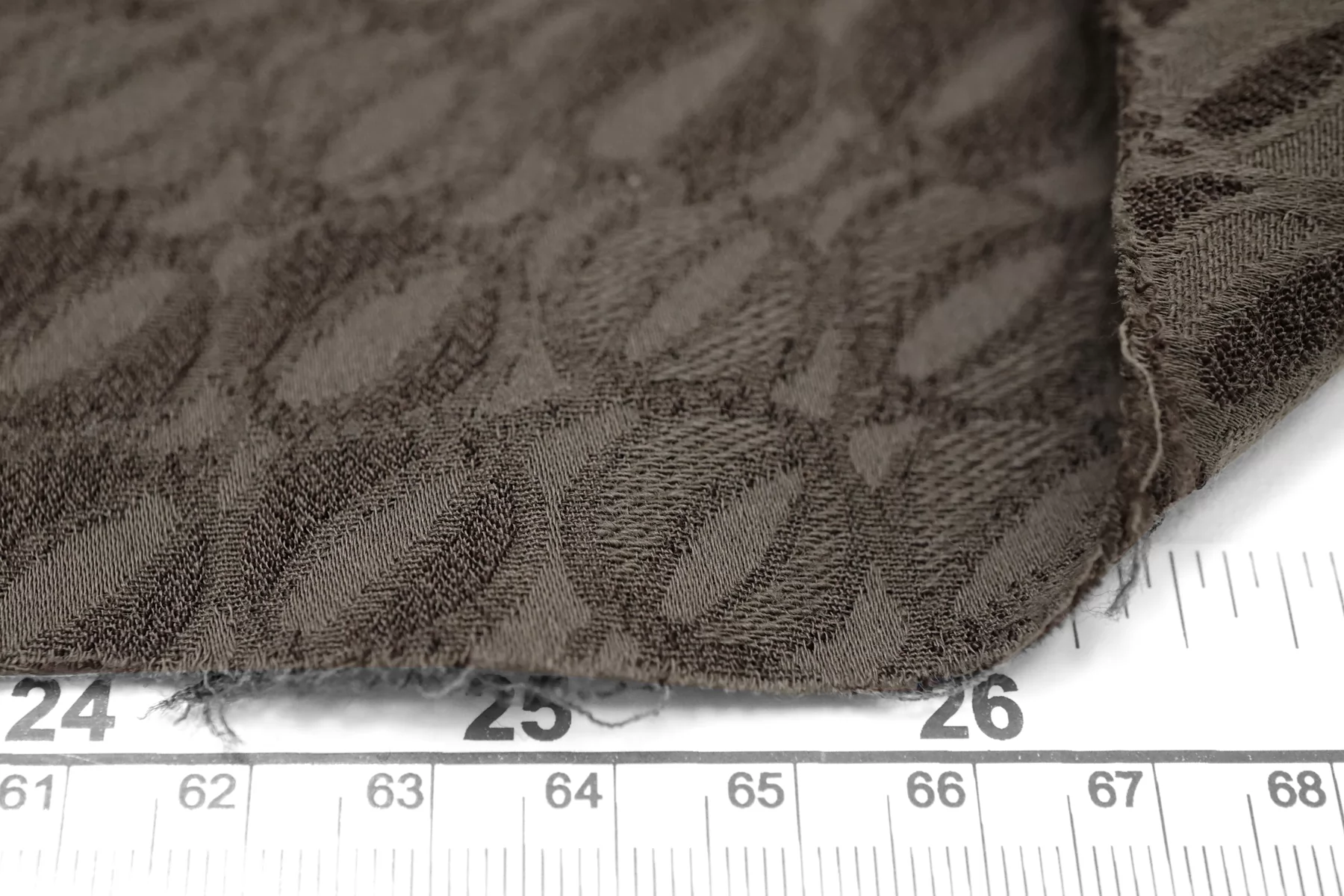 Жаккардовый хлопок костюмно-плательной плотности, абстрактный узор, цвет тёмный коричневый. Не просвечивает, тянется, пластичный. Форму держит умеренно. Подойдет для пошива пиджака, юбки, платья или костюма.
