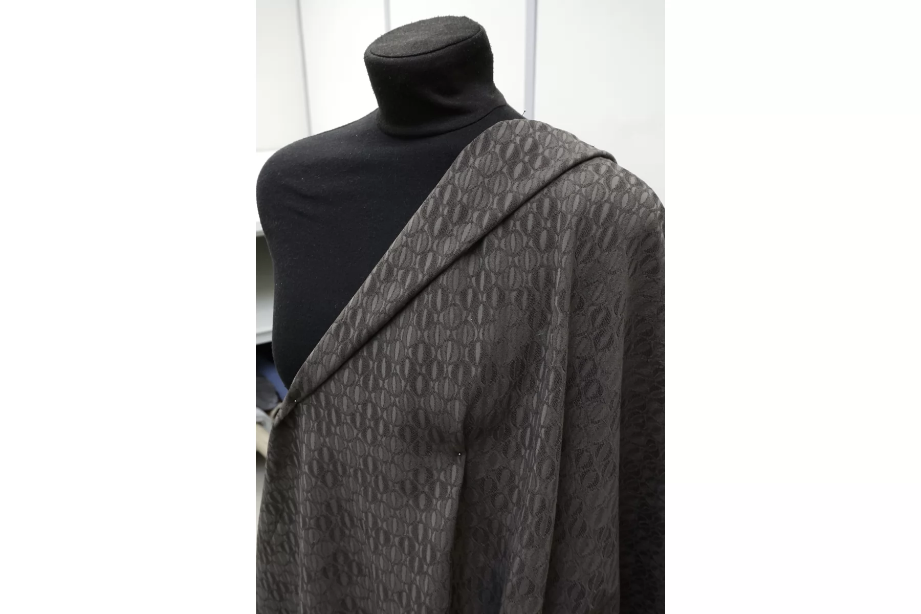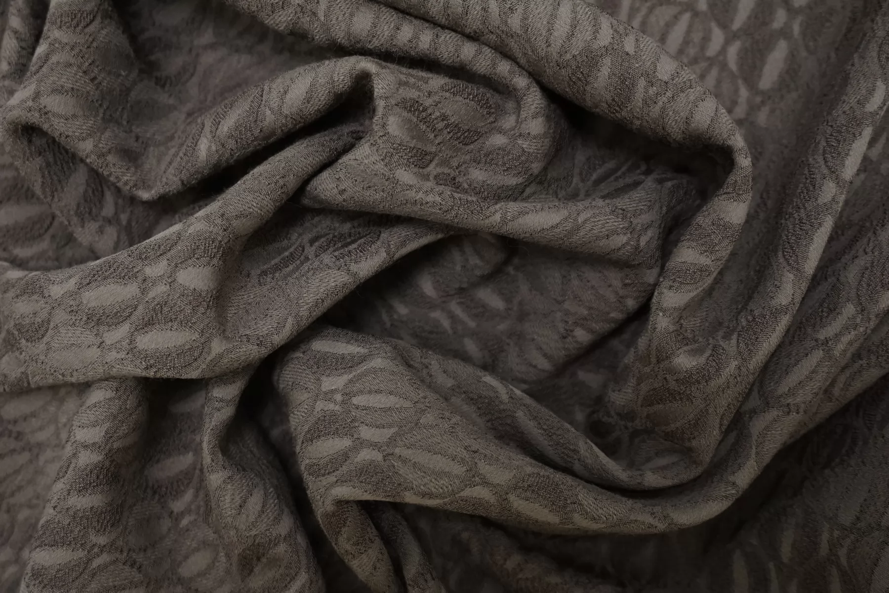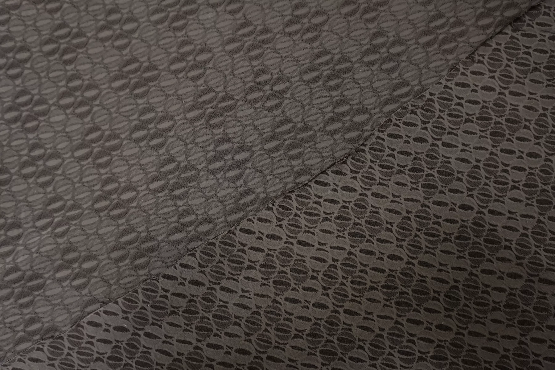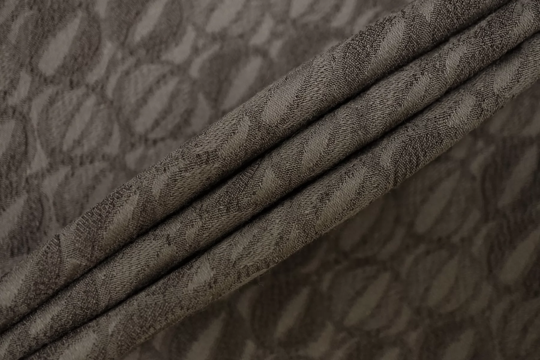 Жаккардовый хлопок костюмно-плательной плотности, абстрактный узор, цвет тёмный коричневый. Не просвечивает, тянется, пластичный. Форму держит умеренно. Подойдет для пошива пиджака, юбки, платья или костюма.