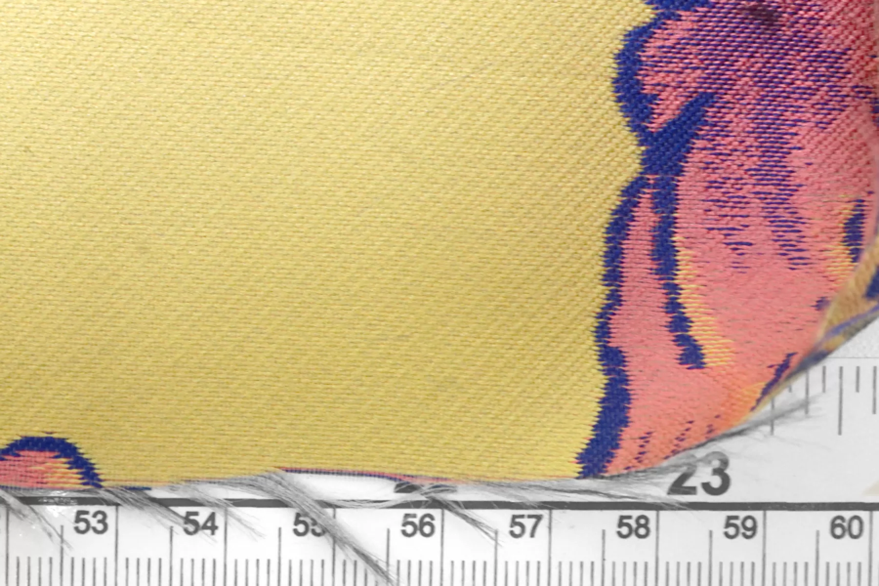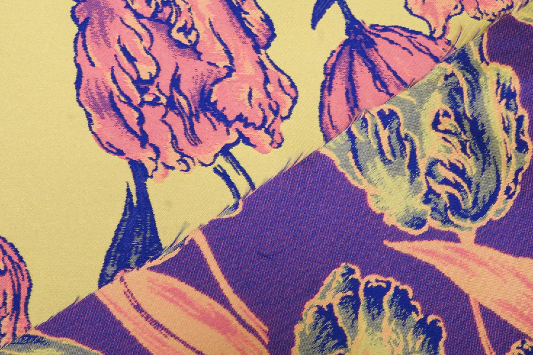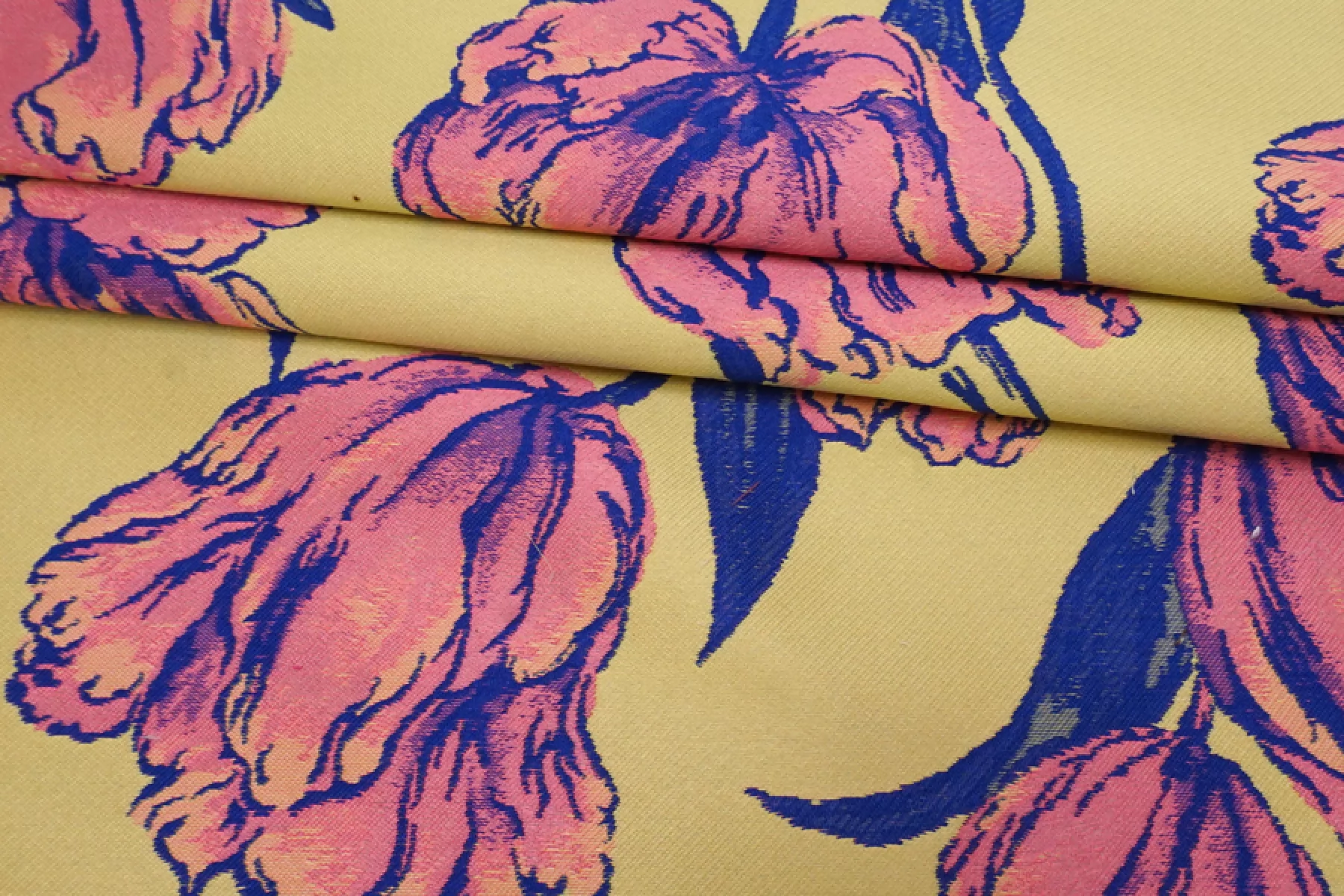 Прекрасный костюмный жаккард с цветочным принтом: тюльпанами в желто-фиолетово-розовой гамме. Плотный. Гладкий, плотный, но не толстый. Не просвечивает. Не тянется, хорошо держит форму. Сминается, но восстанавливается почти полностью. Отличный вариант на платья, жакеты, костюмы, юбки.