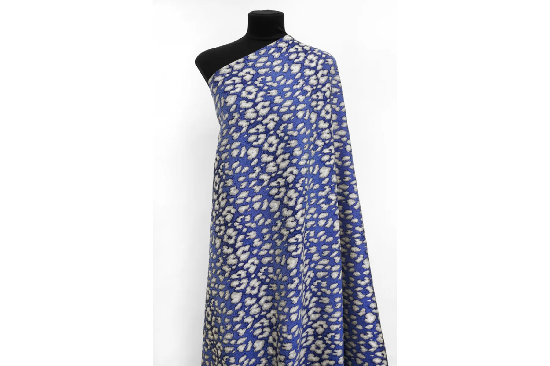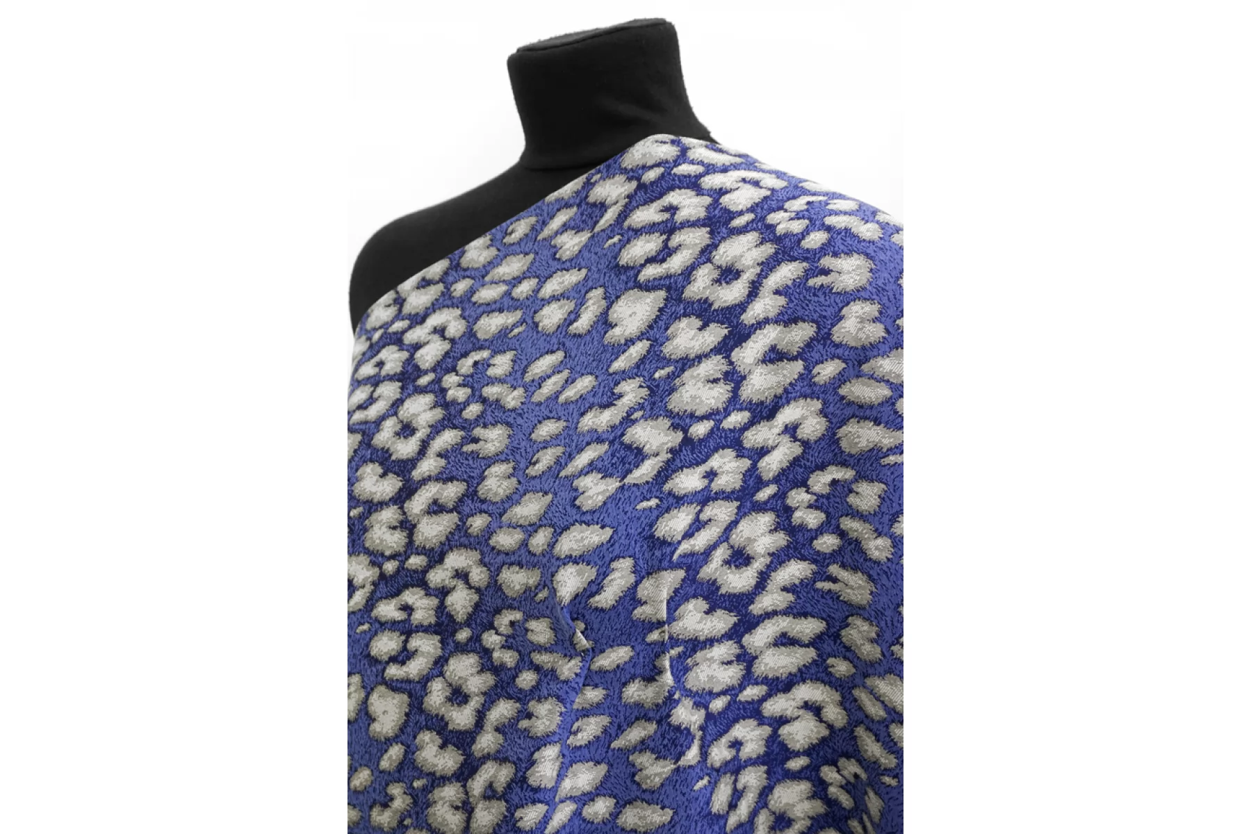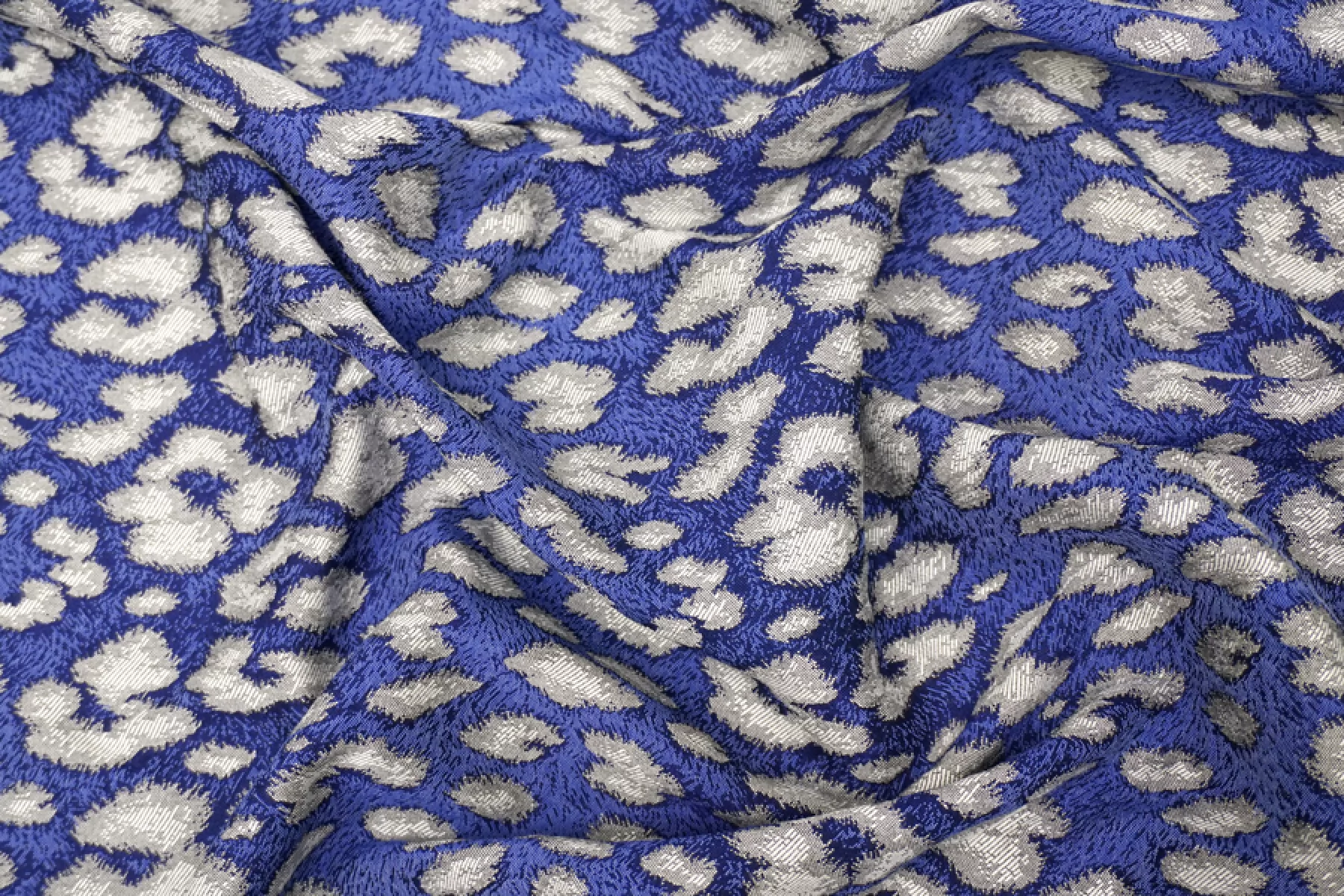 Классный плательный жаккард Roberto Cavalli из хлопка с полиэстером, с анималистичным узором в виде пятен леопарда серых тонов на сине-фиолетовом фоне светлого и темного оттенков. Шероховатый тактильно. Плотный. Не просвечивает. Не тянется. Не мнется. Отличный вариант на платья, жакеты, костюмы, бомберы, юбки и не только. Учитывайте усадку.
