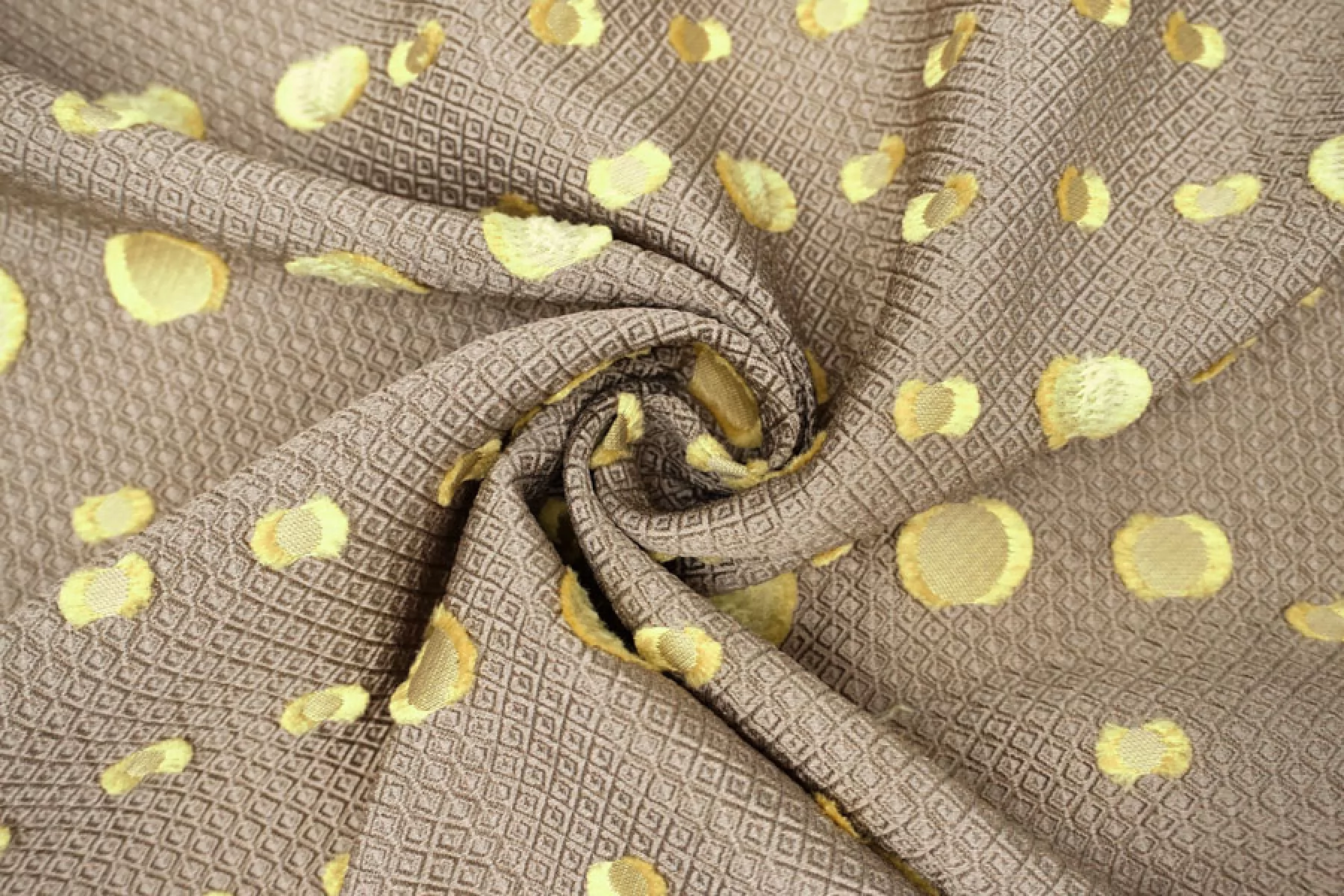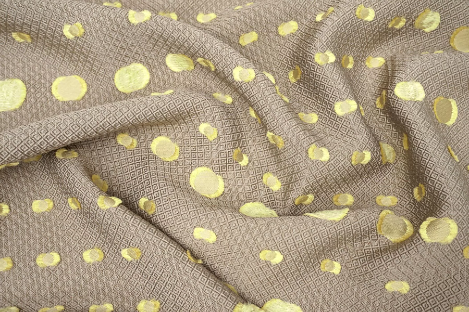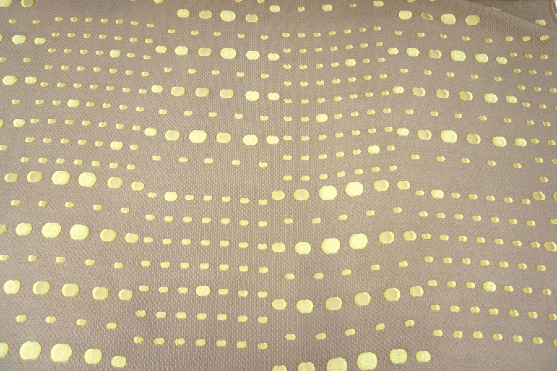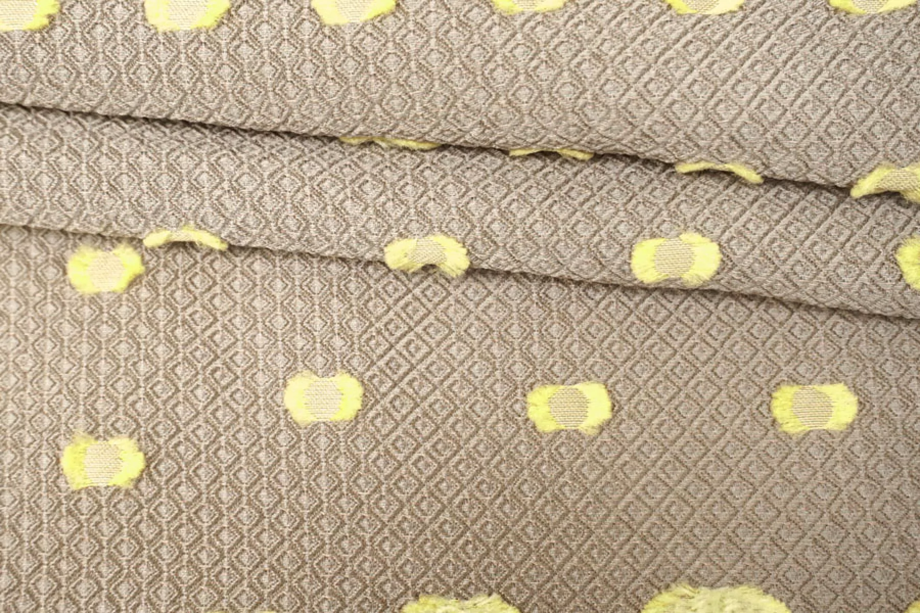 Нарядный жаккард с выработкой объемного мелкого ромба в бежевом оттенке и филькупе в форме кругов в желто-салатовом оттенке. Материал красиво переливается. Не тянется. Слегка заметна тень силуэта. Не мнется. Хорошо драпируется, держит форму. Мягкий. Пластичный. Вариант на платья, нарядные юбки или жакеты и любые другие варианты. При необходимости используйте подкладочный материал.