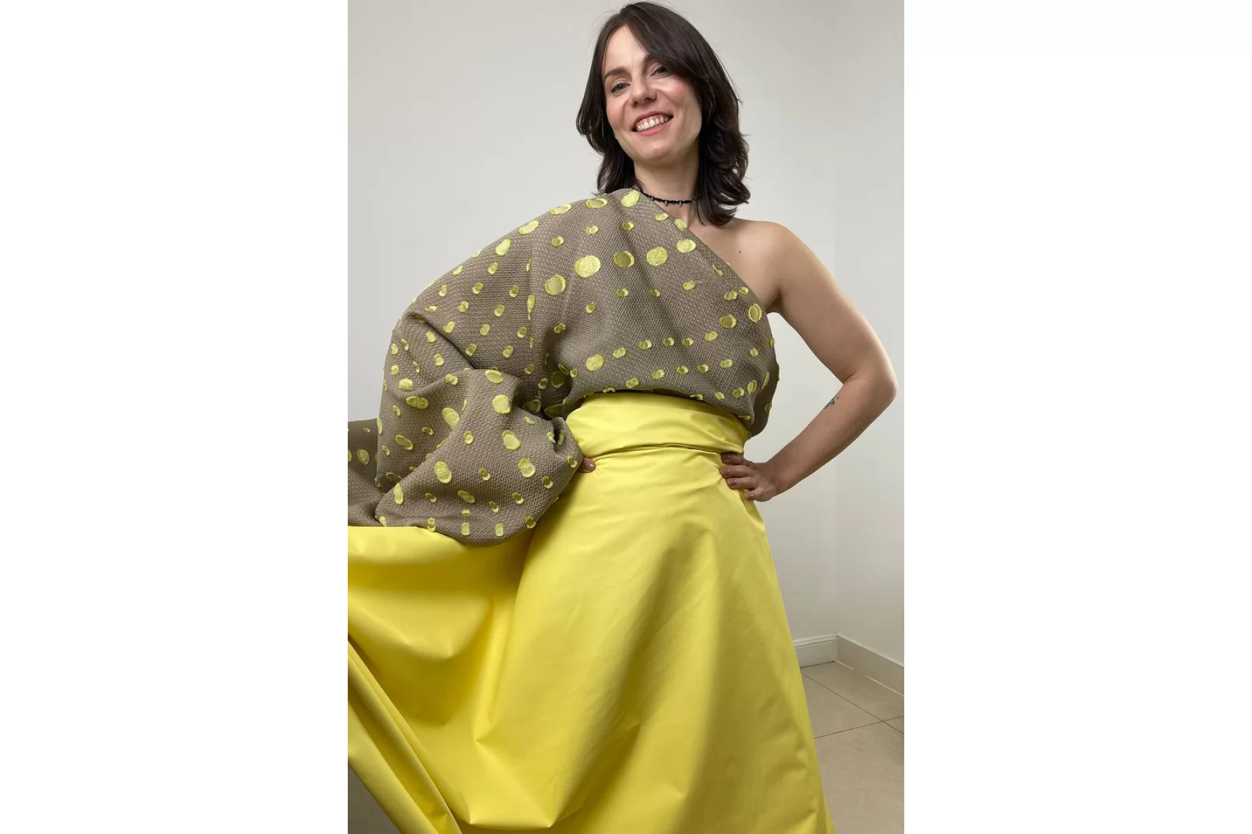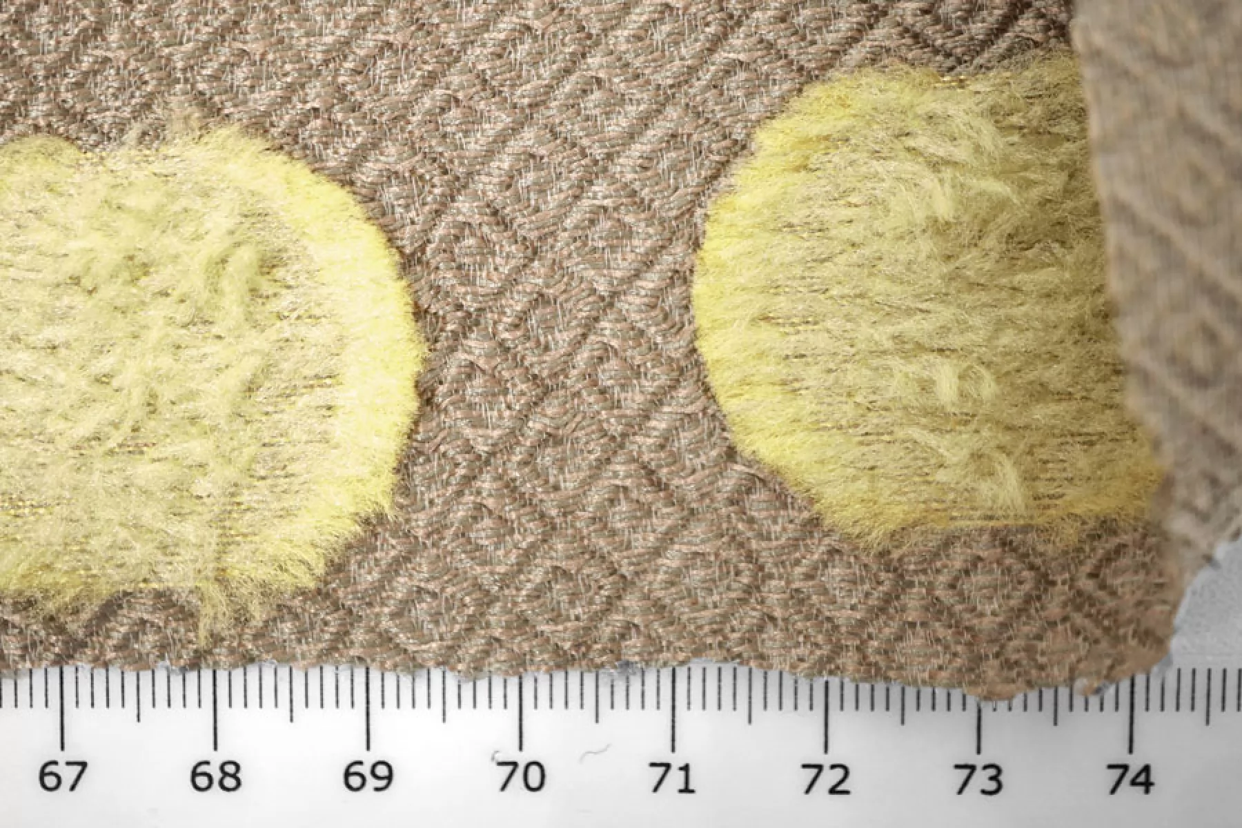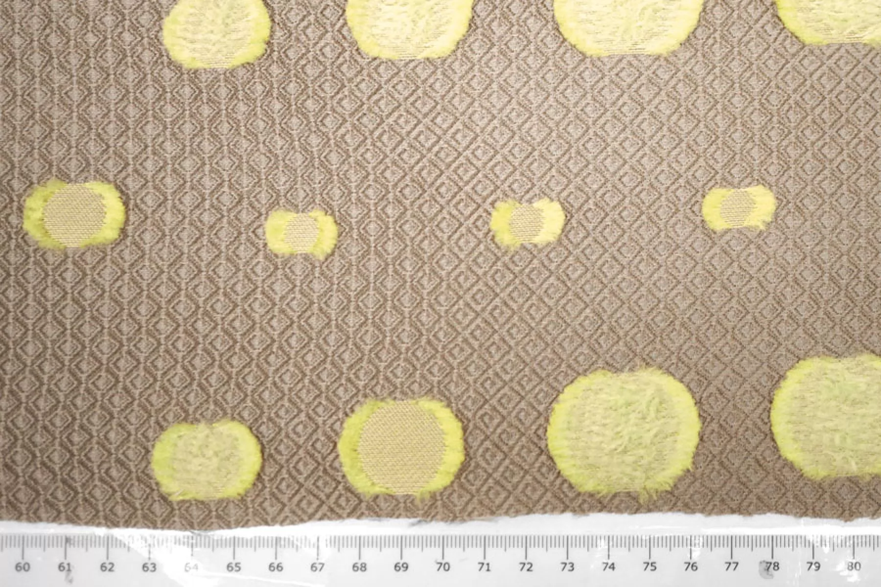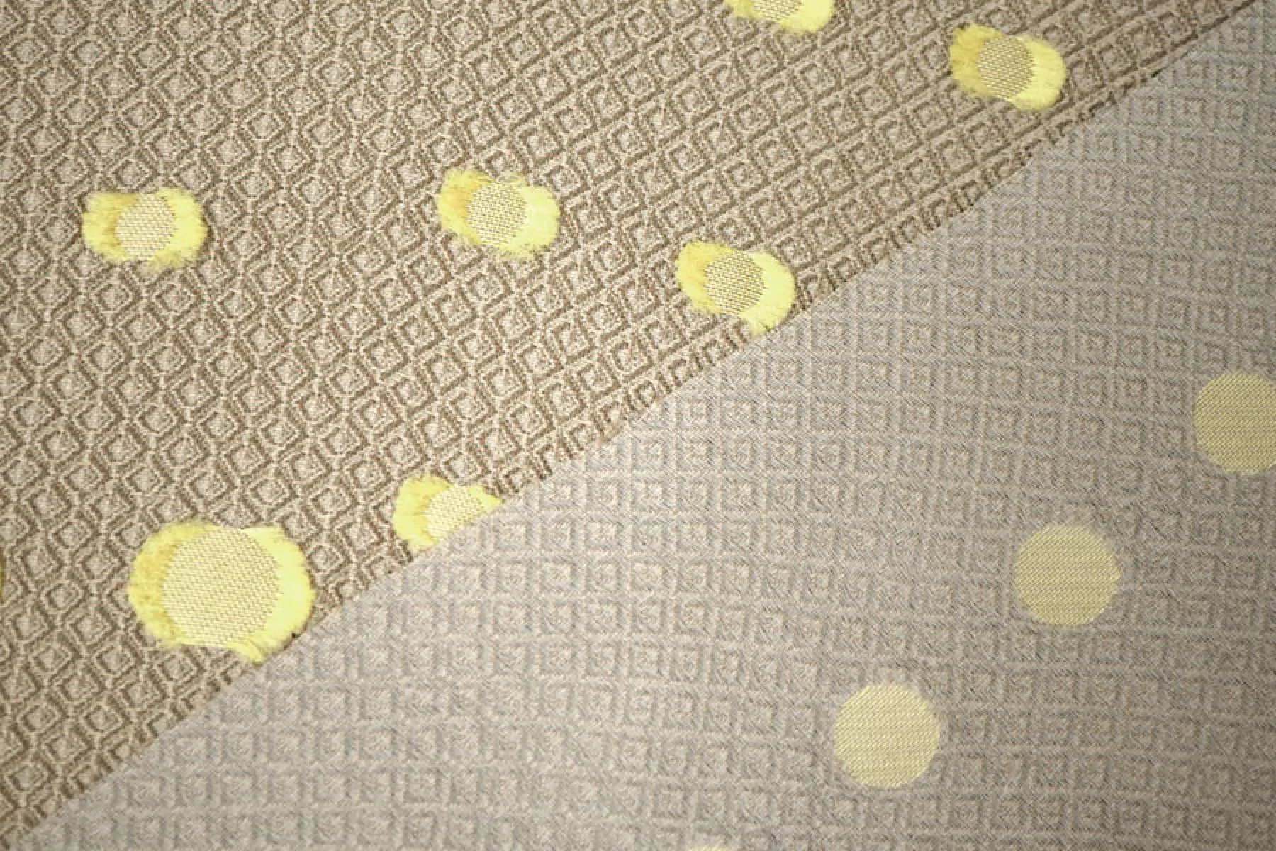 Нарядный жаккард с выработкой объемного мелкого ромба в бежевом оттенке и филькупе в форме кругов в желто-салатовом оттенке. Материал красиво переливается. Не тянется. Слегка заметна тень силуэта. Не мнется. Хорошо драпируется, держит форму. Мягкий. Пластичный. Вариант на платья, нарядные юбки или жакеты и любые другие варианты. При необходимости используйте подкладочный материал.