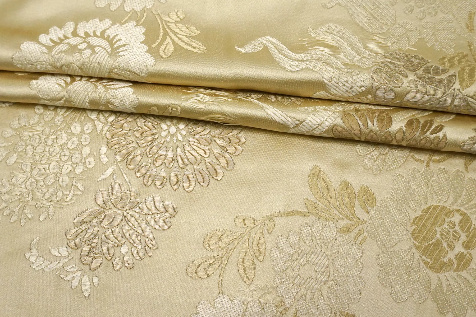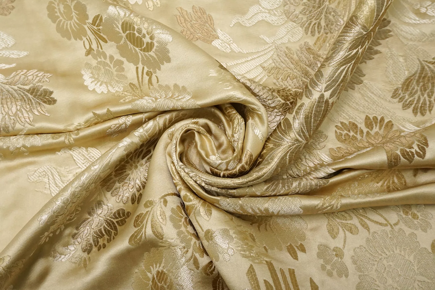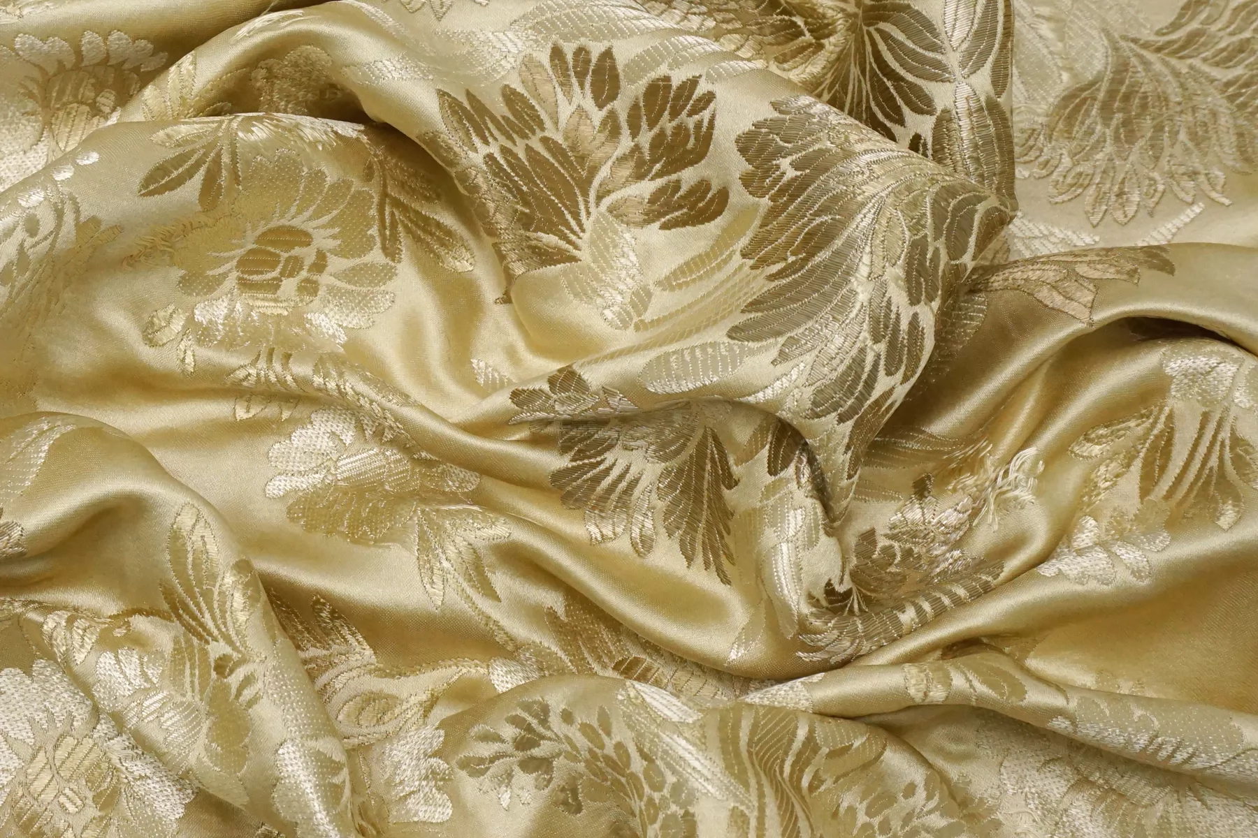 Шелковый жаккард в с принтом в виде цветов, в золотистых тонах. Тактильно мягкий, приятный. Не просвечивает, не тянется. Пластичный, при этом держит форму. Отлично подойдет на всю костюмно-плательную группу: платье, юбка, брюки, жакет.