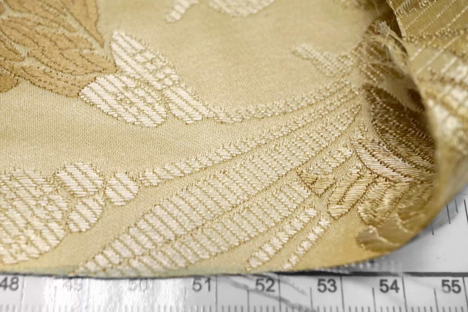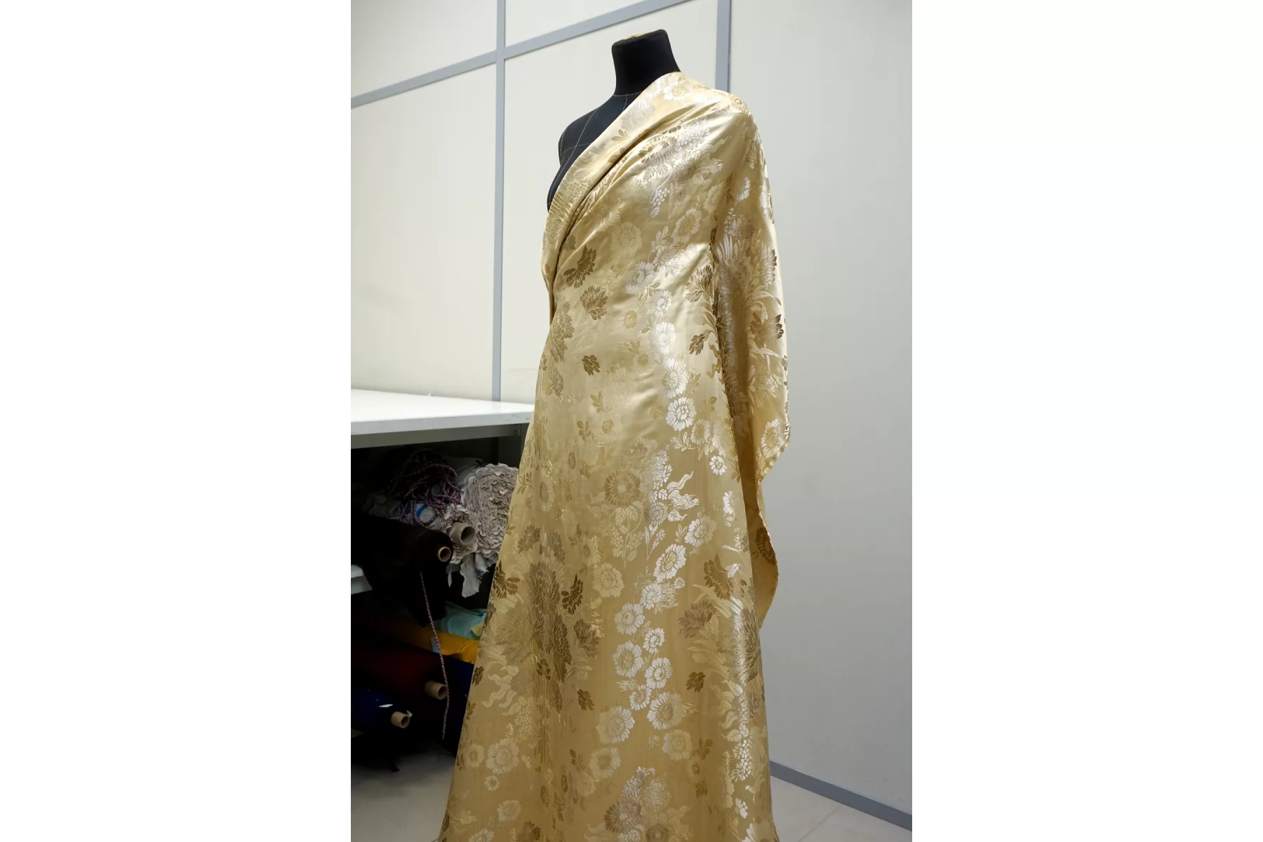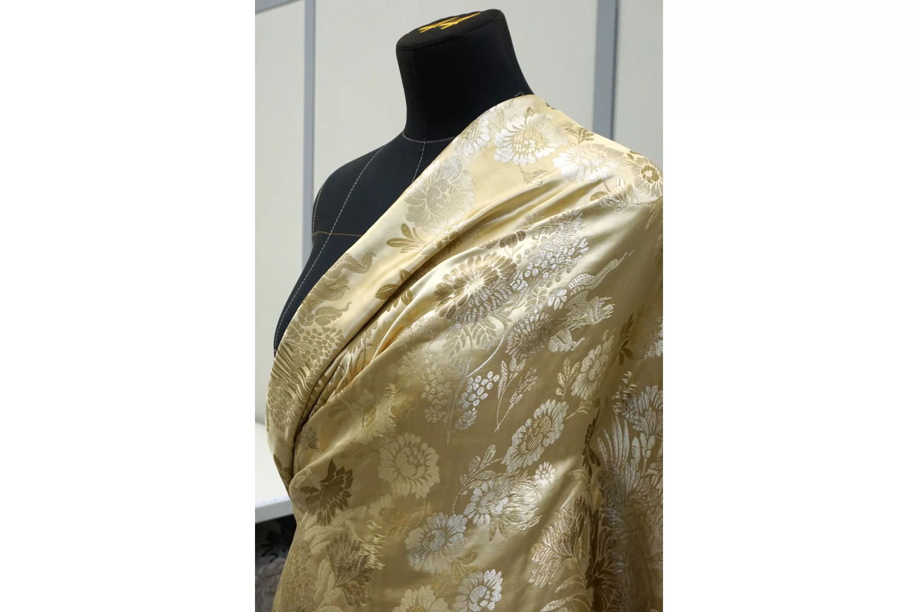 Шелковый жаккард в с принтом в виде цветов, в золотистых тонах. Тактильно мягкий, приятный. Не просвечивает, не тянется. Пластичный, при этом держит форму. Отлично подойдет на всю костюмно-плательную группу: платье, юбка, брюки, жакет.