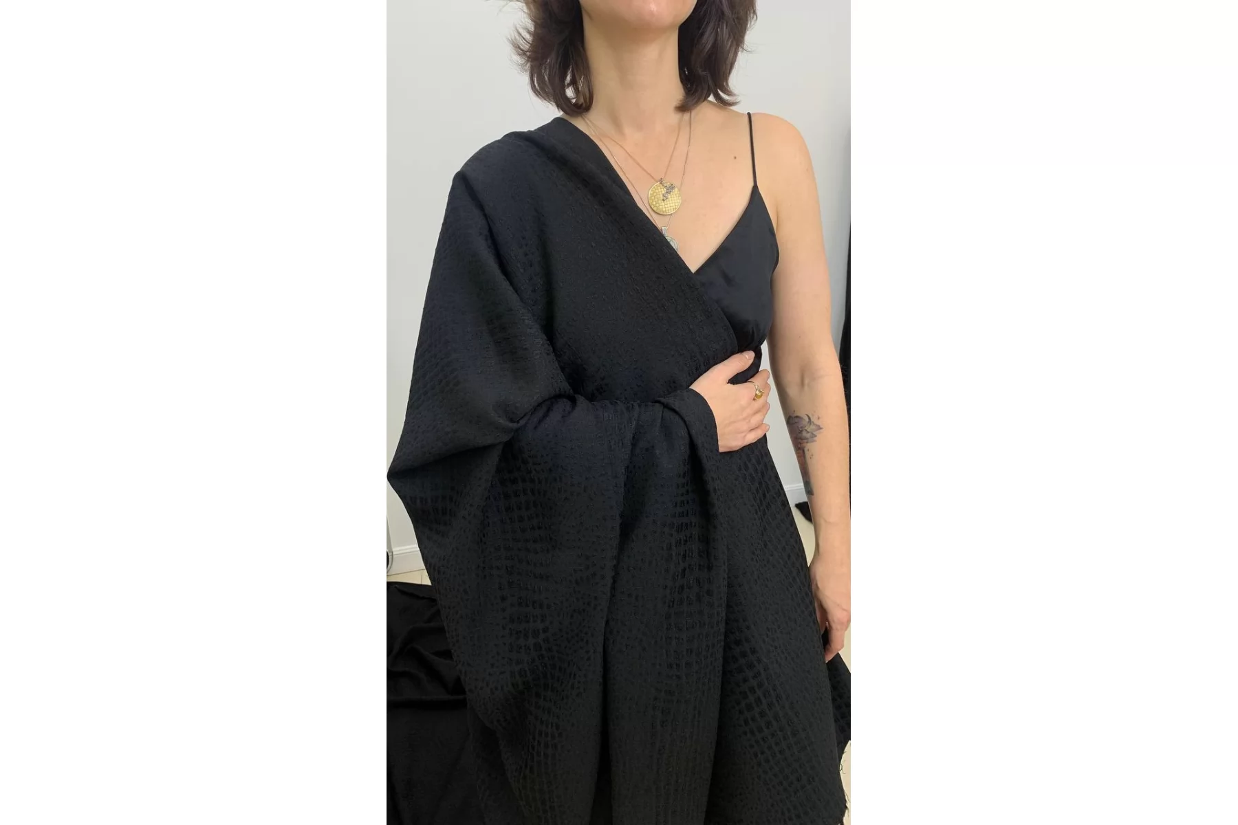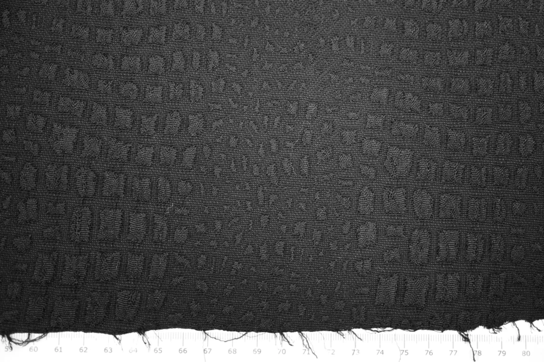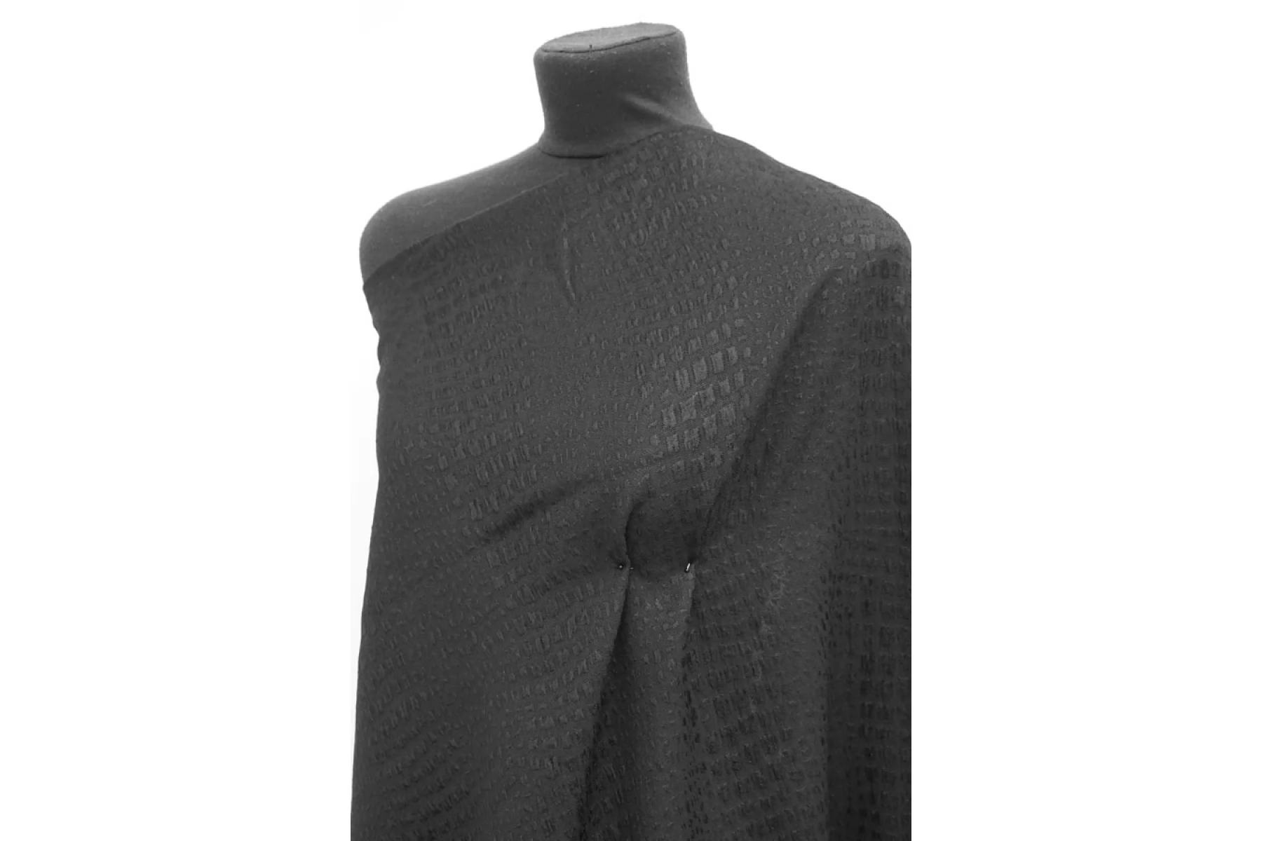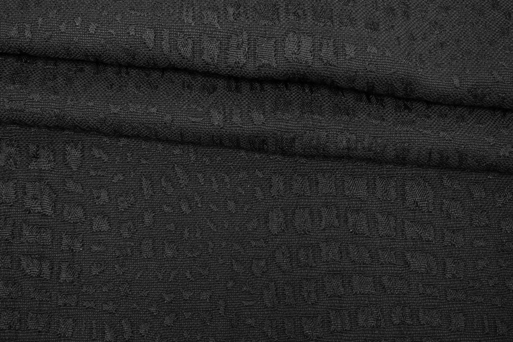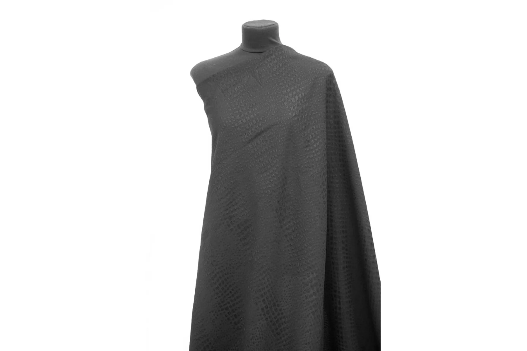 Вискозный жаккард черного оттенка, костюмно-плательный по плотности, с выработкой в виде анималистичной геометрии. Выглядит необычно и стильно! Материал тактильно шероховатый, пластичный. Обладает легким лоском пятен. Материал достаточно плотный, но слегка просвечивает силуэт на просвет за счет плетения. Не тянется, а слегка пружинит. Форму почти не держит и практически не мнется. Шьем костюмы, платья, юбки и мягкие жакеты. Обязательно учитываем усадку порядка 5-10%.