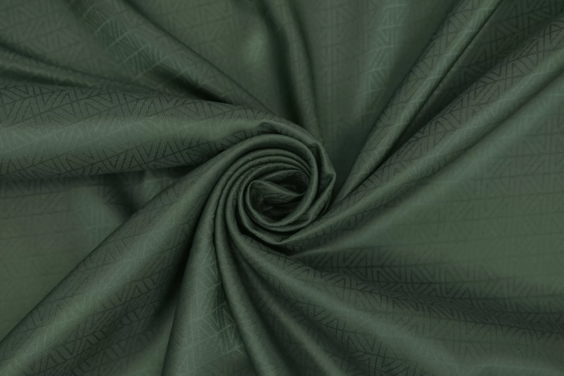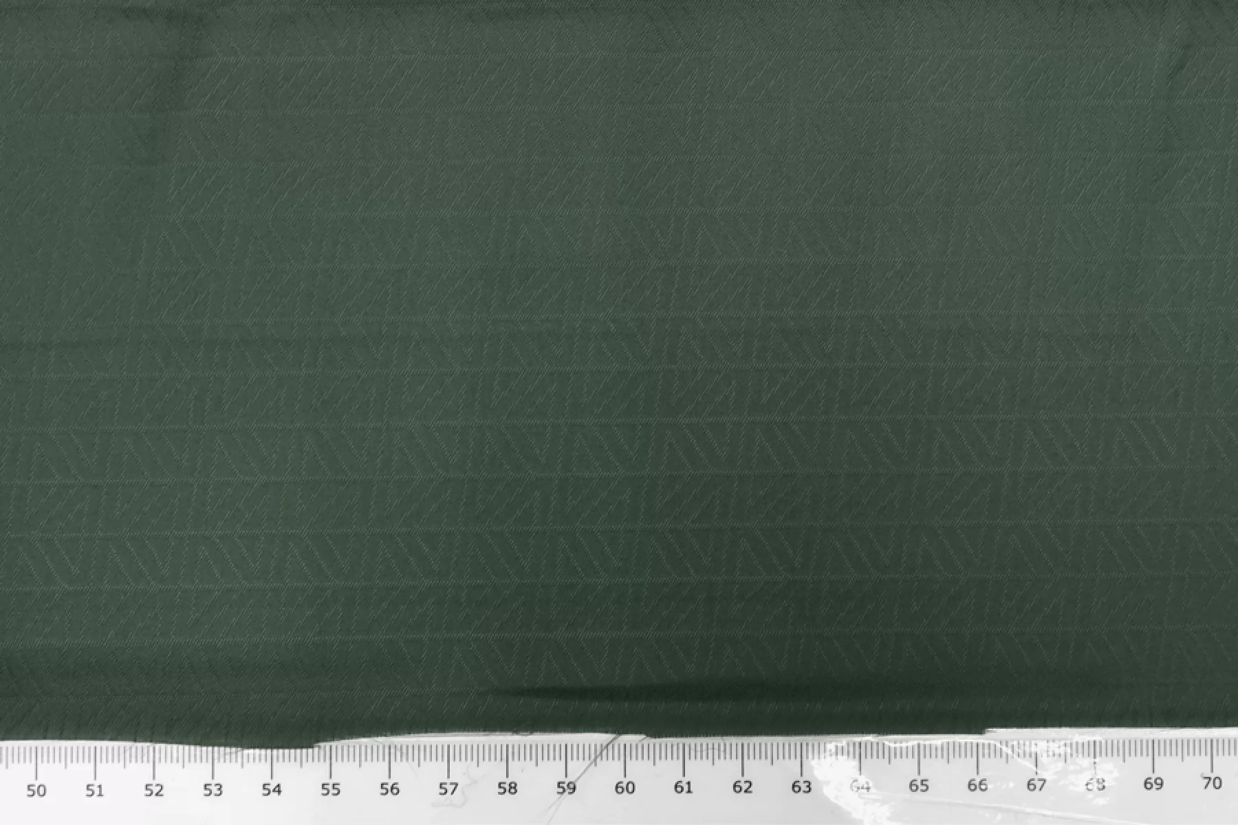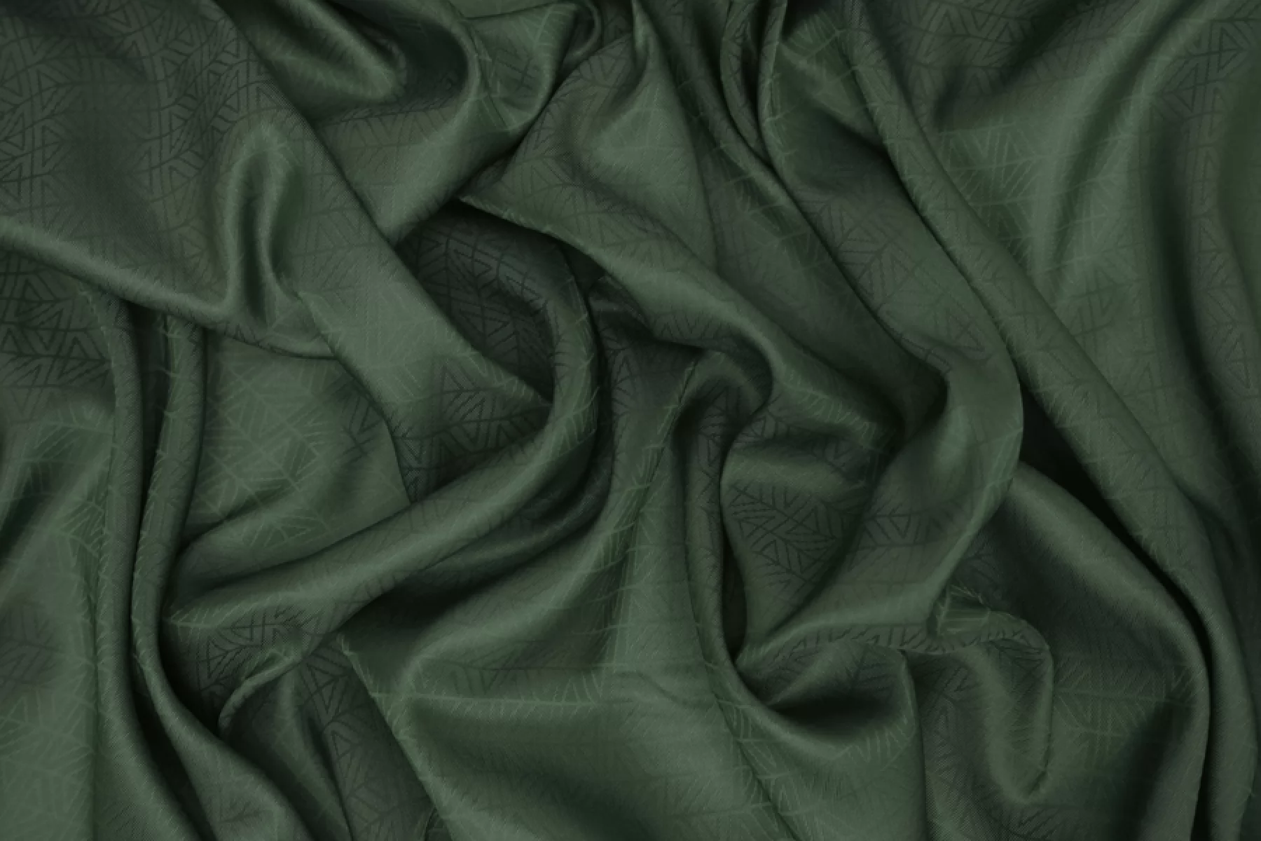 Жаккардовая подкладочная вискоза стрейч с геометрической выработкой в темно-зеленом оттенке. Тактильно мягкая, приятная, слегка суховатая. Обладает красивым шелковистым лоском. Немного тянется за счет эластана. Просвечивает силуэт. Мнется. Форму практически не держит. Вариант на подкладочный материал к костюмно-плательной группе. Обязательно учитывайте возможную усадку 5-10%