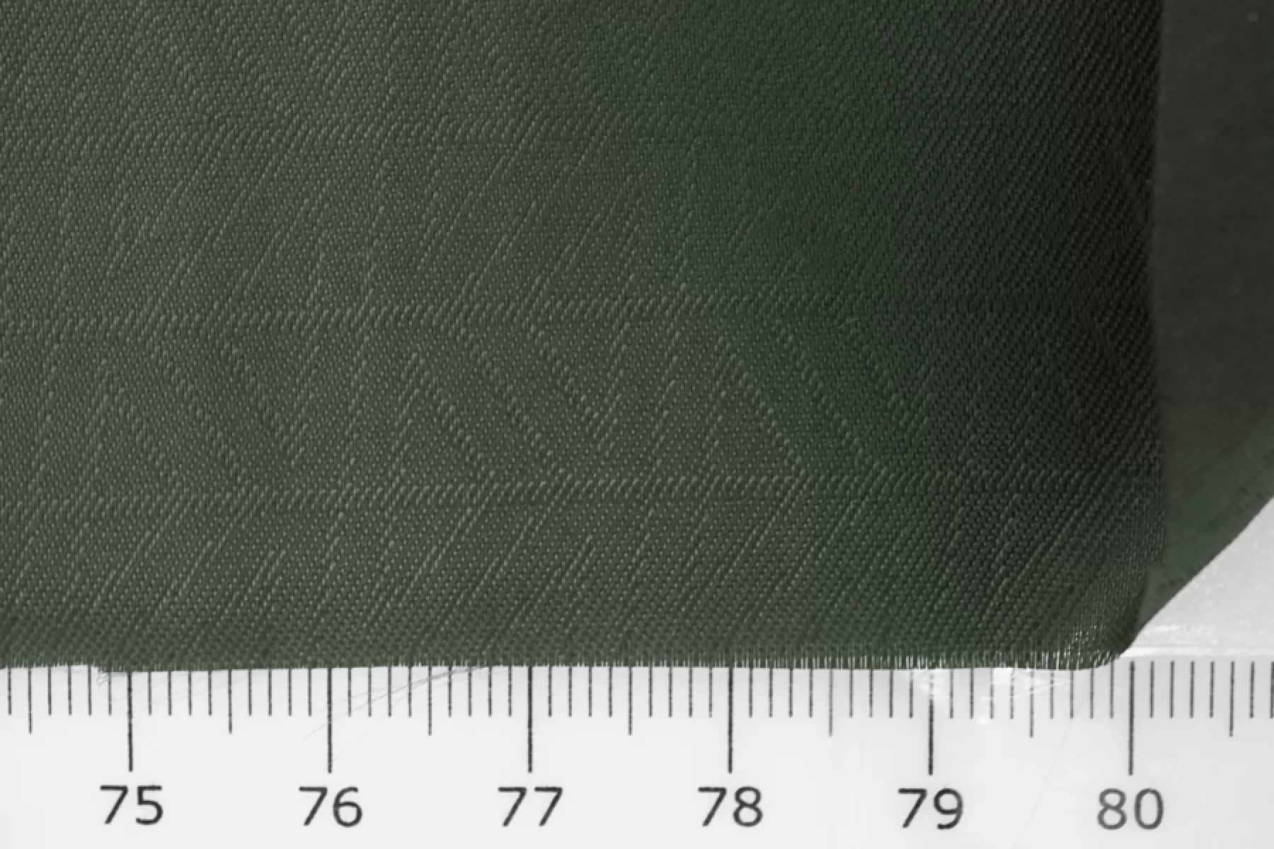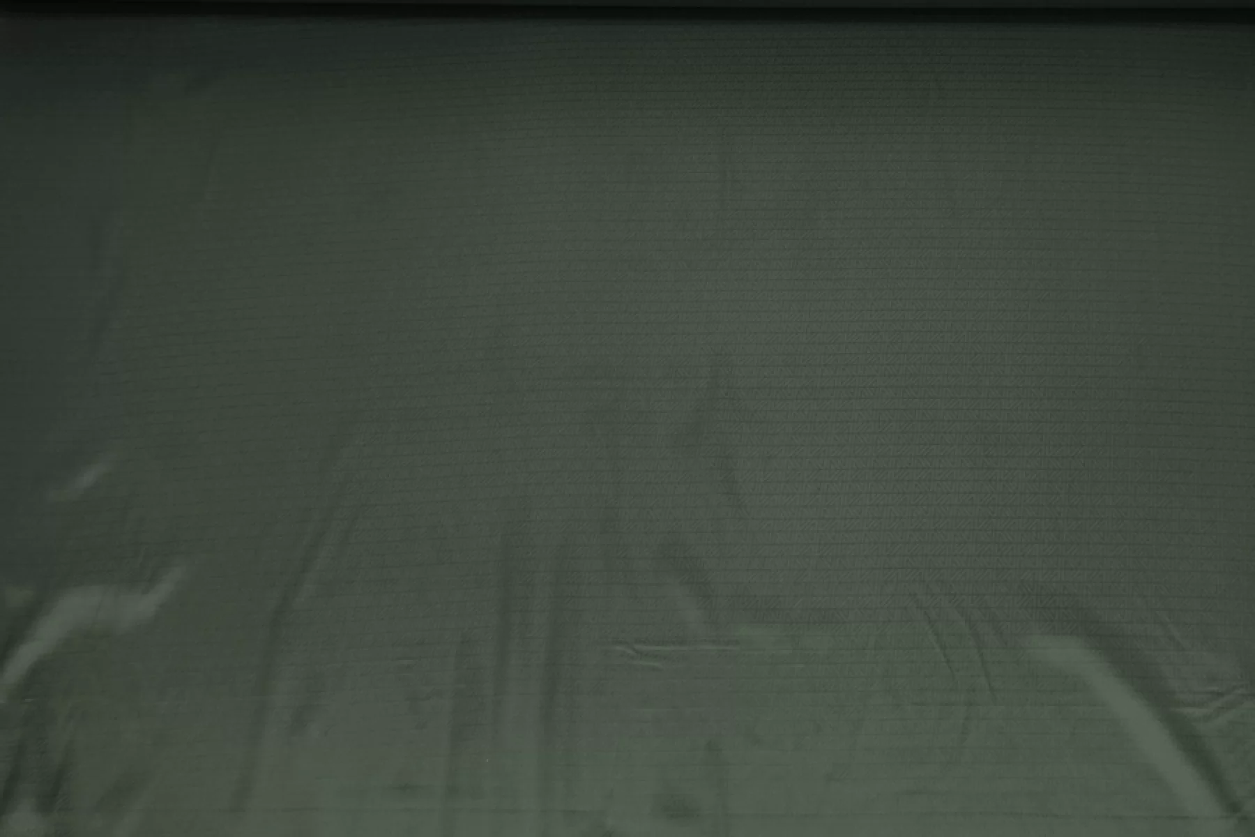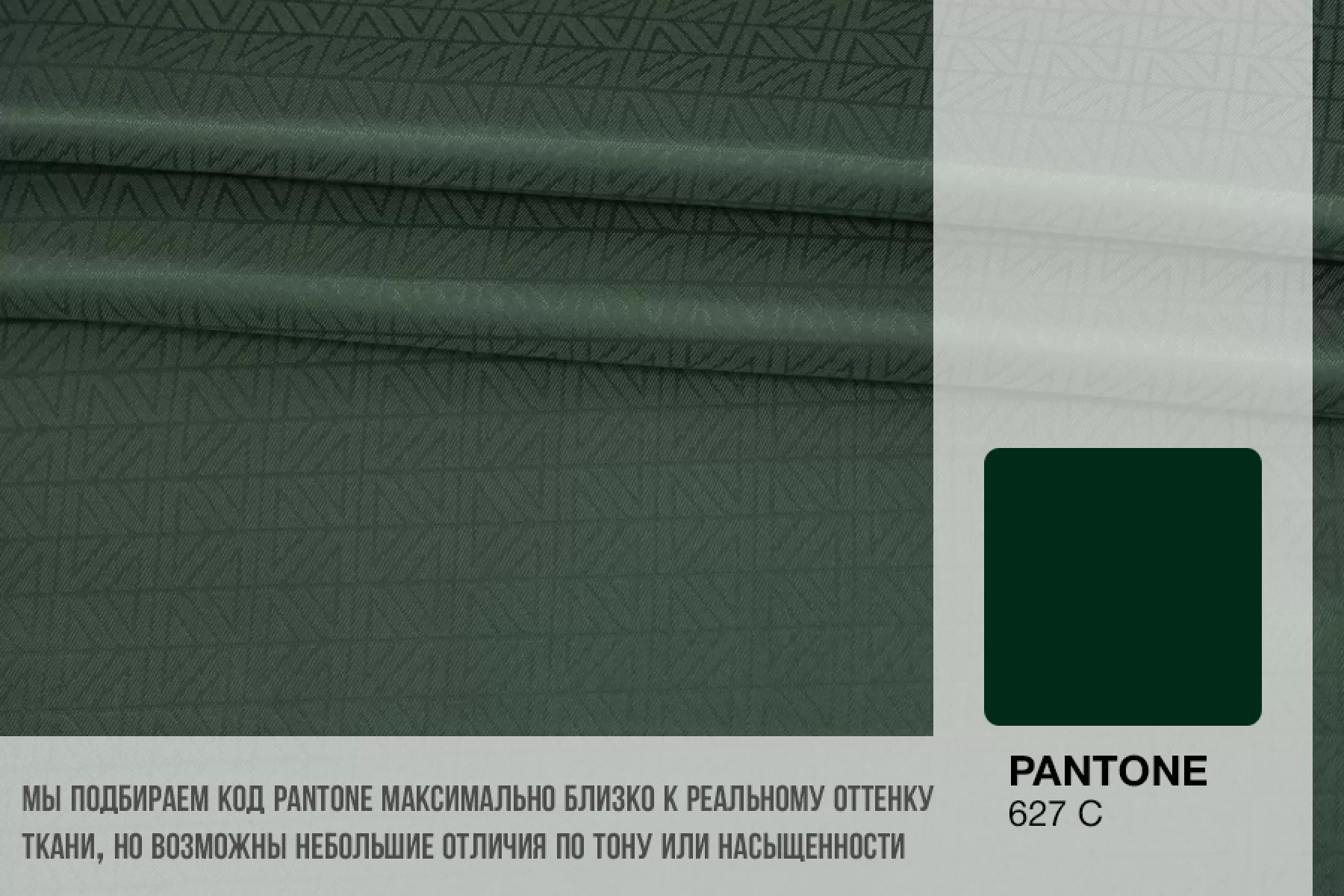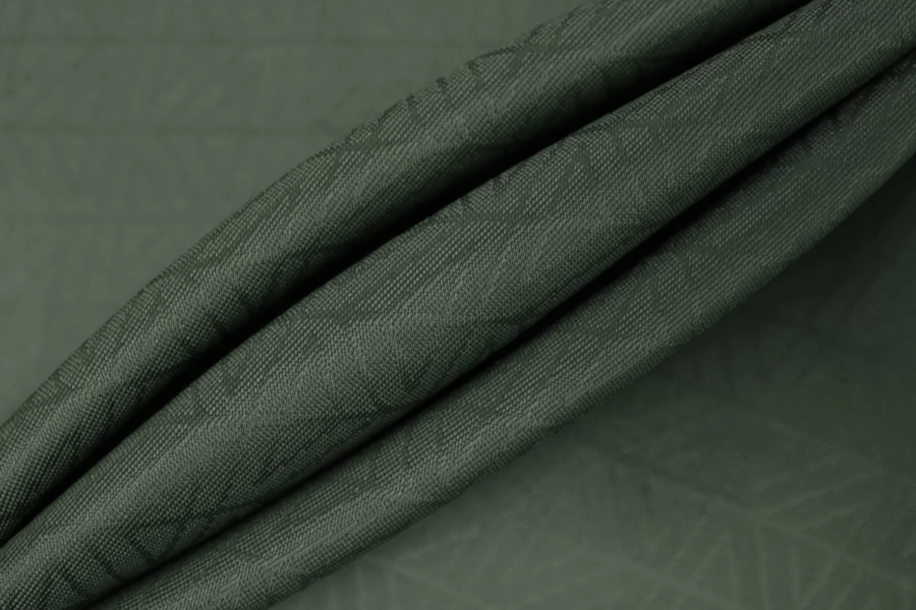 Жаккардовая подкладочная вискоза стрейч с геометрической выработкой в темно-зеленом оттенке. Тактильно мягкая, приятная, слегка суховатая. Обладает красивым шелковистым лоском. Немного тянется за счет эластана. Просвечивает силуэт. Мнется. Форму практически не держит. Вариант на подкладочный материал к костюмно-плательной группе. Обязательно учитывайте возможную усадку 5-10%