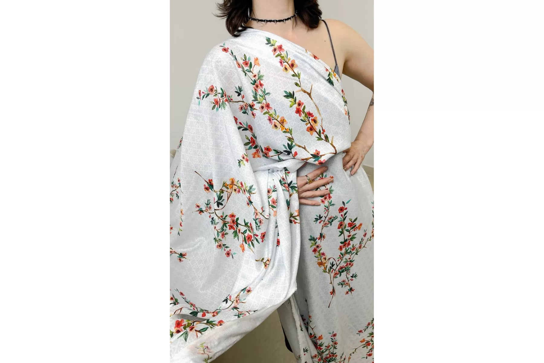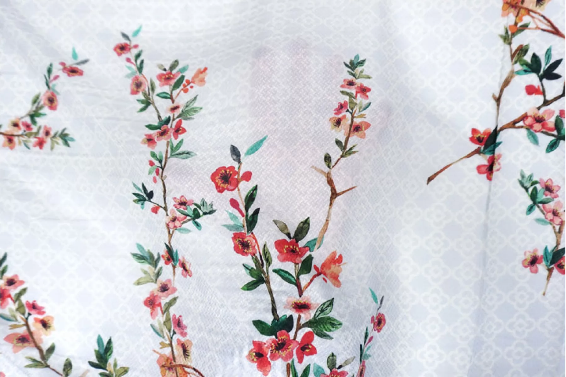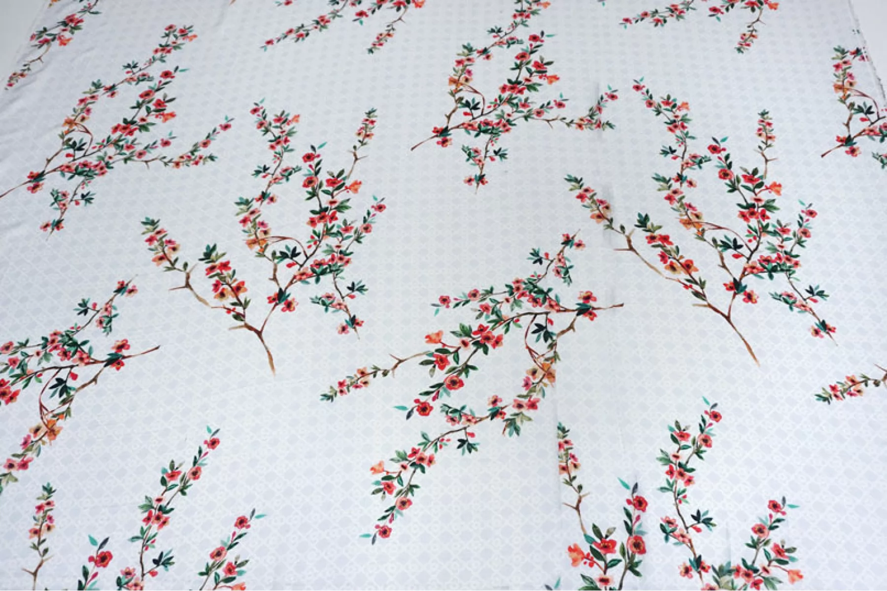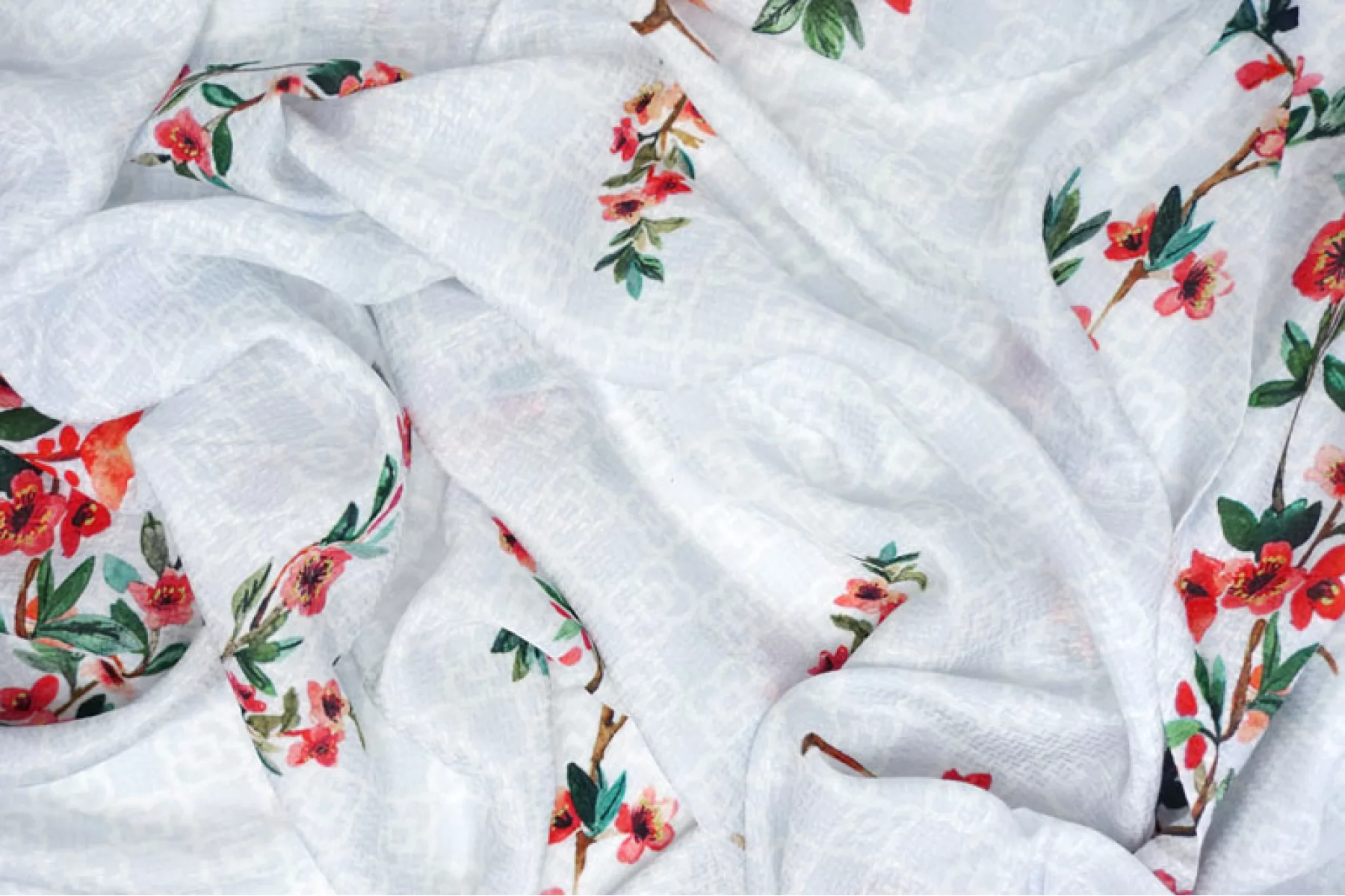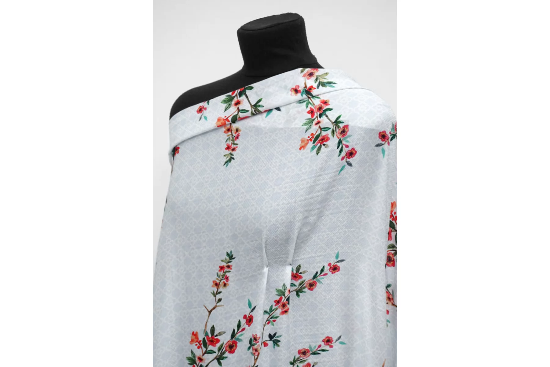 Жаккардовая вискоза с принтом ярких веточек с цветами на белом с голубым узором фоне бренда HUGO BOSS. Очень мягкая, тактильно приятная. Не тянется. Немного просвечивает силуэт. Красиво струится и смотрится в своей пластике. Не держит форму. Прекрасный вариант на летние платья, блузки, юбки и изделия в бельевом стиле. При необходимости используйте подкладочный материал. Обязательно учитывайте усадку.
