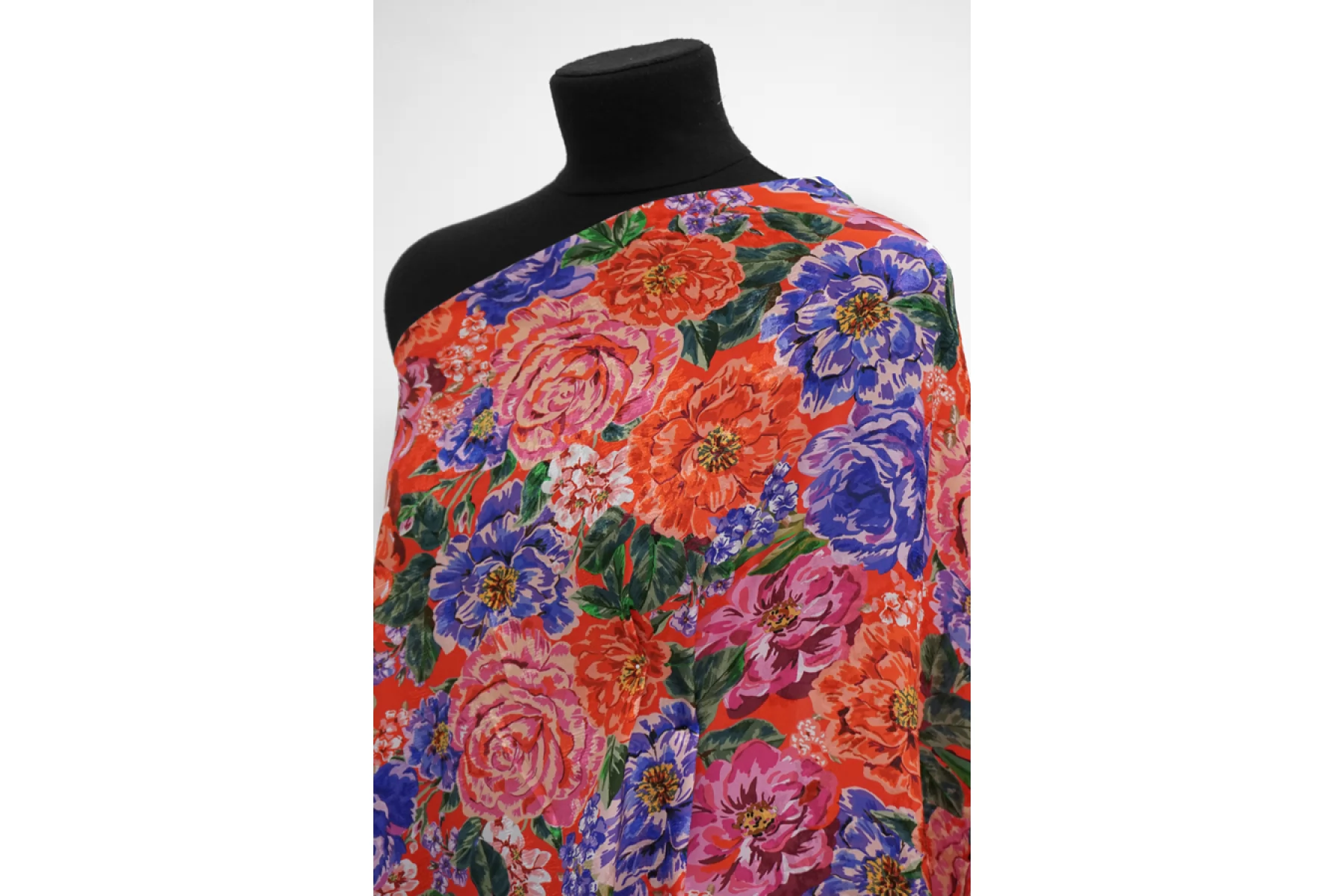 Плательная вискоза приятного красного оттенка с цветочными принтом и выработкой. Рисунок в оттенках синего, сиреневого , зеленого, кораллового и розового. Смотрится очень красиво! Материал очень мягкий, скользящий и приятный. Форму держит совсем немного и практически не мнется. Слегка читается силуэт, если смотреть прямо на просвет. Не тянется. Вариант на платья, блузки, юбки и изделия в бельевом стиле. Обязательно учитывайте усадку 5-10% .