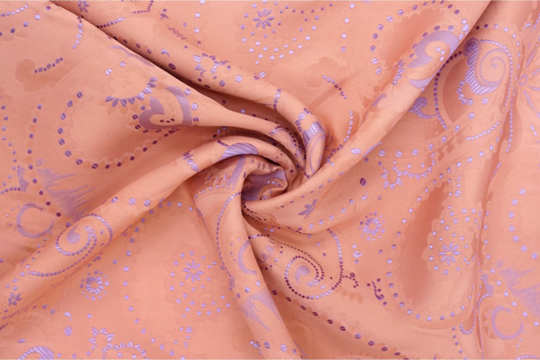 Прекрасная плательная вискоза от GUCCI с жаккардовой выработкой орнамента напоминающего цветы. Основной цвет - матовый припыленно-персиковый, с добавлением лиловых переливающихся нитей. Материал мягкий, чувствуется фактура жаккардовая. Немного держит форму. Плотная, не просвечивает. Довольно тяжеленькая. Не тянется. Идеально подходит на платья, блузки, юбки. Обязательно учитывайте усадку 5-10% . При необходимости используйте подкладочный материал