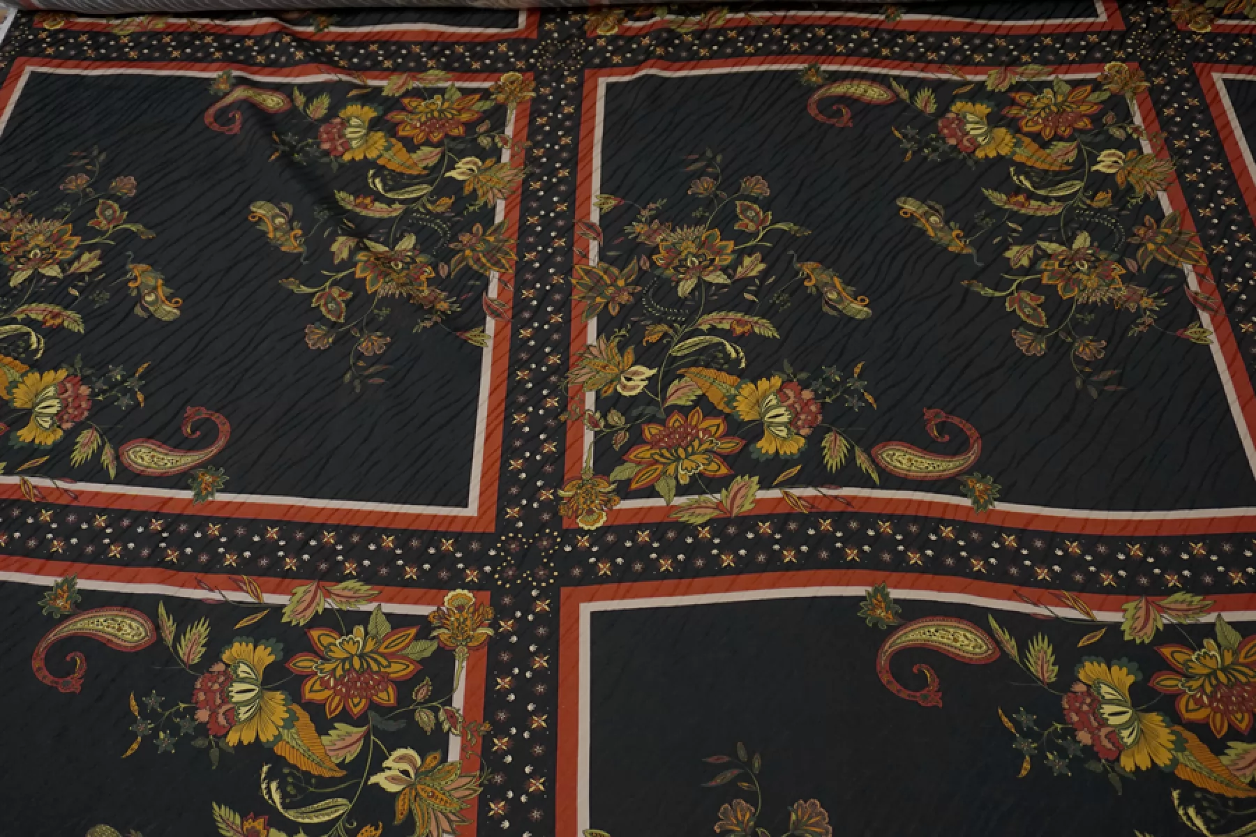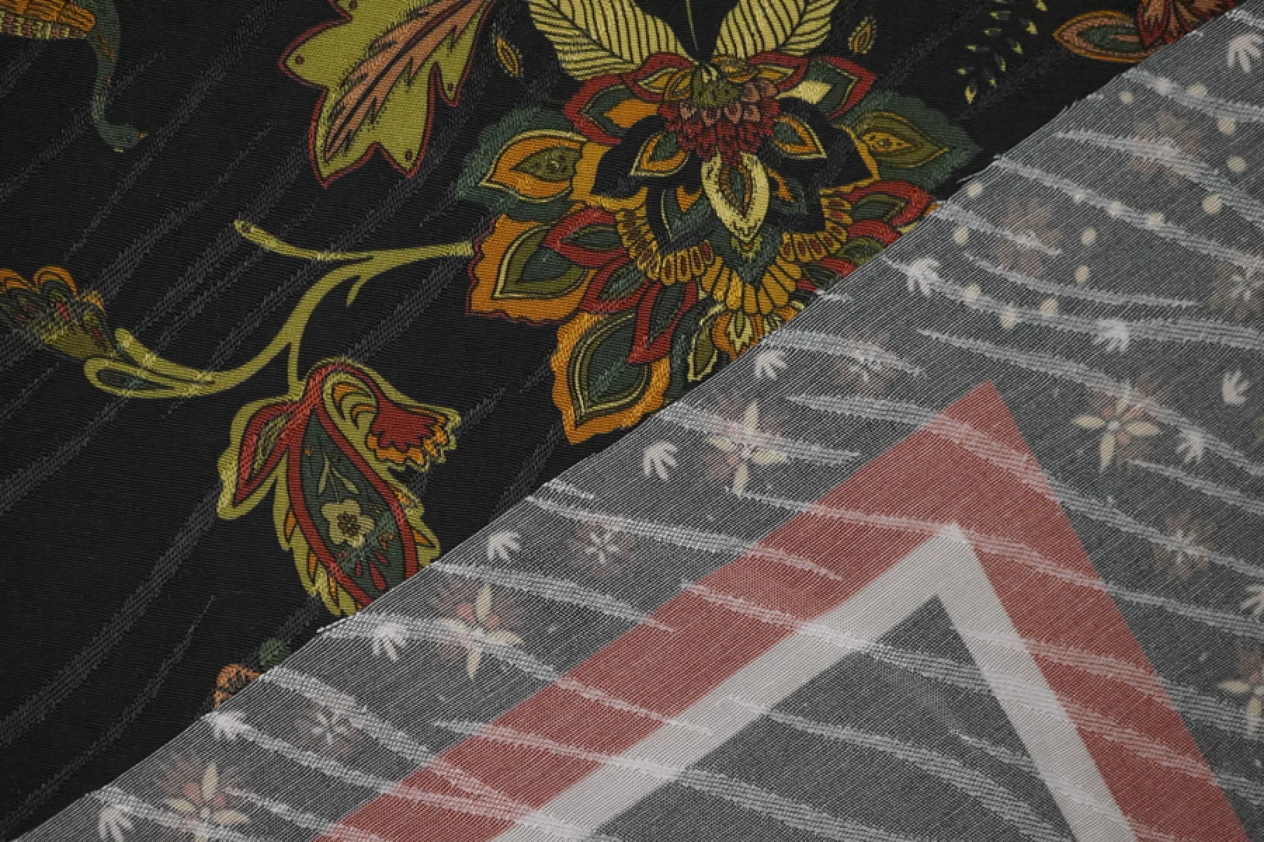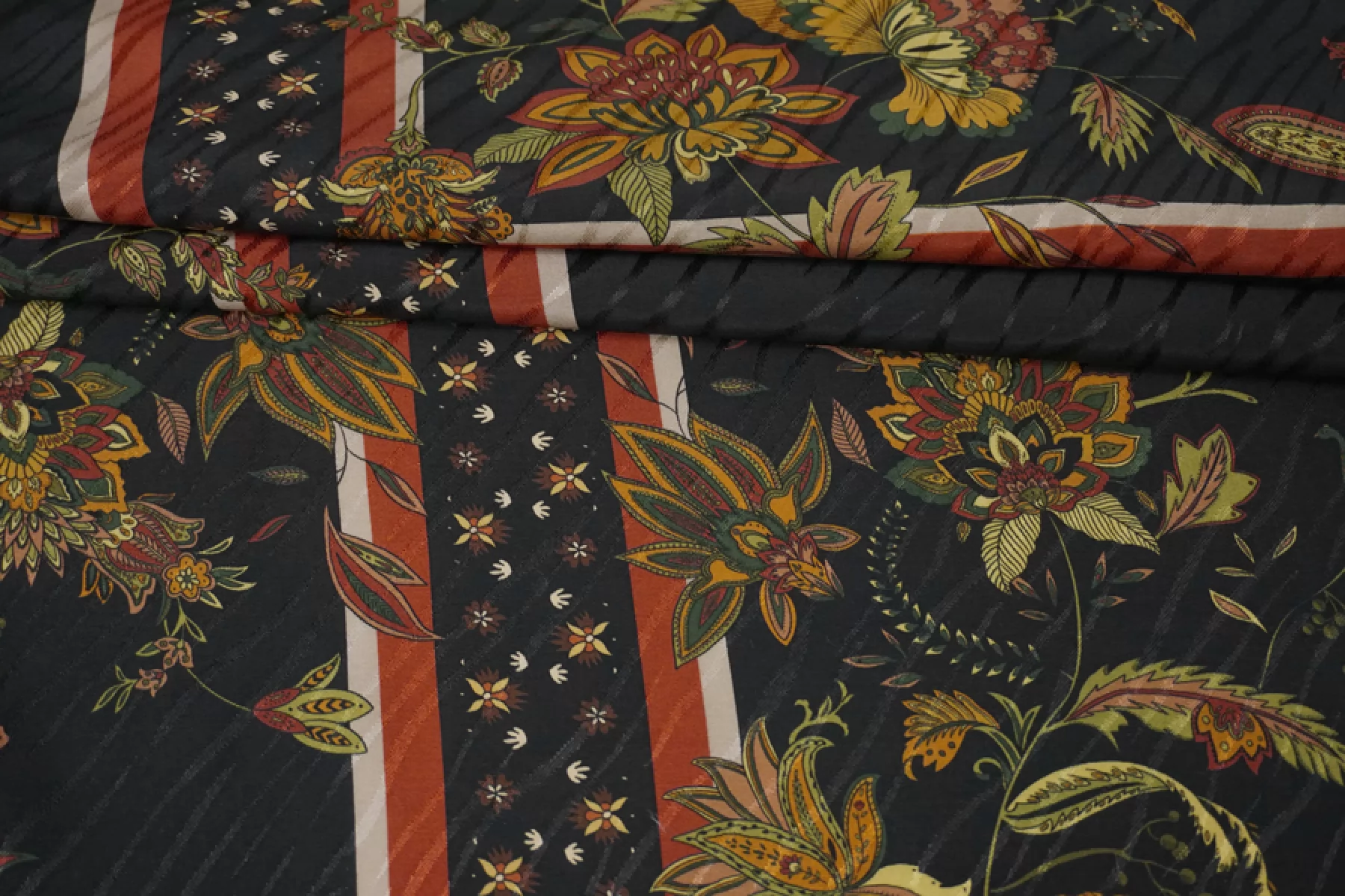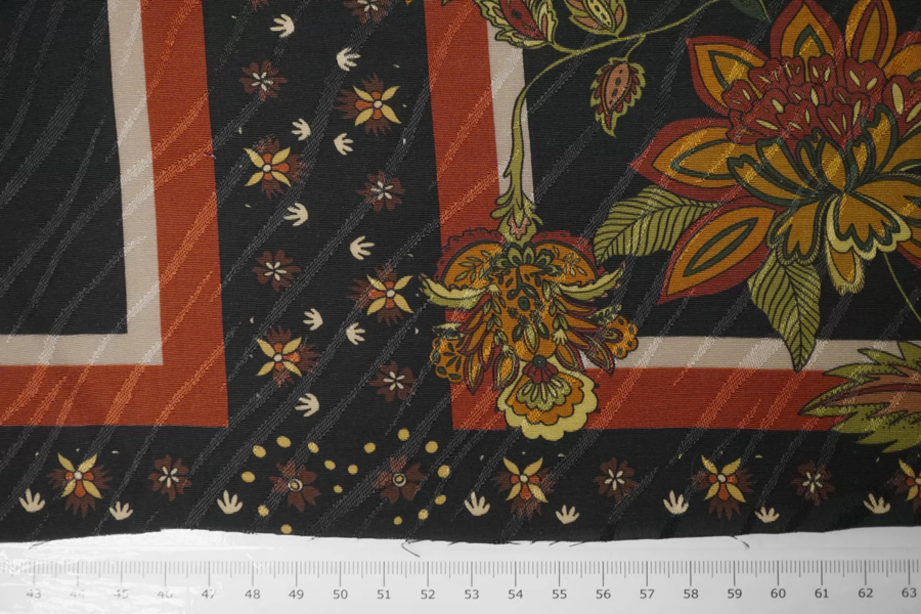 ВНИМАНИЕ! Ткань купонная, длина купона 56 см, цена за купон - 946 руб. Вискоза в платочном стиле, включает в себя 2 полных "платка", с жаккардовой выработкой диагоналей. Основа материала в черном оттенке и узор, который представляет собой принт в виде огурцов и цветов, в оттенках зеленого, терракотового и горчичного. Тактильно приятная, с красивой пластикой. Просвечивает силуэт, если смотреть прямо на просвет. Не тянется. Слегка держит форму. Прекрасный вариант на платки, платья, блузки и юбки в платочном стиле. Обязательно учитывайте возможную усадку порядка 5-10%