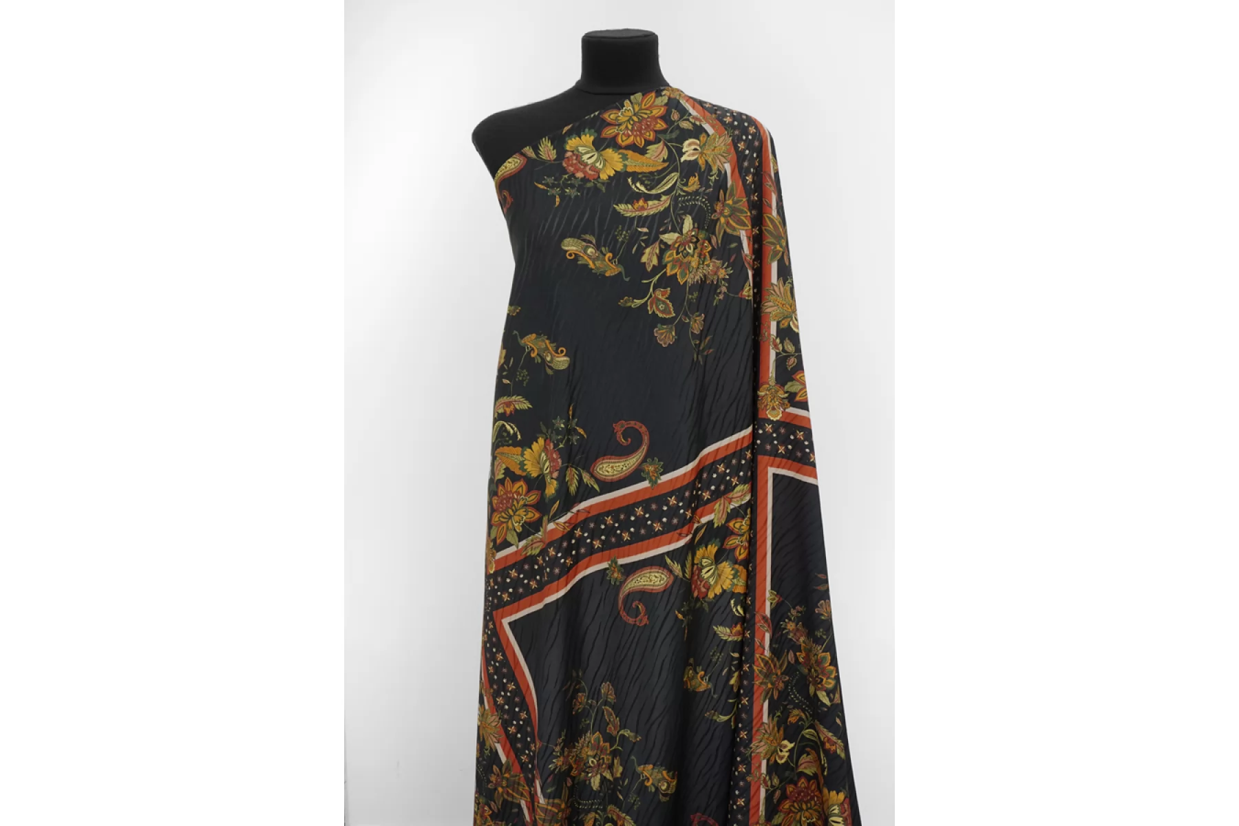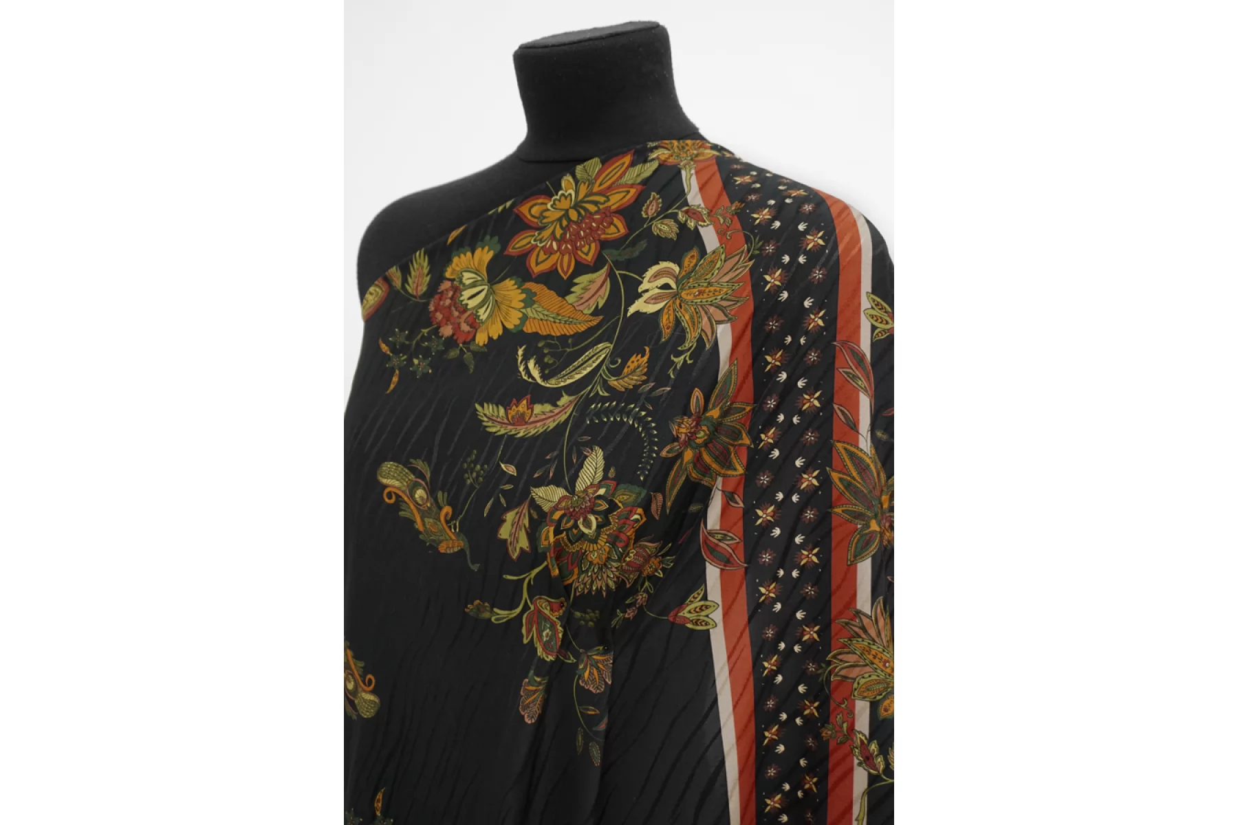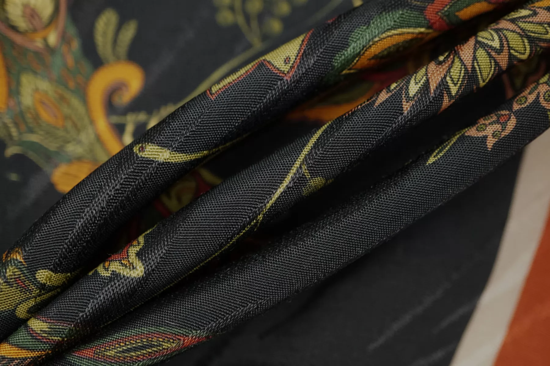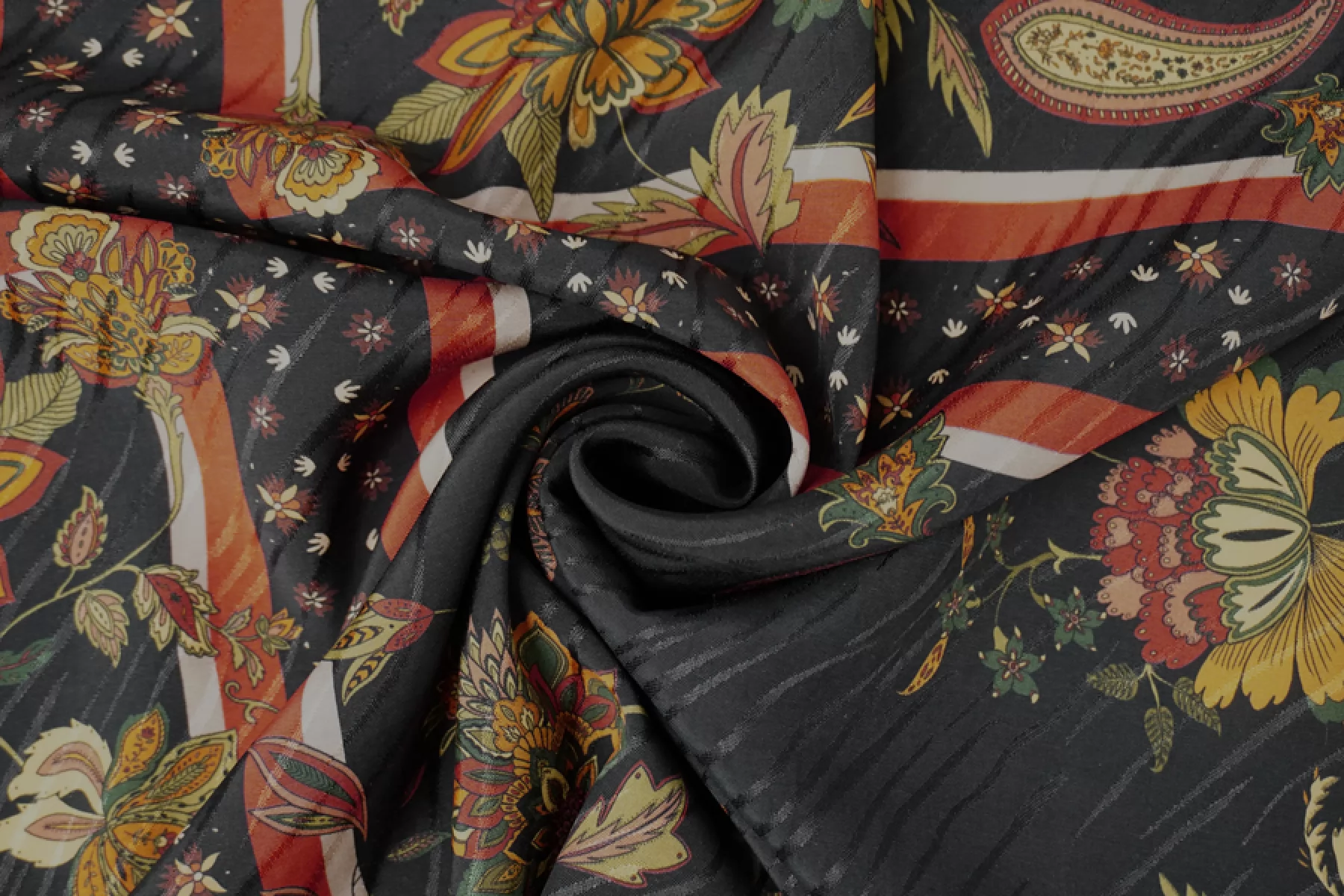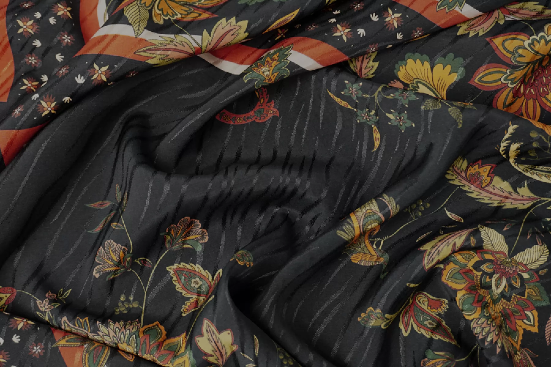 ВНИМАНИЕ! Ткань купонная, длина купона 56 см, цена за купон - 946 руб. Вискоза в платочном стиле, включает в себя 2 полных "платка", с жаккардовой выработкой диагоналей. Основа материала в черном оттенке и узор, который представляет собой принт в виде огурцов и цветов, в оттенках зеленого, терракотового и горчичного. Тактильно приятная, с красивой пластикой. Просвечивает силуэт, если смотреть прямо на просвет. Не тянется. Слегка держит форму. Прекрасный вариант на платки, платья, блузки и юбки в платочном стиле. Обязательно учитывайте возможную усадку порядка 5-10%