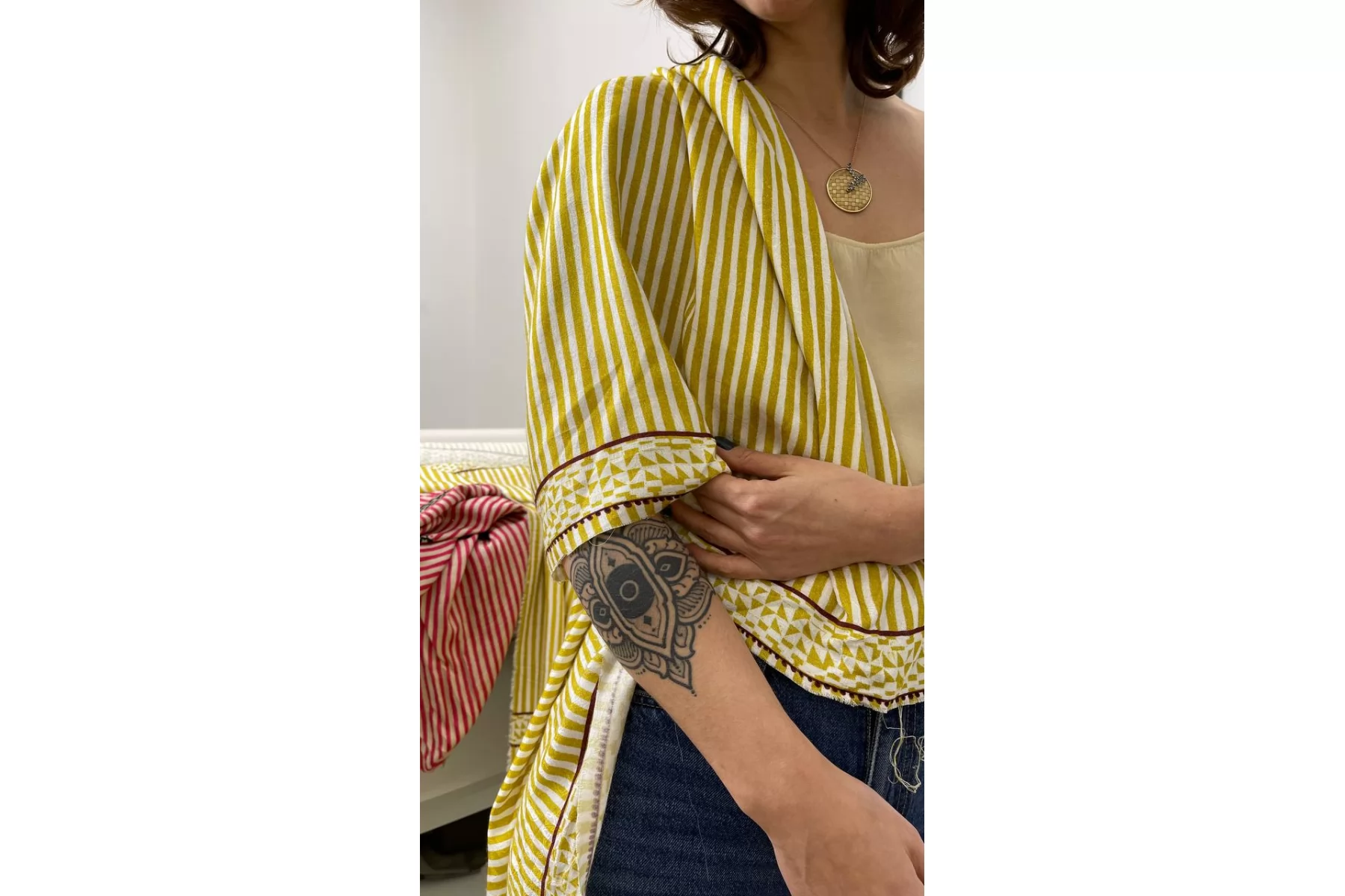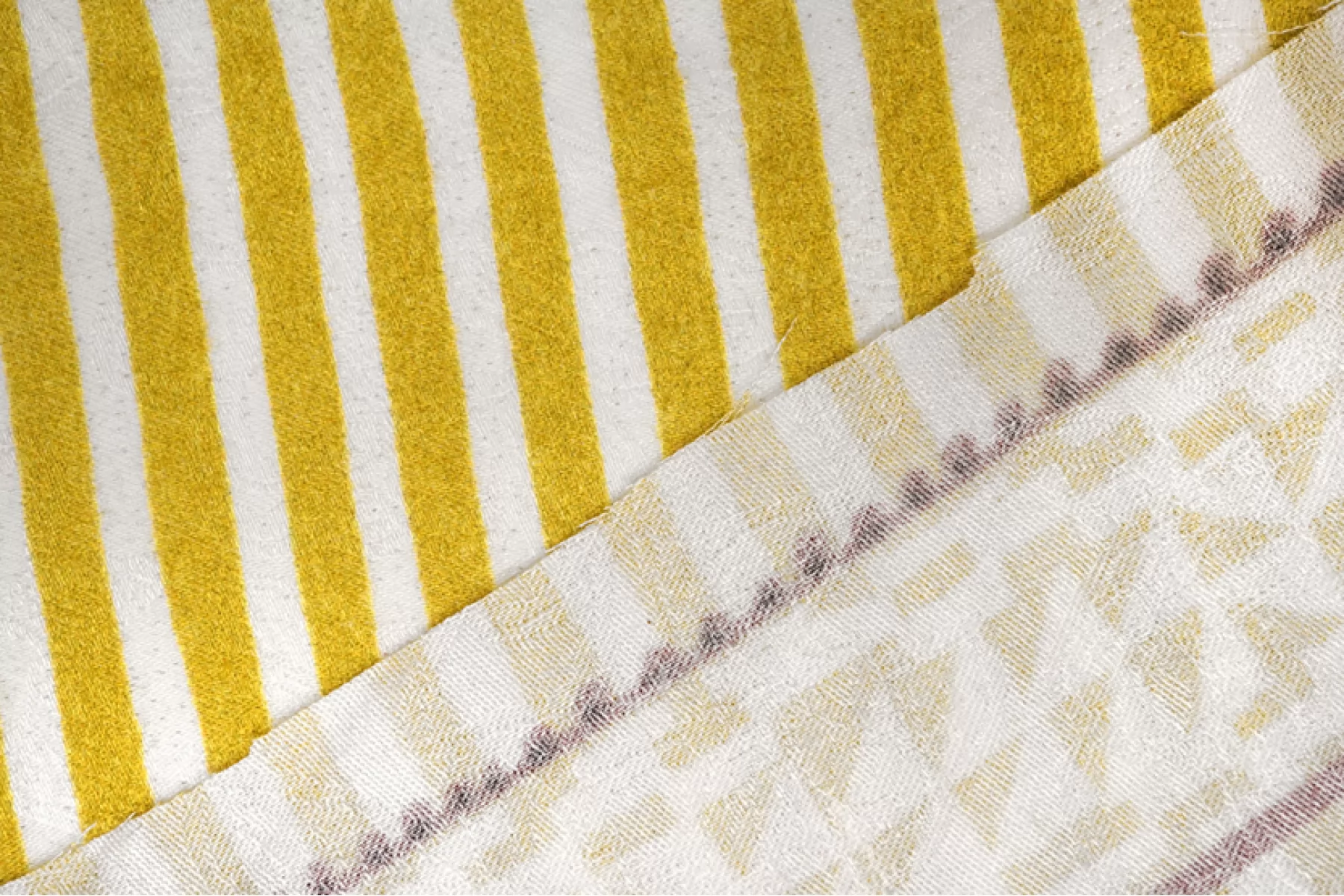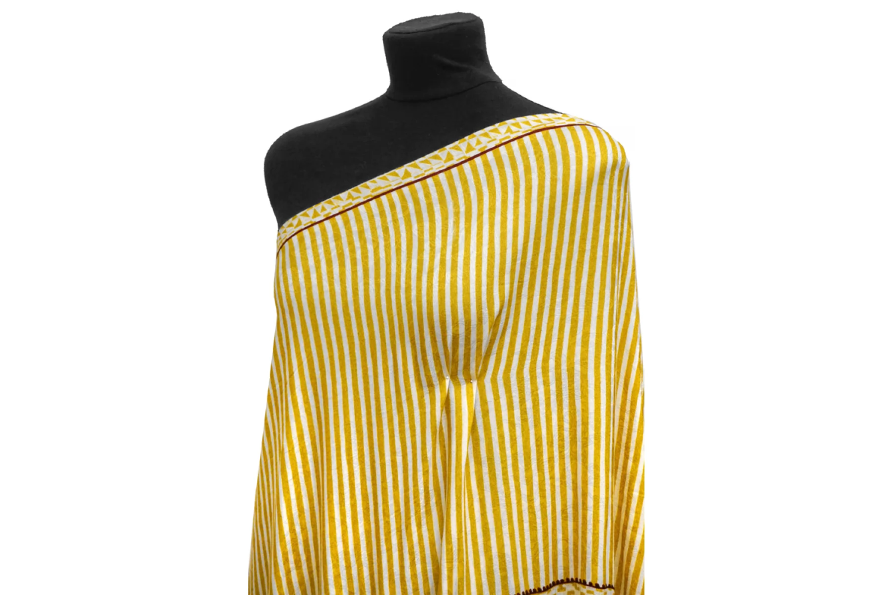 ВНИМАНИЕ! Ткань купонная, длина купона 46 см, цена за купон - 635 руб. Классная плательно-блузочная вискоза с жаккардовой цветочной выработкой по всему полотну с геометричным и в полоску принтом в оттенках молочного, горчичного (уходящий в горчично-зеленый) и темно-винного оттенков . Тактильно приятная, очень мягкая и пластичная. Практически не просвечивает, но может быть заметен силуэт темного на просвет. Не тянется. Форму не держит. Шьем платья, блузки, юбки, а также одежду в пижамном стиле. Обязательно учитывайте возможную усадку порядка 5-10%
