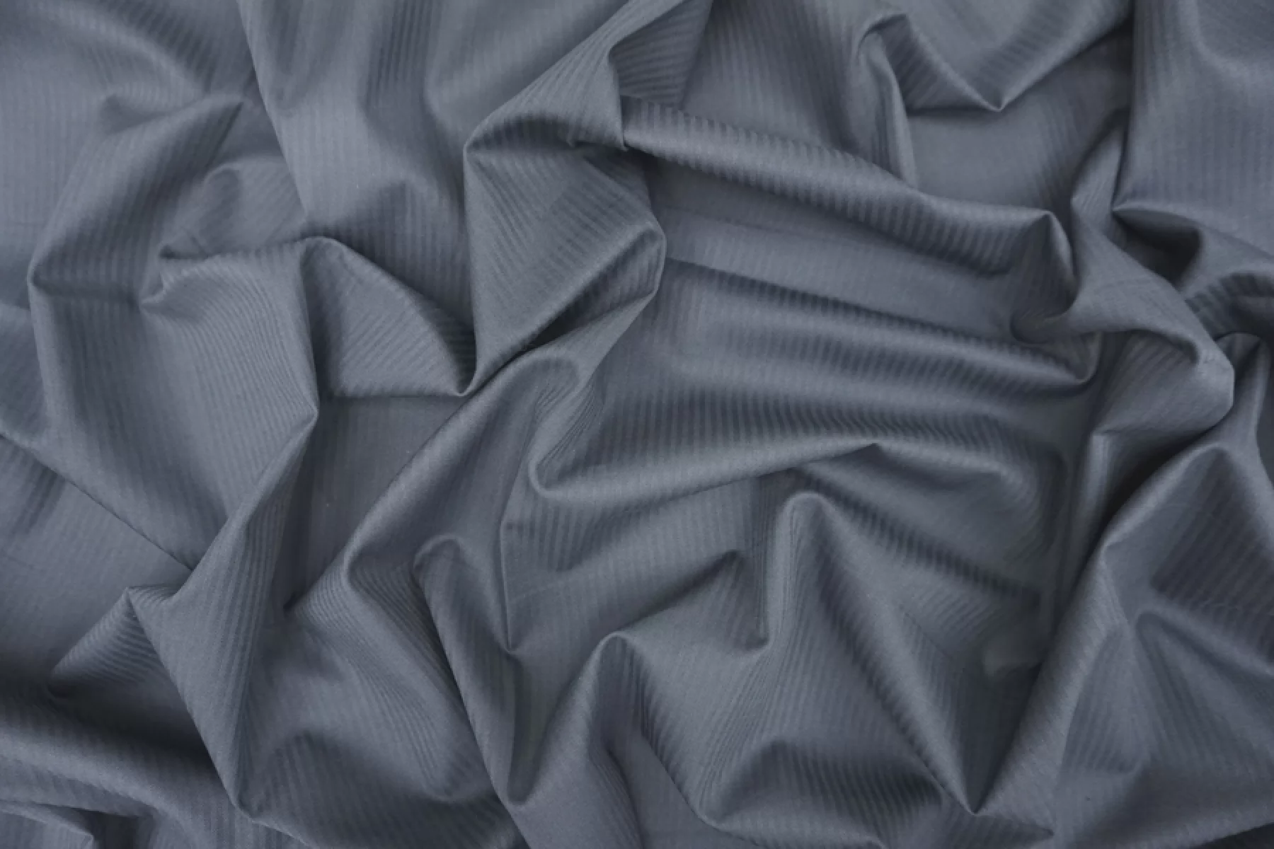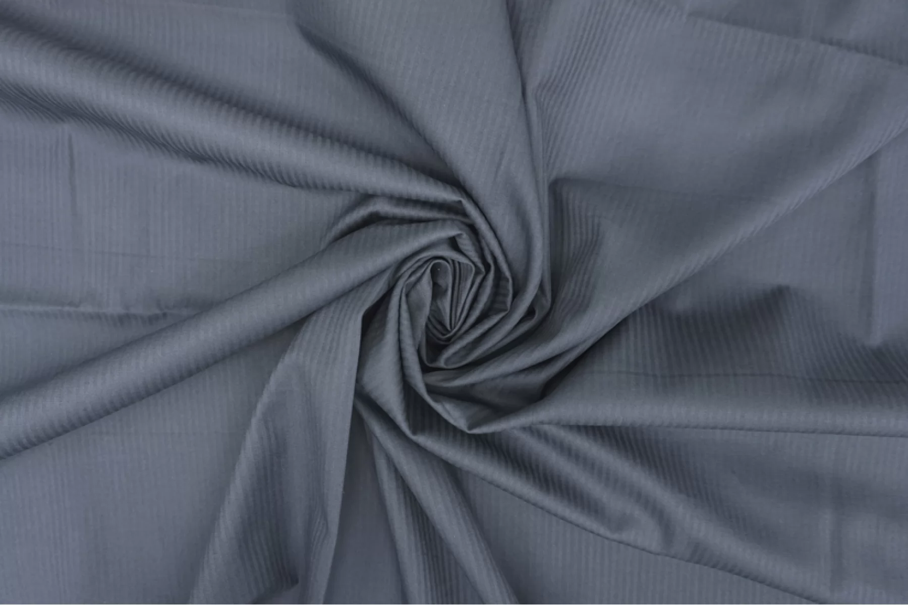 Итальянский рубашечно-плательный хлопок жаккардового плетения интересного дымчато-синего оттенка. Плетение образуют полоски шириной 2 мм. Материал обладает красивым лоском. Выглядит дорого. Тонкий, пластичный, легкий. Тактильно очень приятный, мягкий. Красиво смотрится в складке. Немного держит форму. Слегка виден силуэт если смотреть на просвет. Подойдет для пошива платья, рубашки, юбки, сарафана.