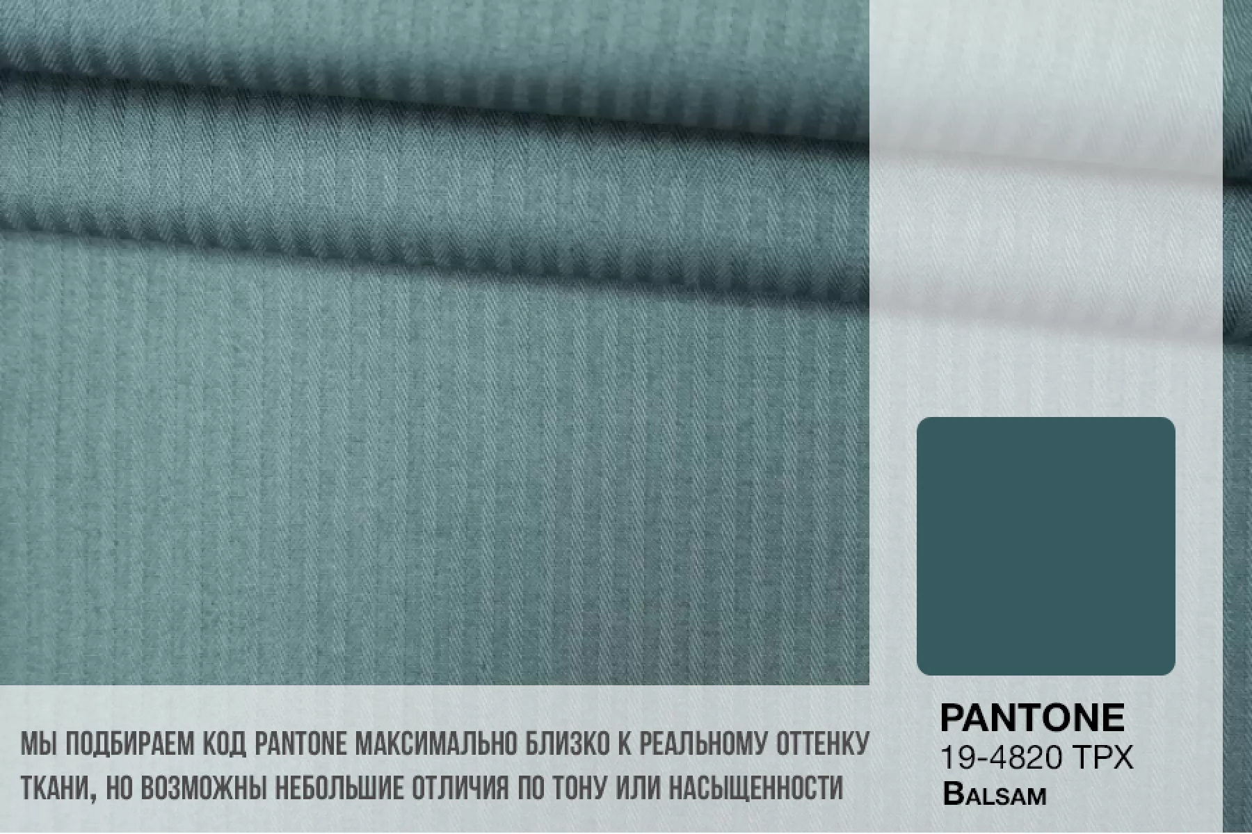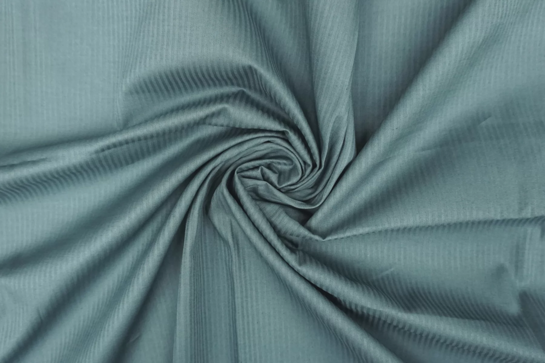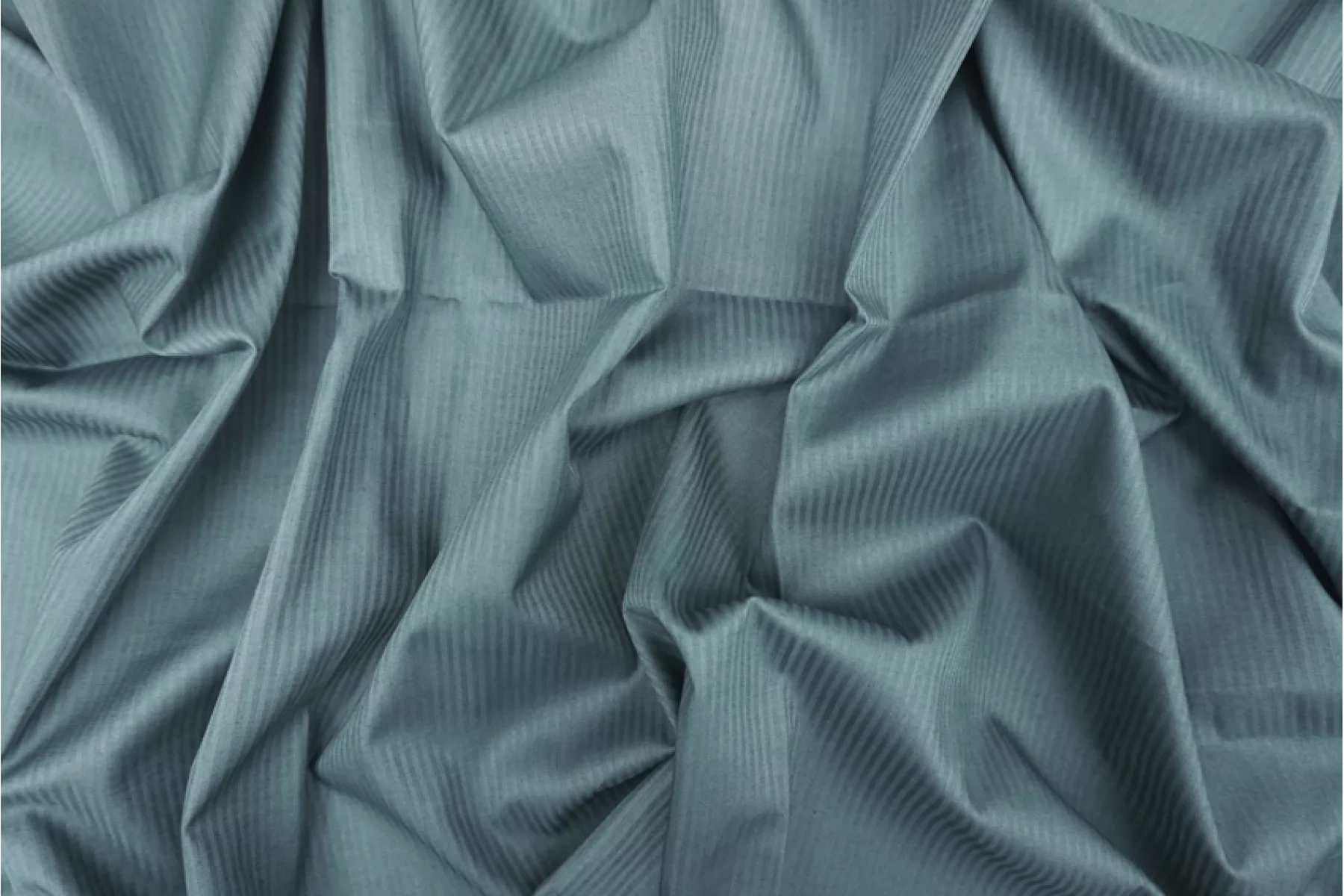 Итальянский рубашечно-плательный хлопок жаккардового плетения сложного припыленно-сине-зеленого оттенка. Плетение образуют полоски шириной 2 мм. Материал обладает красивым лоском. Выглядит дорого. Тонкий, пластичный, легкий. Тактильно очень приятный, слегка жестковат. Красиво смотрится в складке. Неплохо держит форму. Слегка виден силуэт если смотреть на просвет. Подойдет для пошива платья, рубашки, юбки, сарафана.