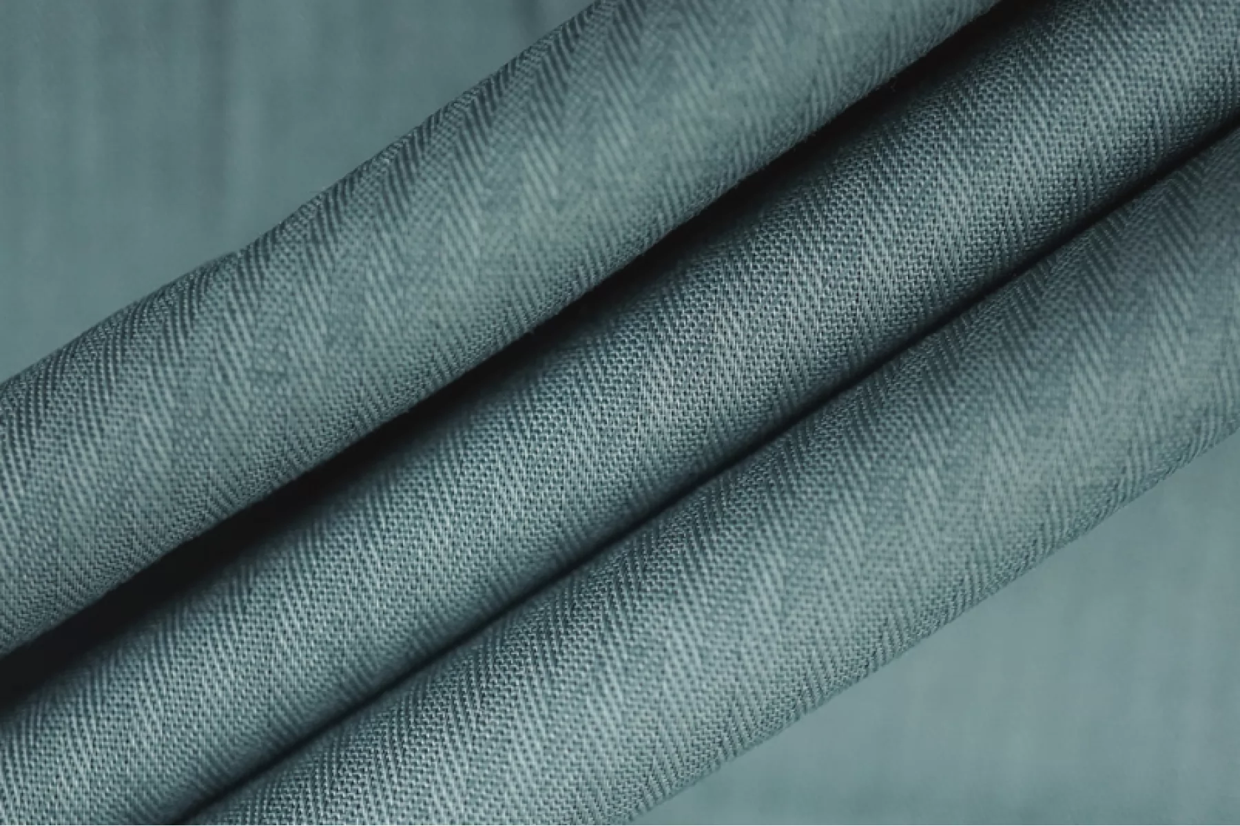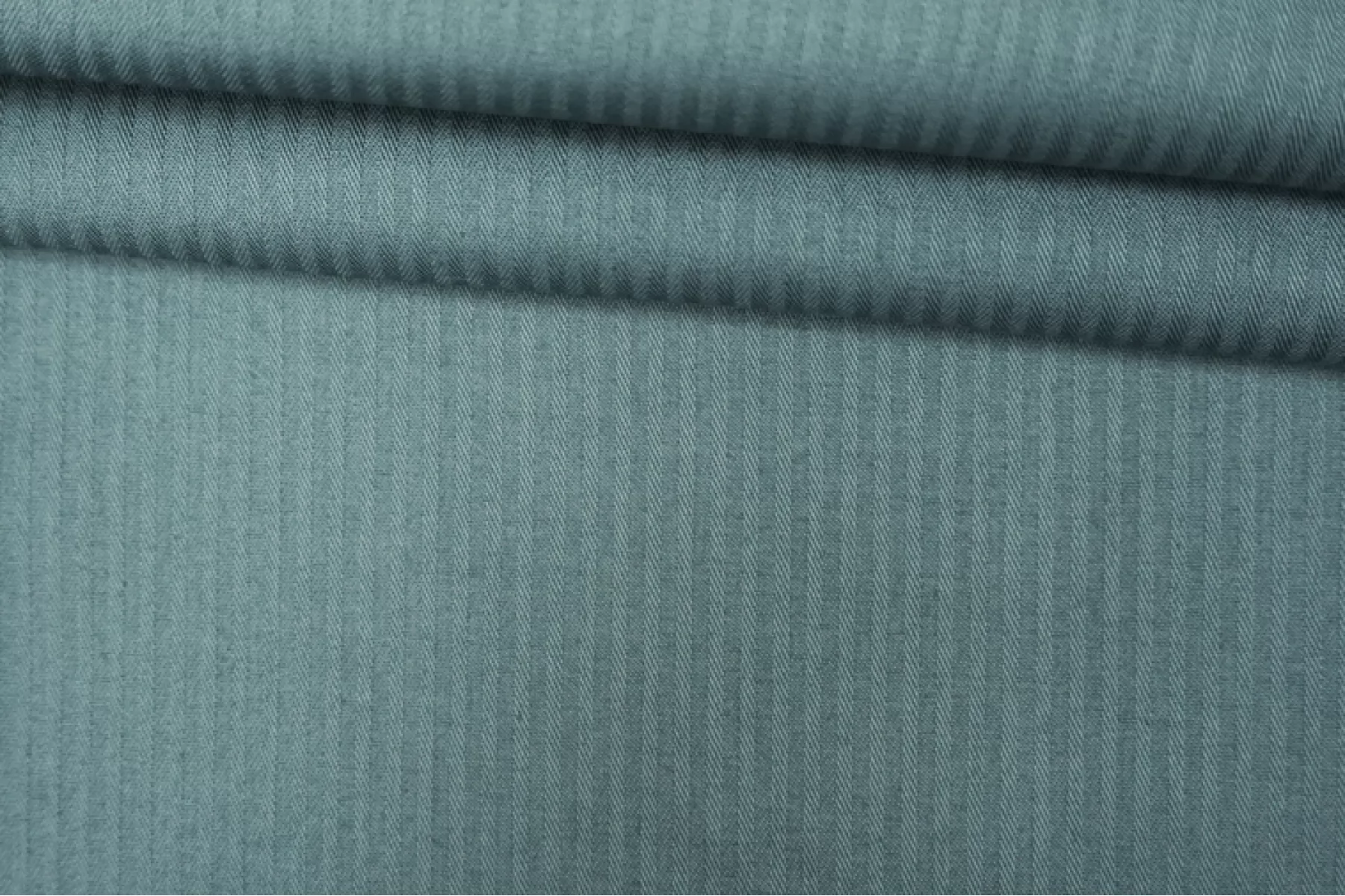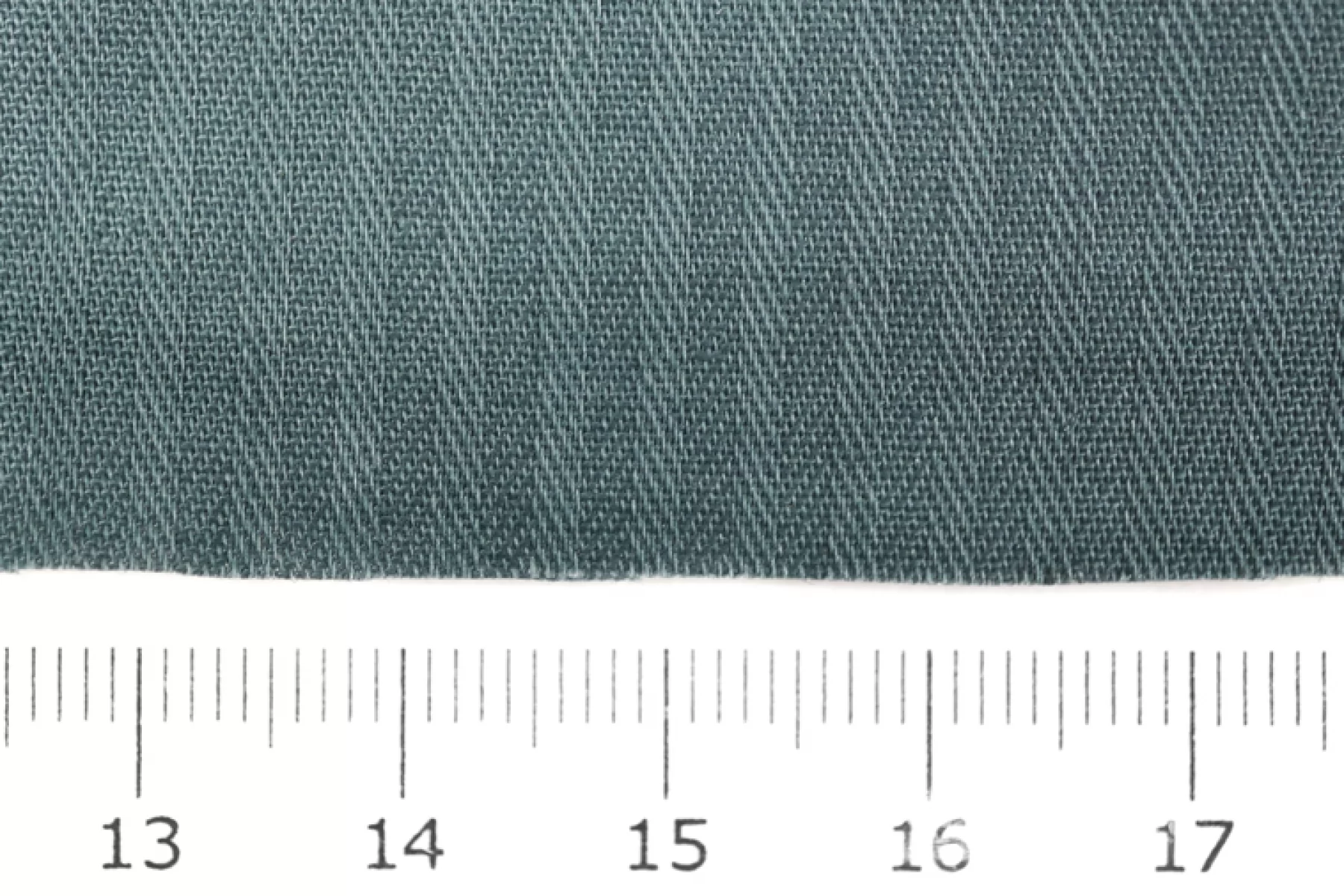 Итальянский рубашечно-плательный хлопок жаккардового плетения сложного припыленно-сине-зеленого оттенка. Плетение образуют полоски шириной 2 мм. Материал обладает красивым лоском. Выглядит дорого. Тонкий, пластичный, легкий. Тактильно очень приятный, слегка жестковат. Красиво смотрится в складке. Неплохо держит форму. Слегка виден силуэт если смотреть на просвет. Подойдет для пошива платья, рубашки, юбки, сарафана.