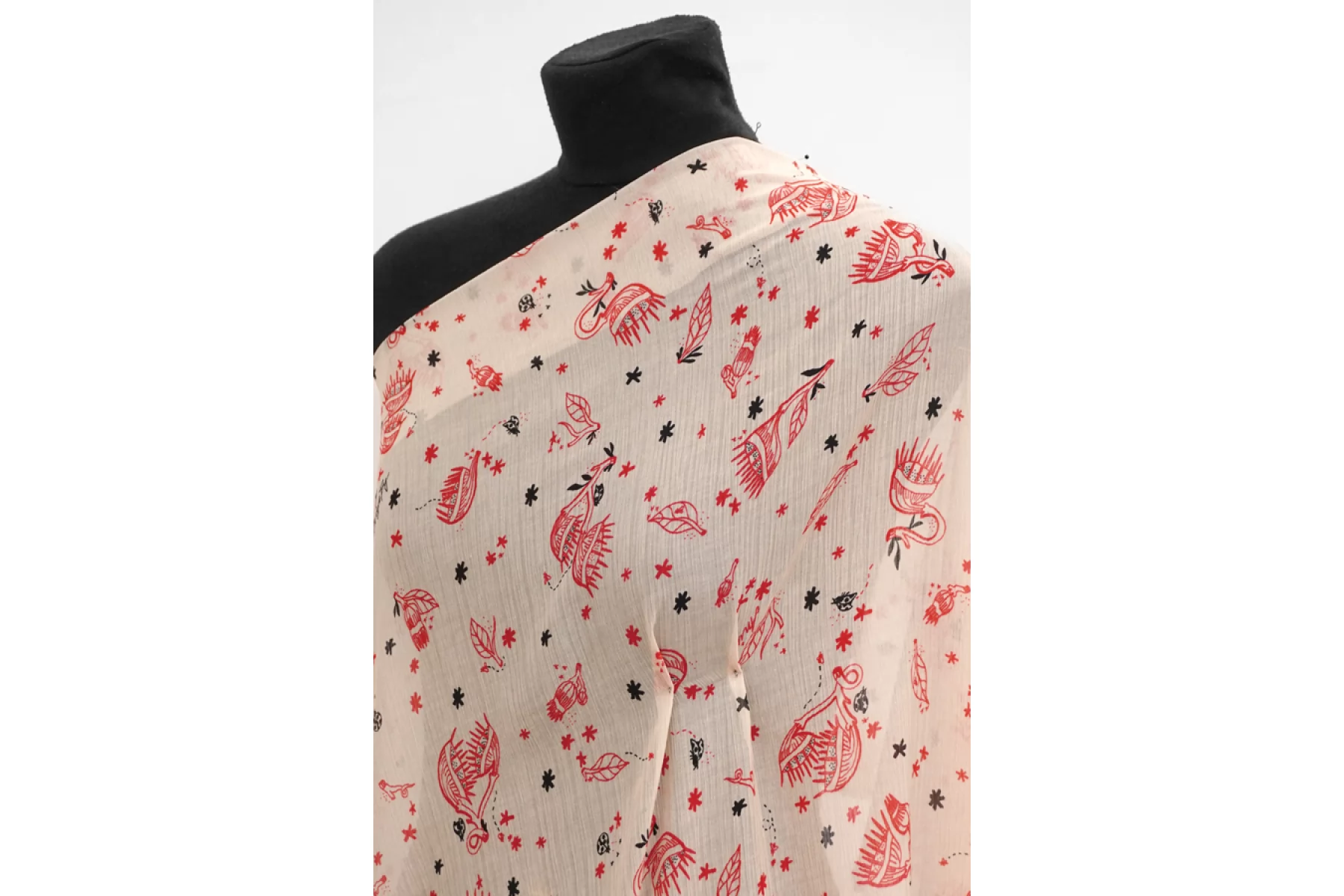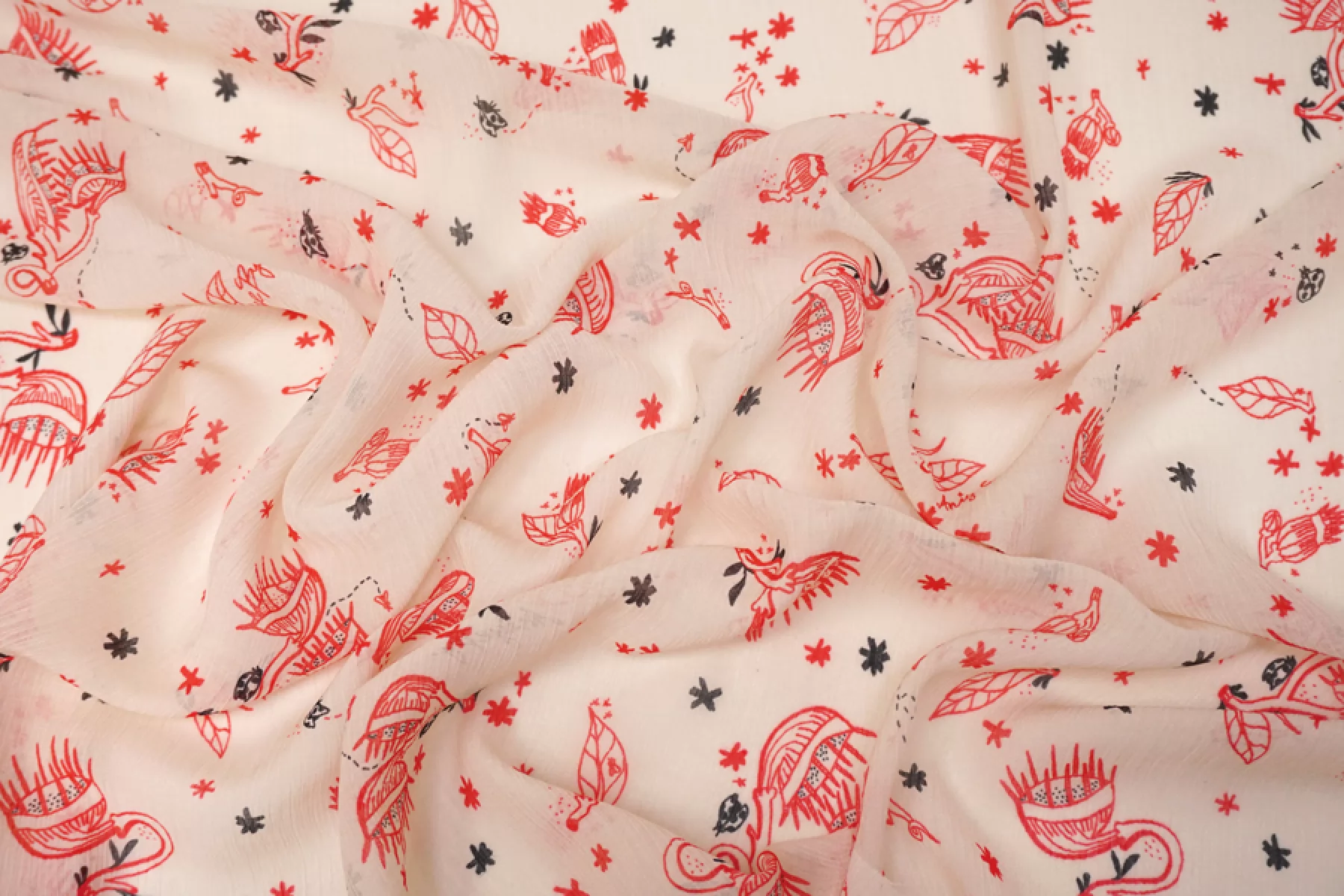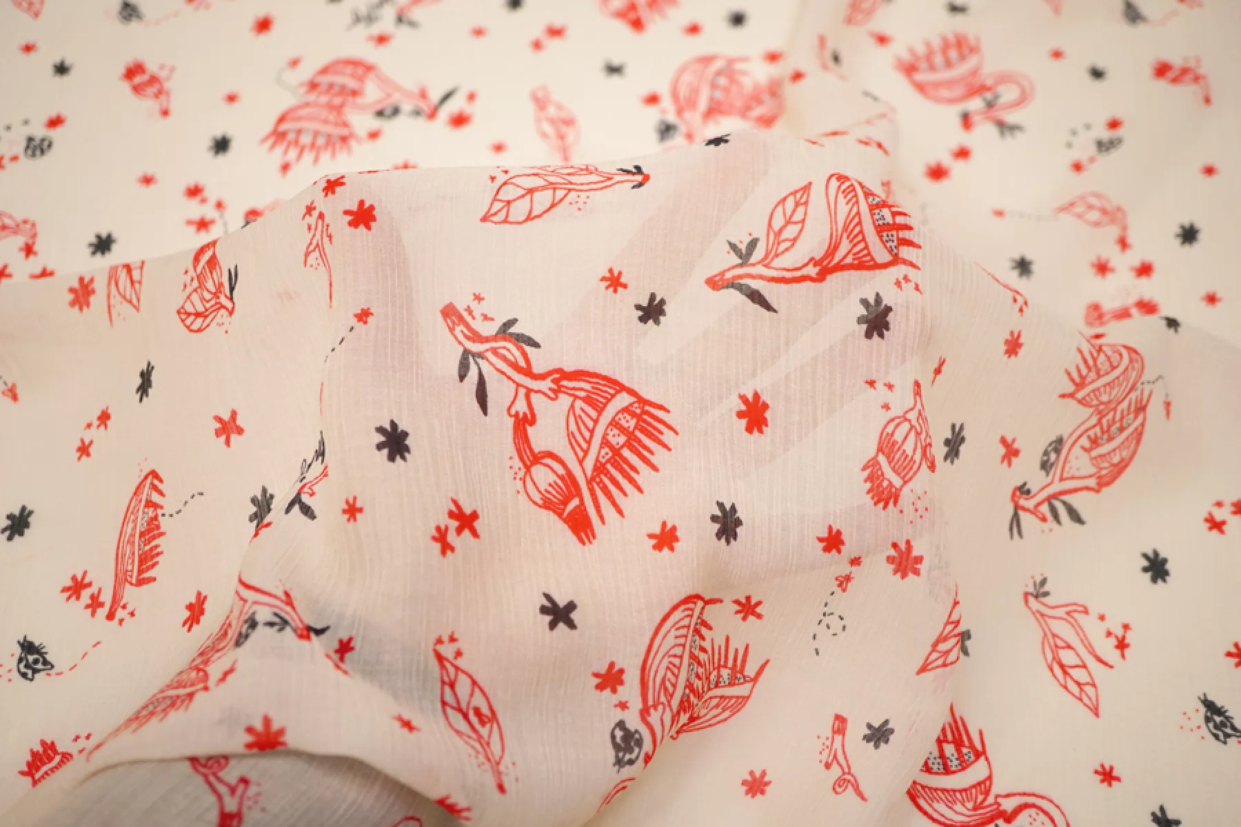 Шикарный жатый шелк с хлопком (похож на креш-шифон), от Aniye By, стилизованный цветочный принт на молочно-бежевом фоне. Тактильно очень мягкий, воздушный, легкий гладкий и приятный, ощущается шелк. Тянется, не мнется. Просвечивает. Форму не держит. Отлично подойдет на свободные рубашки, блузки, многослойные платья или юбки. Уход деликатный, шьем тонкими иглами.
